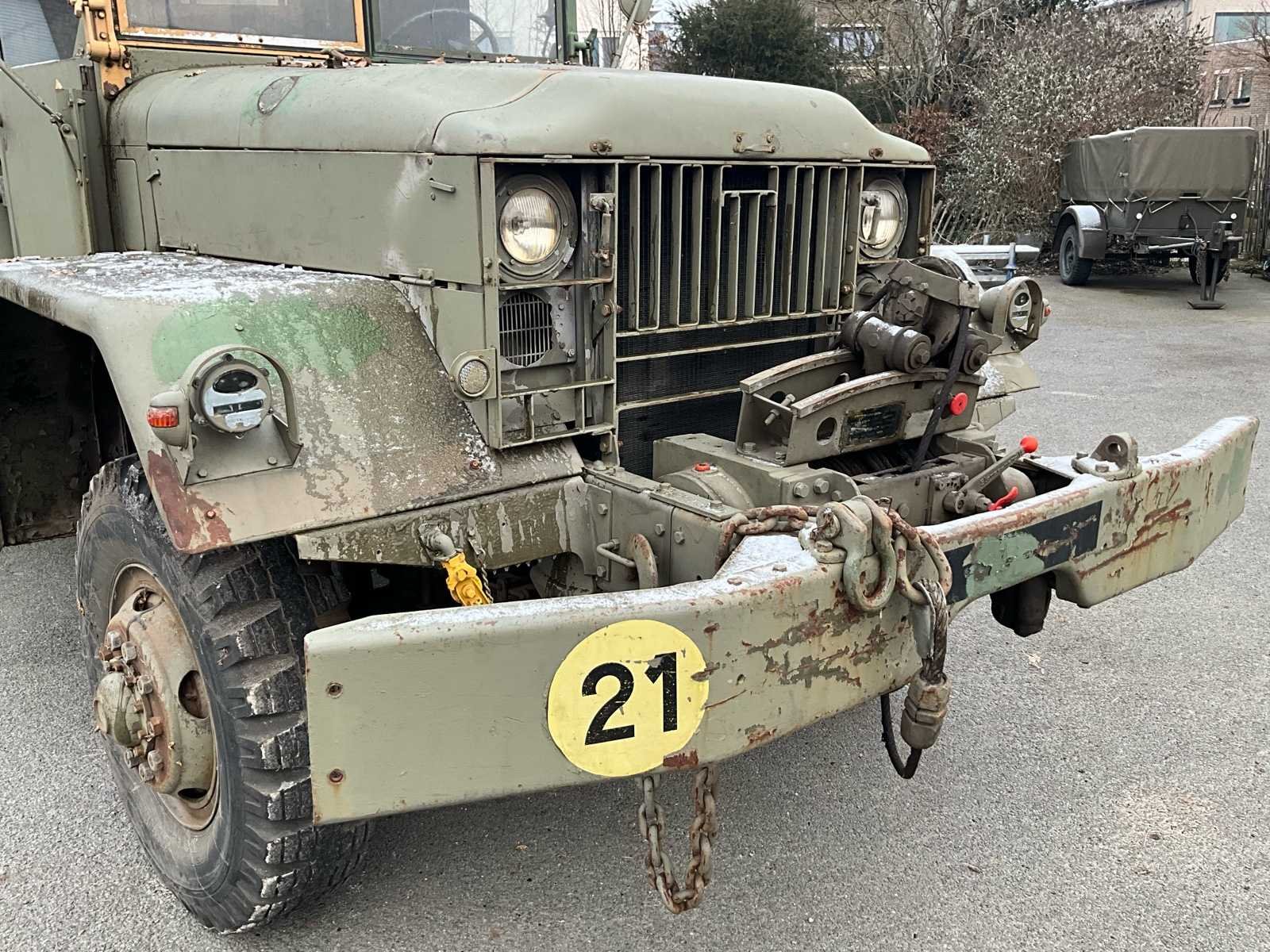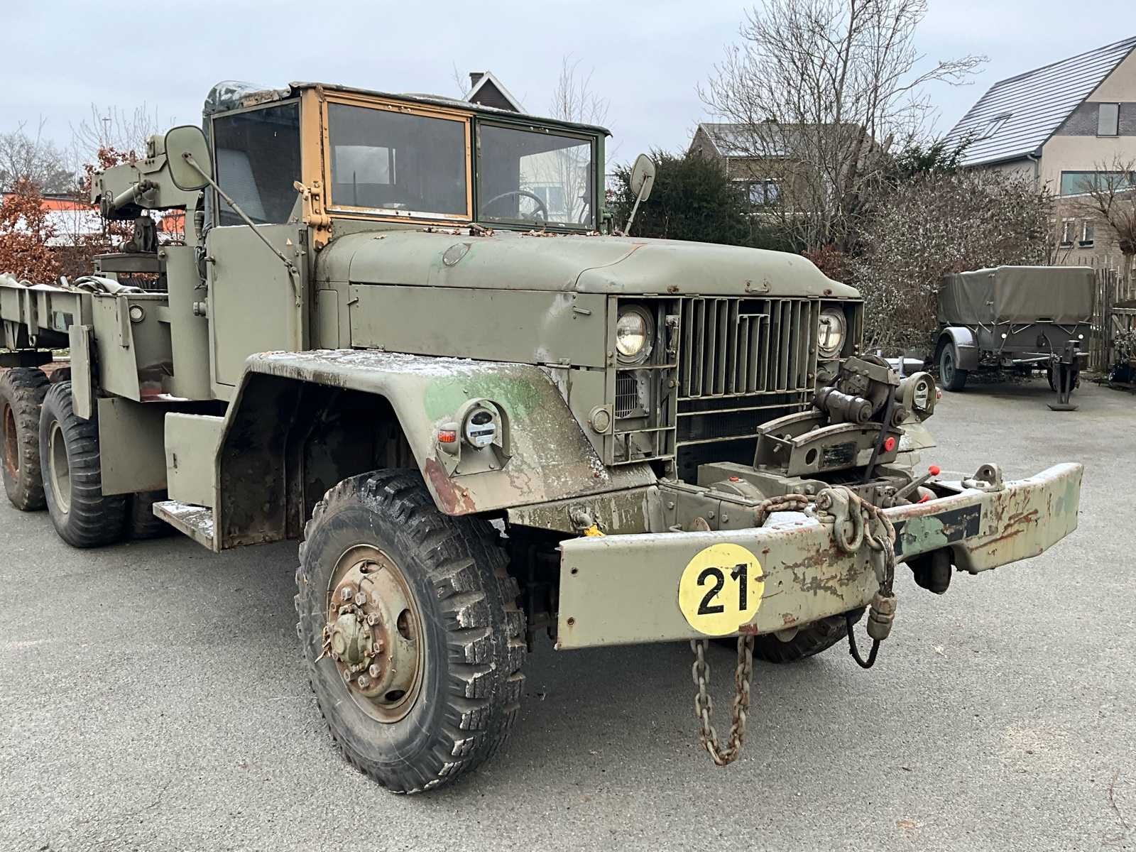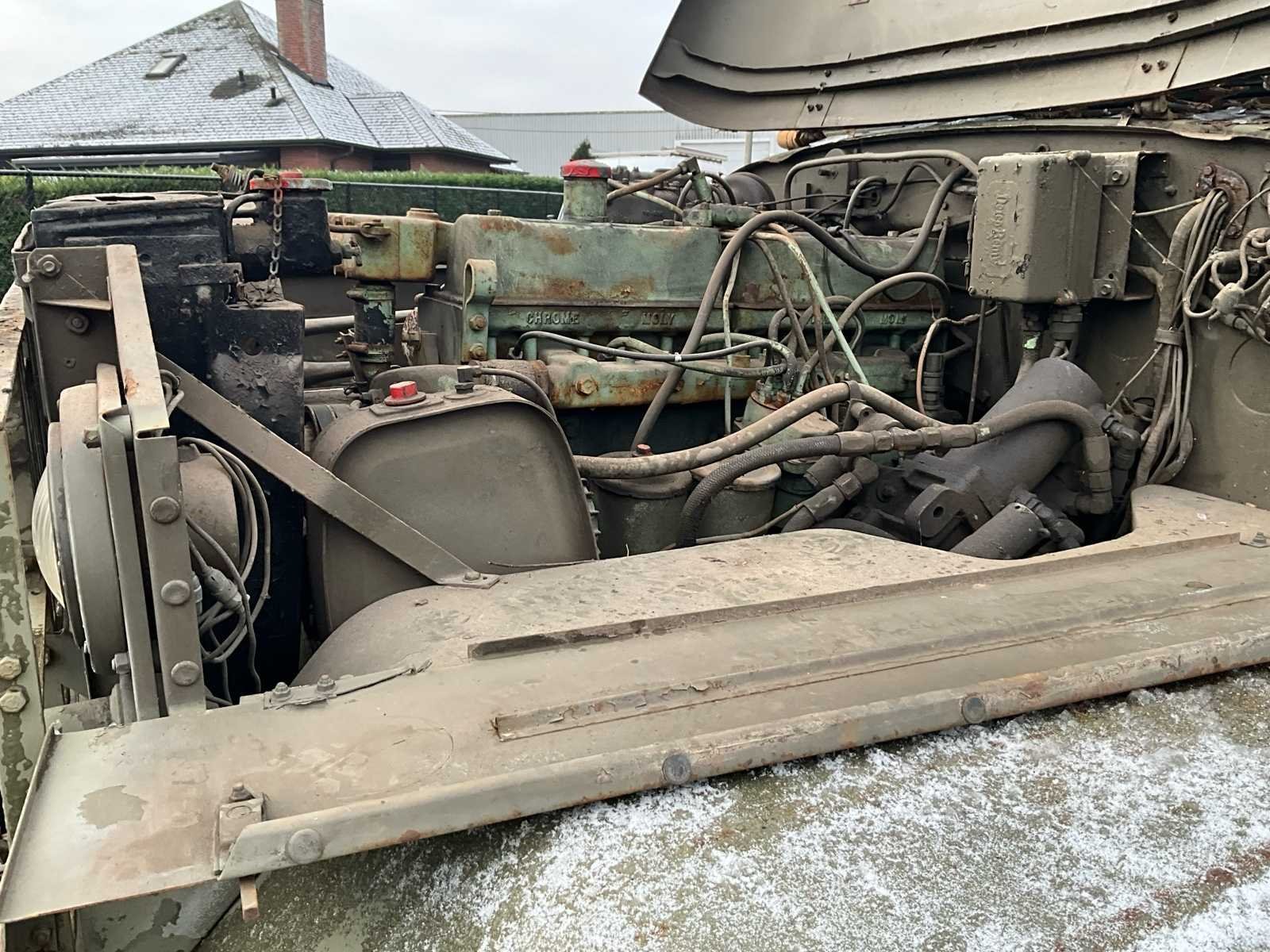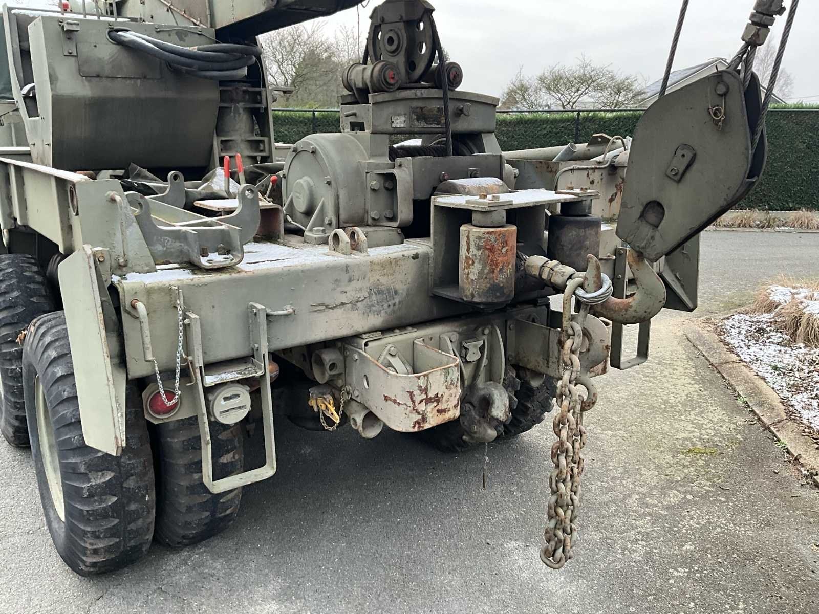 International M62 legervoertuig van het Belgische leger destijds. Het voertuig start, rijdt en remt. Exclusief de batterijen. Het voertuig is voorzien van een benzinemotor. De kraan op het voertuig heeft een lek in de hydrauliek. Voor verdere details, zie foto’s. Documenten ook aanwezig. No Merk: International M62 Type: TRK 5T 6X6 4D1 Chassisnummer VIN: 620383 Benzine: true Afgelezen mijlenstand: 1700mi Eigen gewicht: 14000kg