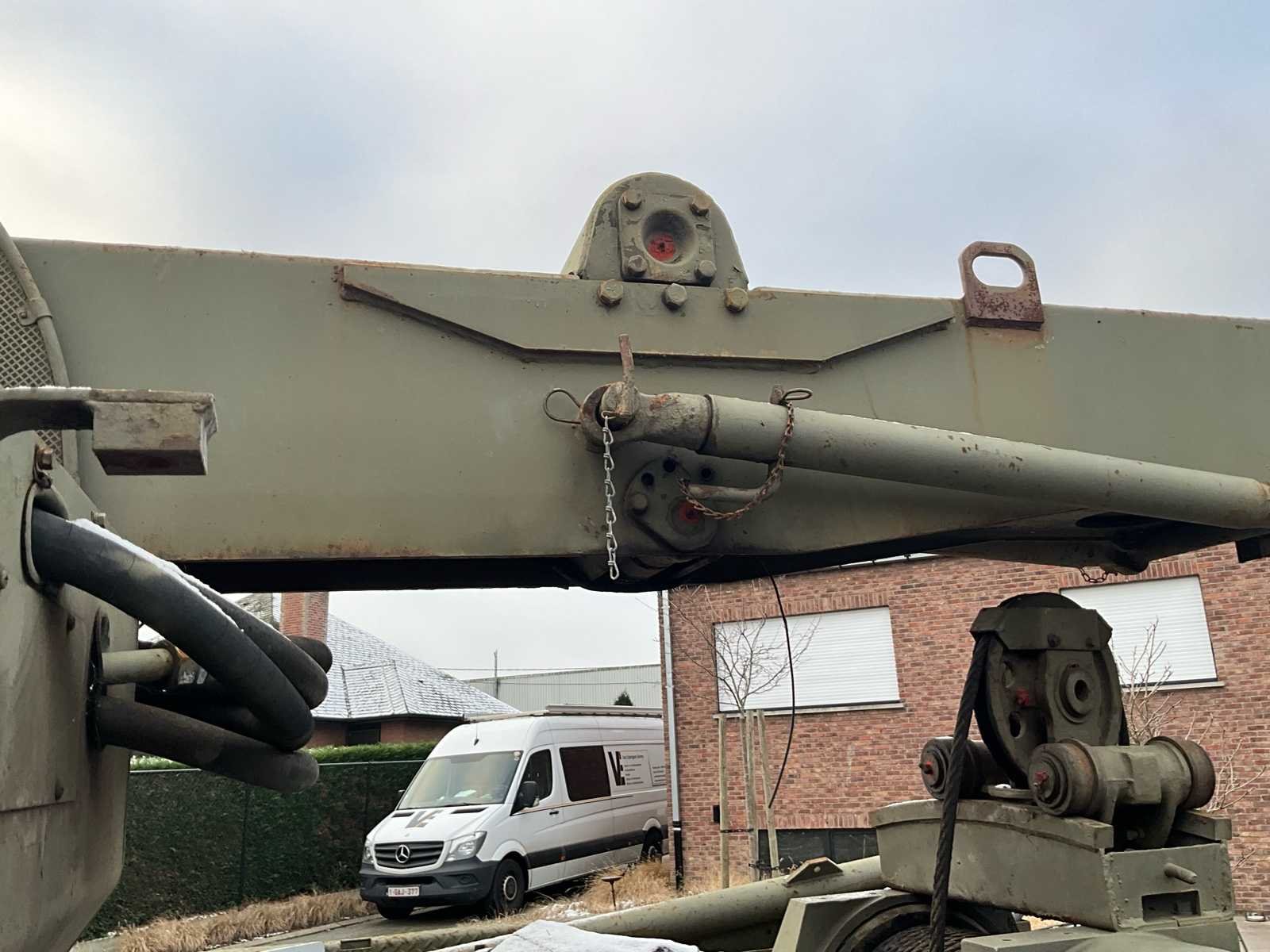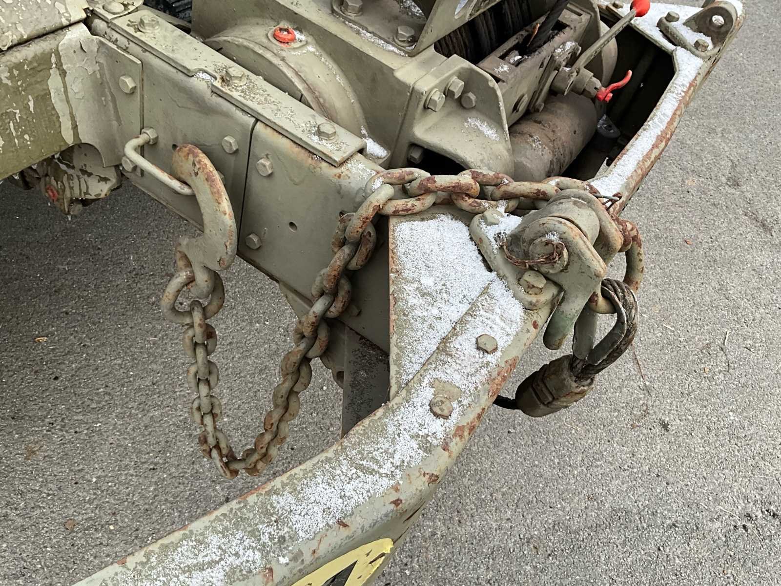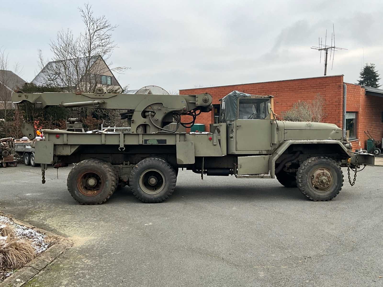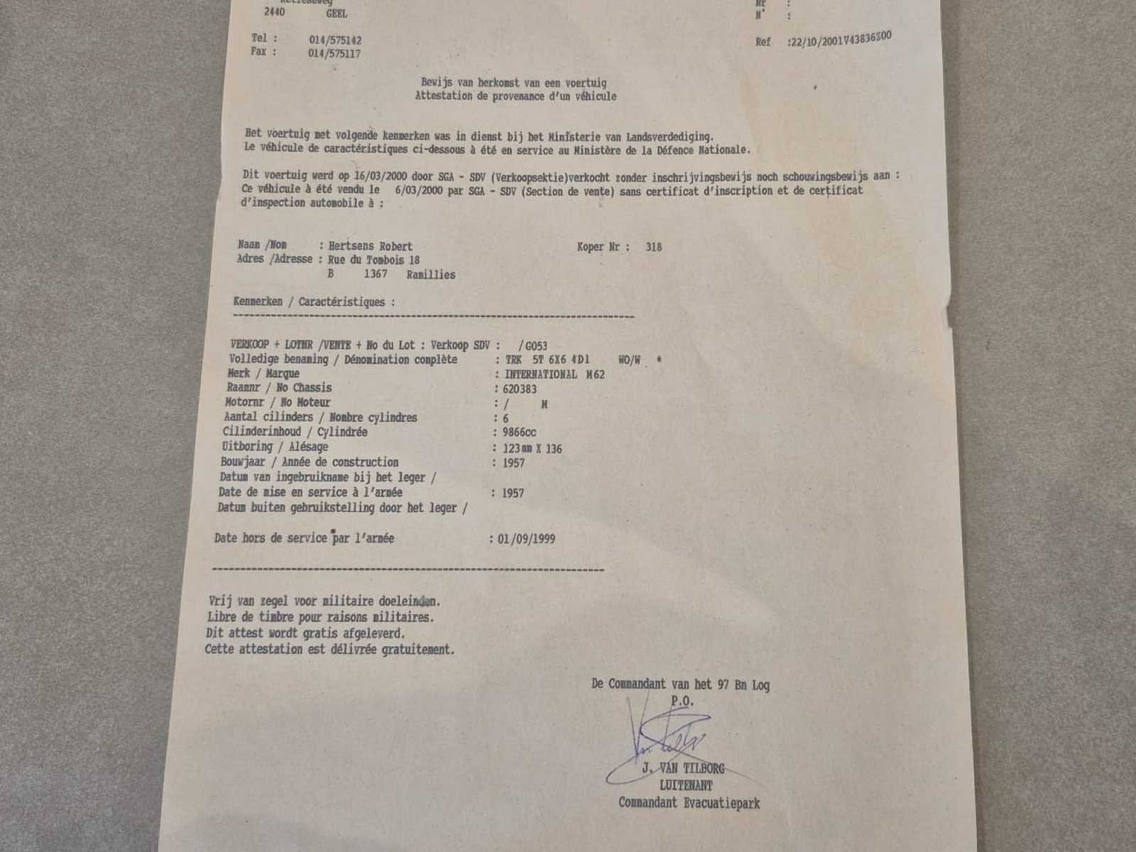 International M62 legervoertuig van het Belgische leger destijds. Het voertuig start, rijdt en remt. Exclusief de batterijen. Het voertuig is voorzien van een benzinemotor. De kraan op het voertuig heeft een lek in de hydrauliek. Voor verdere details, zie foto’s. Documenten ook aanwezig. No Merk: International M62 Type: TRK 5T 6X6 4D1 Chassisnummer VIN: 620383 Benzine: true Afgelezen mijlenstand: 1700mi Eigen gewicht: 14000kg