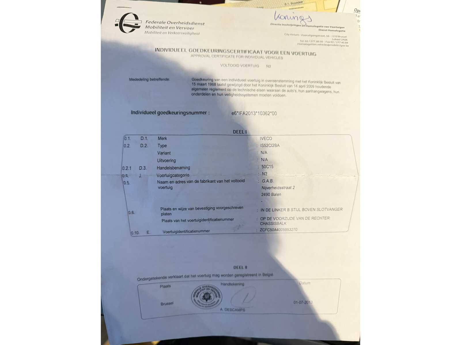 Nee Merk: Iveco Type: Daily Bouwjaar: 2013 Chassisnummer: ZCFC50A4005953270 Cilinderinhoud: 2998cc Vermogen (kW): 107kW Brandstof: diesel Transmissie: Handgeschakeld Nationaliteit documenten: België Emissieklasse: Euro 5b Kentekenpapieren compleet?: true Boorddocumenten aanwezig?: true