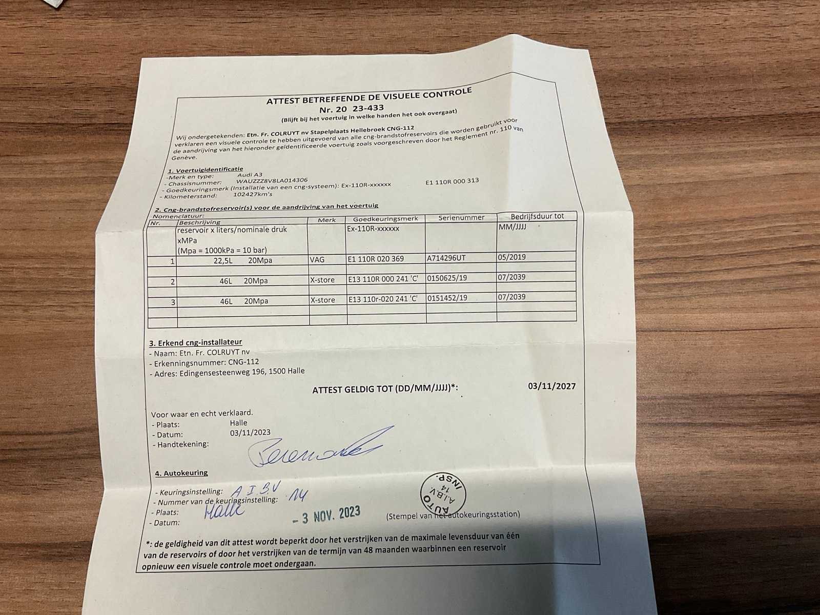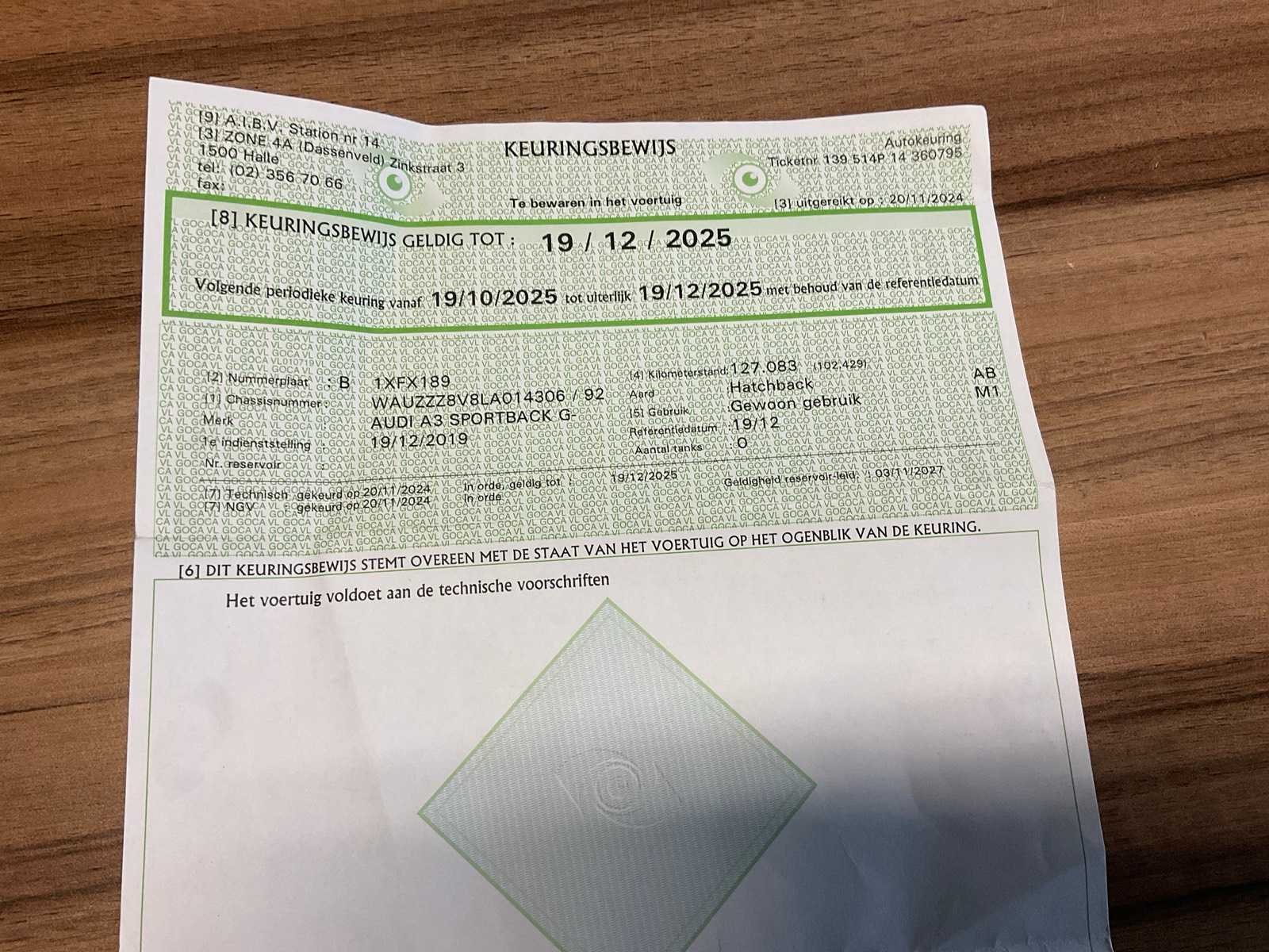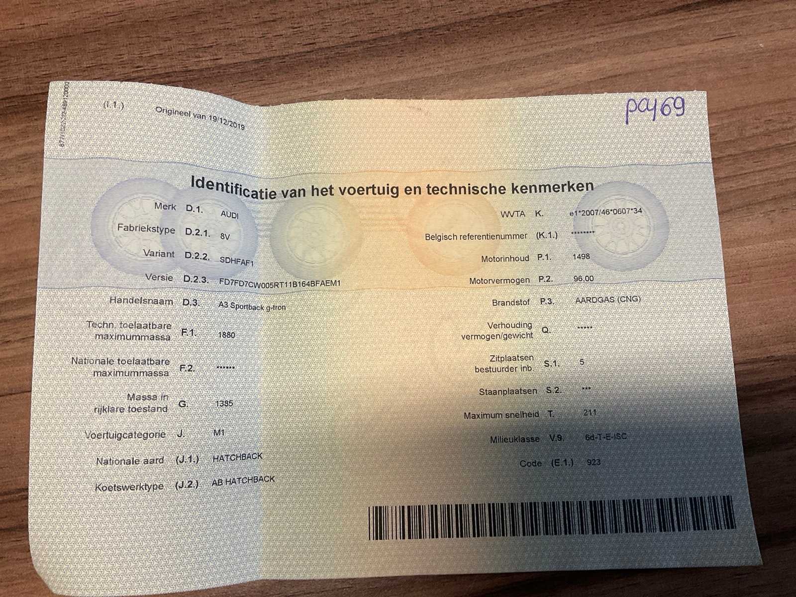 Nee Merk: Audi Model: A3 sportback Bouwjaar: 2019 Afgelezen kilometerstand: 143059km Cilinderinhoud: 1498cc Vermogen (kW): 96kW Brandstof: CNG Chassisnummer: WAUZZZ8V8LA014306 Datum eerste toelating: 19/12/2019 Aantal zitplaatsen: 5 Transmissie: Automaat Stuurwiel: LHD Emissieklasse: Euro 6d Aantal deuren: 5 Aantal sleutels: 3 Carrosserie: Hatchback Nationaliteit documenten: België Gelijkvormigheidsattest aanwezig: true Start en rijdt: Start niet en rijdt niet Keuringsrapport geldig tot: 19/12/2025 Zichtbare schade: Ongeval vooraan , airbags stuur , laterale airbags en airbag dashboard afgegaan , schade zelf na te kijken No self drive export!: true Vavato voert geen technische keuring uit.: true Airconditioning: true Xenon verlichting: true Leder bekleed: true Inschrijvingsbewijs - deel 1 : Aanwezig Inschrijvingsbewijs - deel 2: Aanwezig