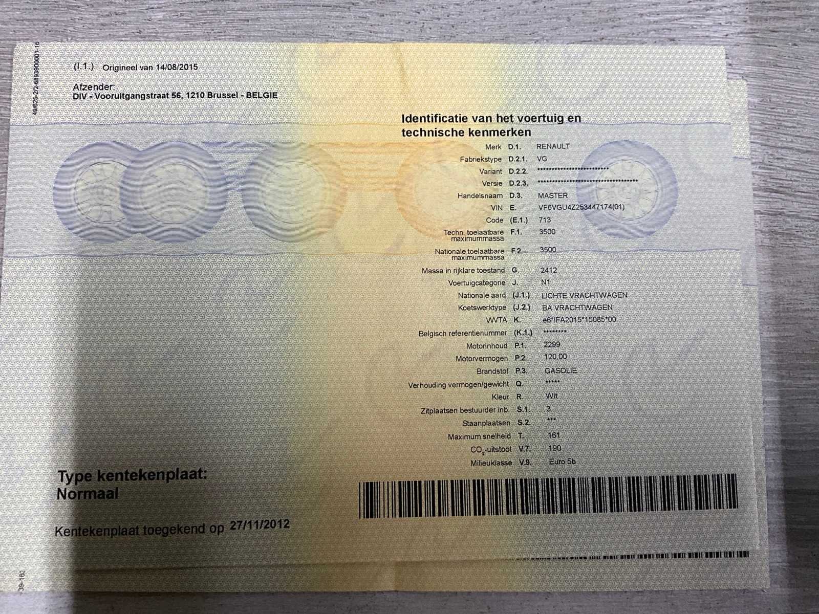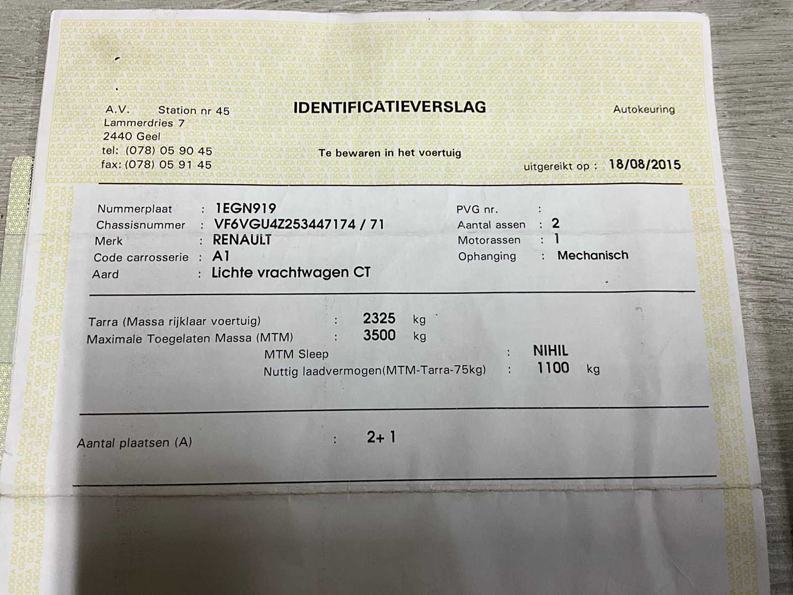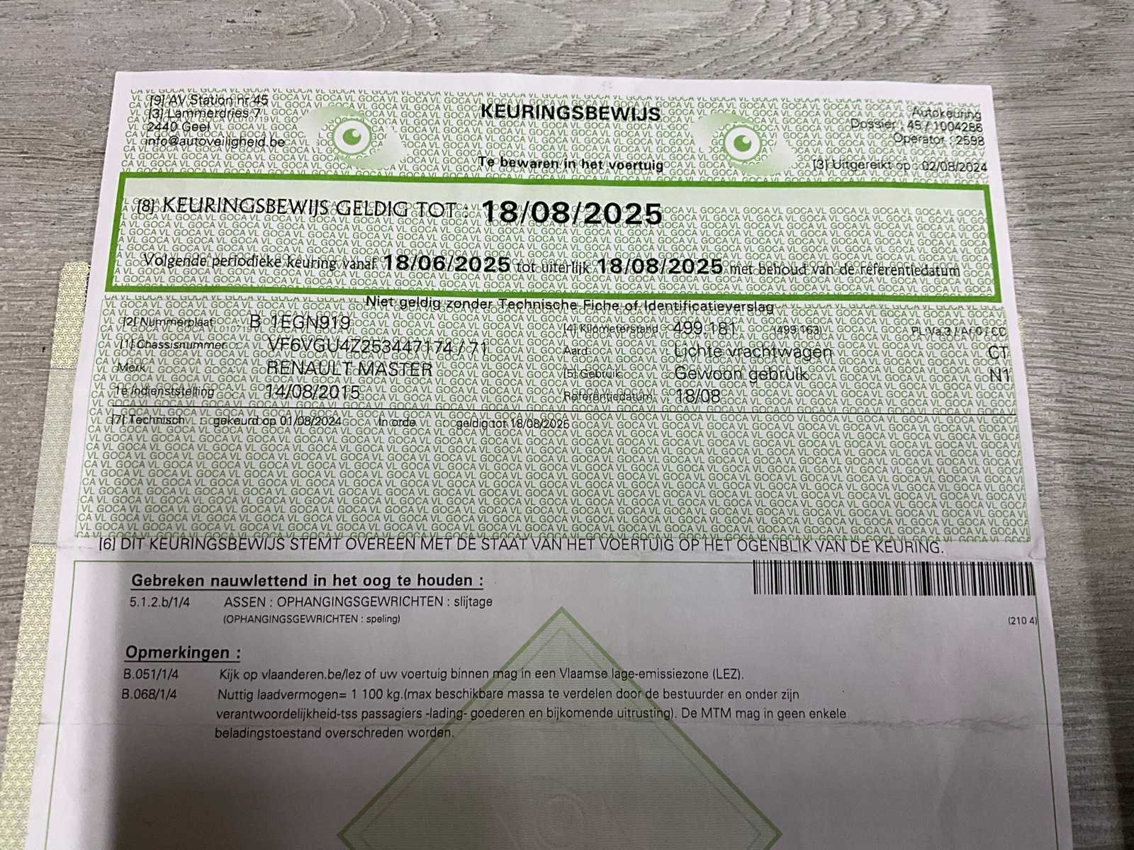 Deze Renault Master laadbak uit 2019 is een praktische en krachtige lichte vracht, ideaal voor bouw, transport of projectmatig werk. Dankzij de open laadbak met opbouwframe is het voertuig zeer geschikt voor het vervoeren van lange of volumineuze materialen - lengte 6450- hoogte 3000- breedte 2150 - Krachtige 2.3 dCi-motor geschikt voor zware ladingen - Open laadbak met metalen frame – ideaal voor lange materialen - Hoog praktisch nut voor professioneel gebruik - Goede laadcapaciteit binnen 3.500 kg klasse - Opgelet: zeil afwezig - melding dashboard (zie foto) Nee Merk: Renault Model: Master Type: lichte vracht Bouwjaar: 2019 Afgelezen kilometerstand: 528972km Cilinderinhoud: 2299cc Vermogen (kW): 120kW Brandstof: diesel Chassisnummer: VF6VGU4Z253447174 Laadvermogen: 1100kg Datum eerste toelating: 14/8/2019 Aantal zitplaatsen: 3 Kleur: wit Transmissie: Handgeschakeld Emissieklasse: Euro 5b Aantal deuren: 2 Ledig gewicht: 2325kg Nationaliteit documenten: B Gelijkvormigheidsattest aanwezig: true Start en rijdt: ja Keuringsrapport geldig tot: 18/8/2025 Zichtbare schade: ja Vavato voert geen technische keuring uit.: true Inschrijvingsbewijs - deel 1 : Aanwezig Inschrijvingsbewijs - deel 2: Aanwezig