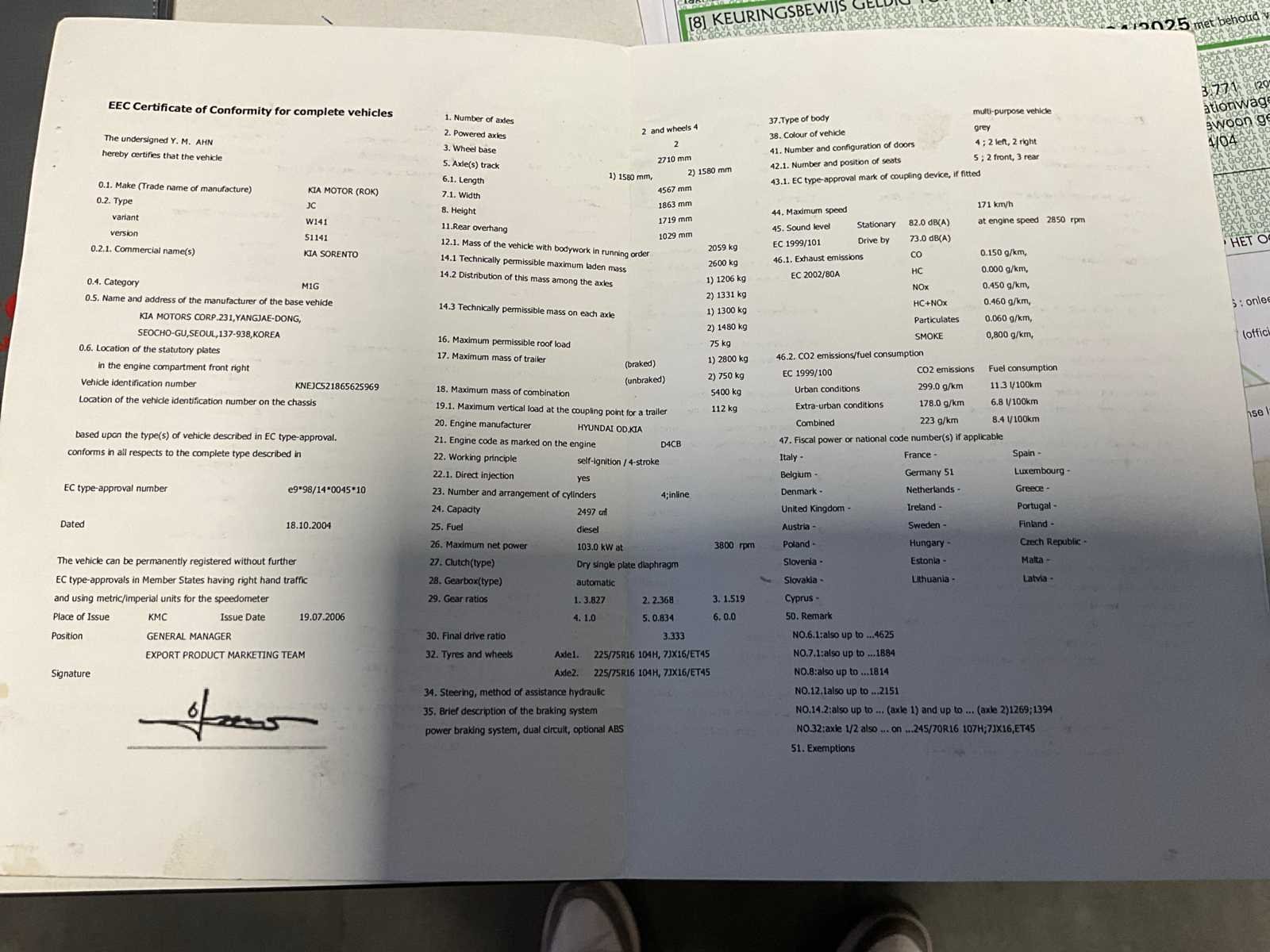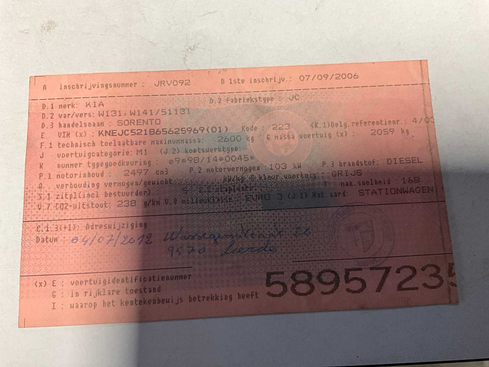 EURO3 103KW 2497CC BJ 2006 No Merk: Kia Model: Sorento Bouwjaar: 2006 Afgelezen kilometerstand: 215978km Cilinderinhoud: 2497cc Vermogen (kW): 103kW Brandstof: diesel Chassisnummer: KNEJC521865625969 Datum eerste toelating: 07/09/2006 Aantal zitplaatsen: 5 Transmissie: Automaat Emissieklasse: EURO3 Aantal deuren: 5 Aantal sleutels: 1 Carrosserie: Stationwagen Nationaliteit documenten: Belg CO2-uitstoot NEDC: 238 Vavato voert geen technische keuring uit.: true Airconditioning: true Leder bekleed: true