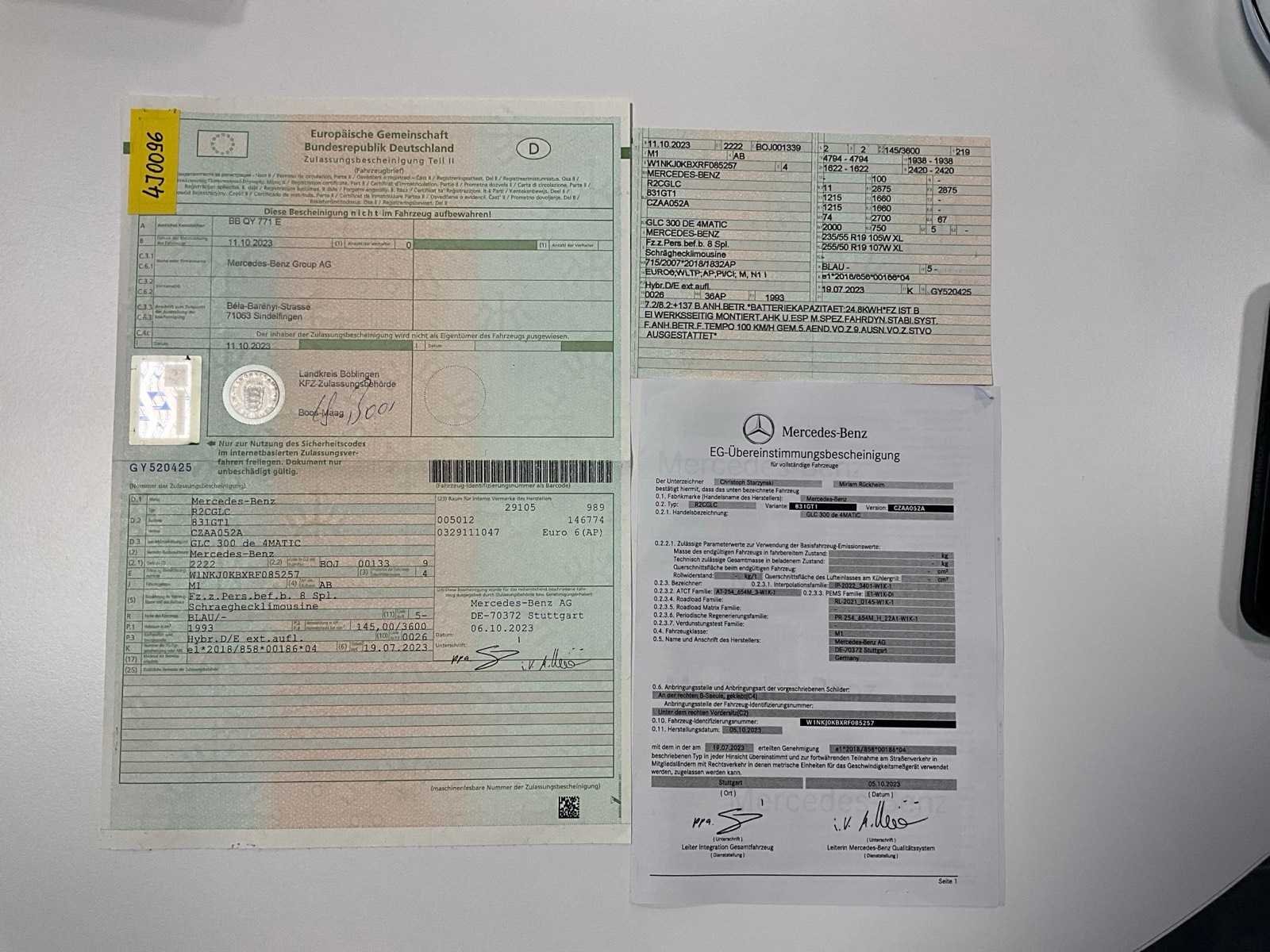 Nee Merk: Mercedes-Benz Model: GLC 300 Bouwjaar: 2023 Afgelezen kilometerstand: 26500km Cilinderinhoud: 1993cc Vermogen (kW): 145kW Brandstof: hybride (elektrisch+diesel) Chassisnummer: W1NKJ0KBXRF085257 Datum eerste toelating: 11/10/2023 Vermogen (pk): 197hp Aantal zitplaatsen: 5 Transmissie: Automaat Aantal deuren: 5 Nationaliteit documenten: GER Gelijkvormigheidsattest aanwezig: true Start en rijdt: Ja Inschrijvingsbewijs - deel 1 : Aanwezig Inschrijvingsbewijs - deel 2: Aanwezig