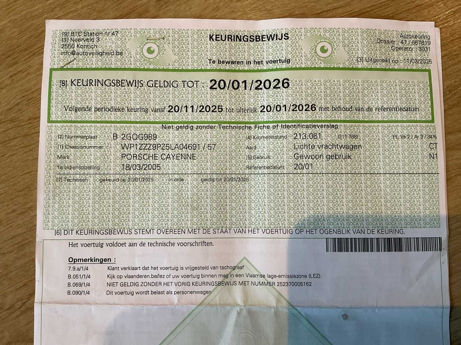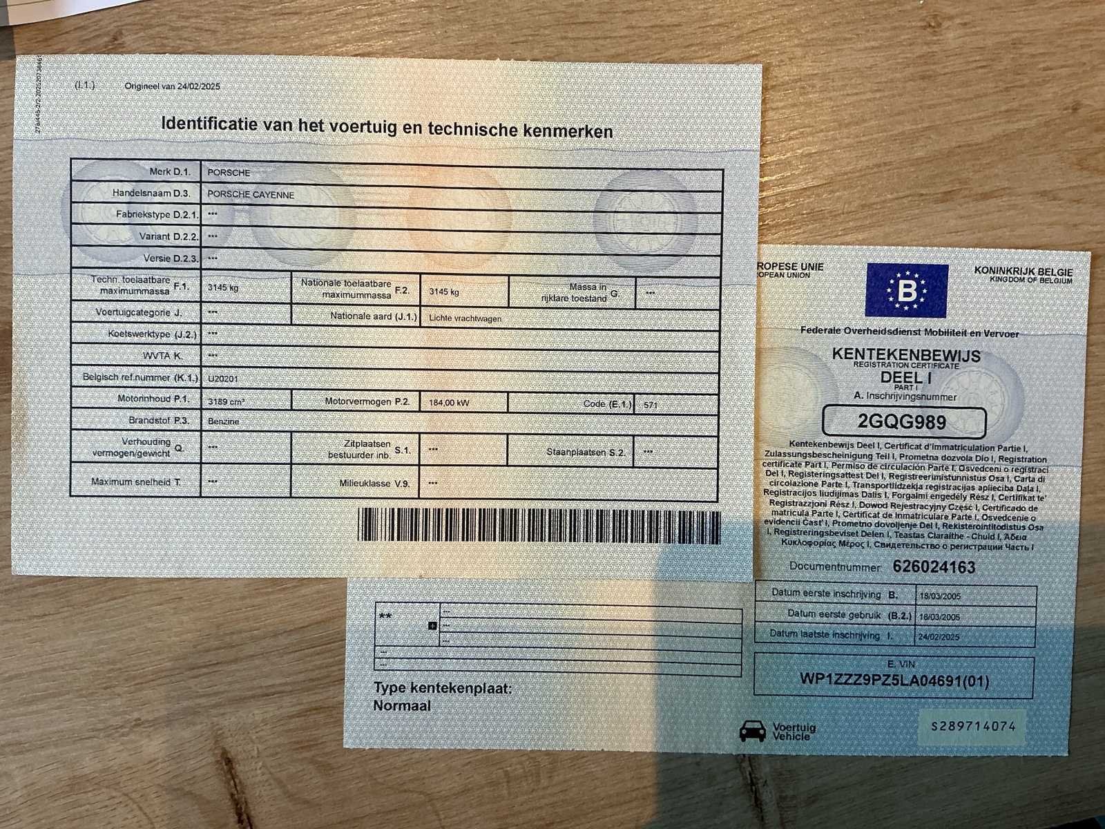 Na te kijken: Pomp van kofferdeksel houdt kofferklep niet open. Sierlijsten rond de ramen zijn destijds zwart gespoten maar beginnen af te bladeren rondom. (Zie foto) Nee Merk: Porsche Model: Cayenne Bouwjaar: 2005 Cilinderinhoud: 3189cc Vermogen (kW): 184kW Brandstof: Benzine Chassisnummer: WP1ZZZ9PZ5LA04691 Datum eerste toelating: 18/03/2005 Aantal zitplaatsen: 5 Maximaal trekgewicht ongeremd: 3400kg Maximaal trekgewicht geremd: 750kg Transmissie: Automaat Stuurwiel: Links Aantal deuren: 5 Aantal sleutels: 1 Aantal cilinders: 6 Nationaliteit documenten: BE Gelijkvormigheidsattest aanwezig: true Start en rijdt: Ja Keuringsrapport geldig tot: 20/01/2026 startinformatie : Start, rijdt, remt Vavato voert geen technische keuring uit.: true Airconditioning: true Inschrijvingsbewijs - deel 1 : OK Inschrijvingsbewijs - deel 2: OK