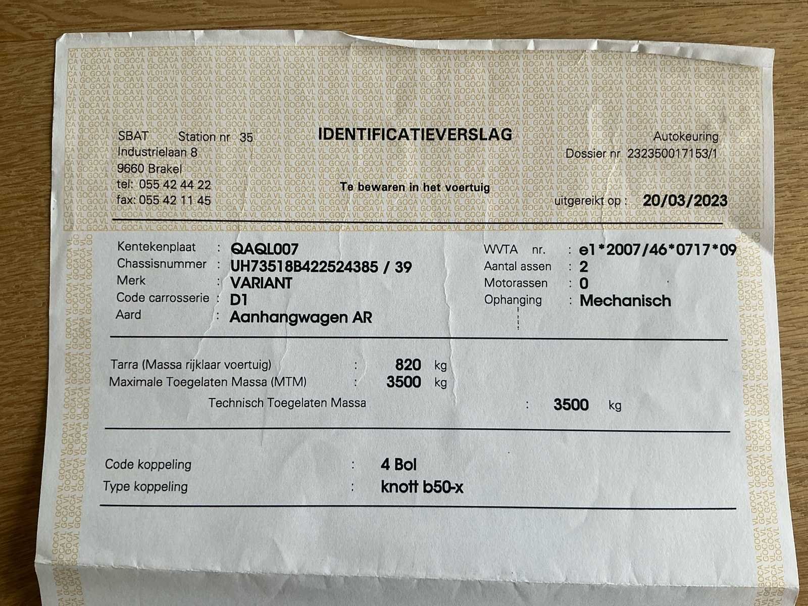 No Merk: Variant Type: 2AMB-5 Model: 3512MA Bouwjaar: 2022 Chassisnummer: UH735184B422524385 Aantal assen: 2 Laadbak afmeting l: 400cm Laadbak afmeting b: 235cm Ledig gewicht: 820kg Laadvermogen: 2680kg Datum eerste toelating: 20/03/2023 Kentekenpapieren compleet?: true Lengte: 600cm Breedte: 235cm Nationaliteit documenten: BE