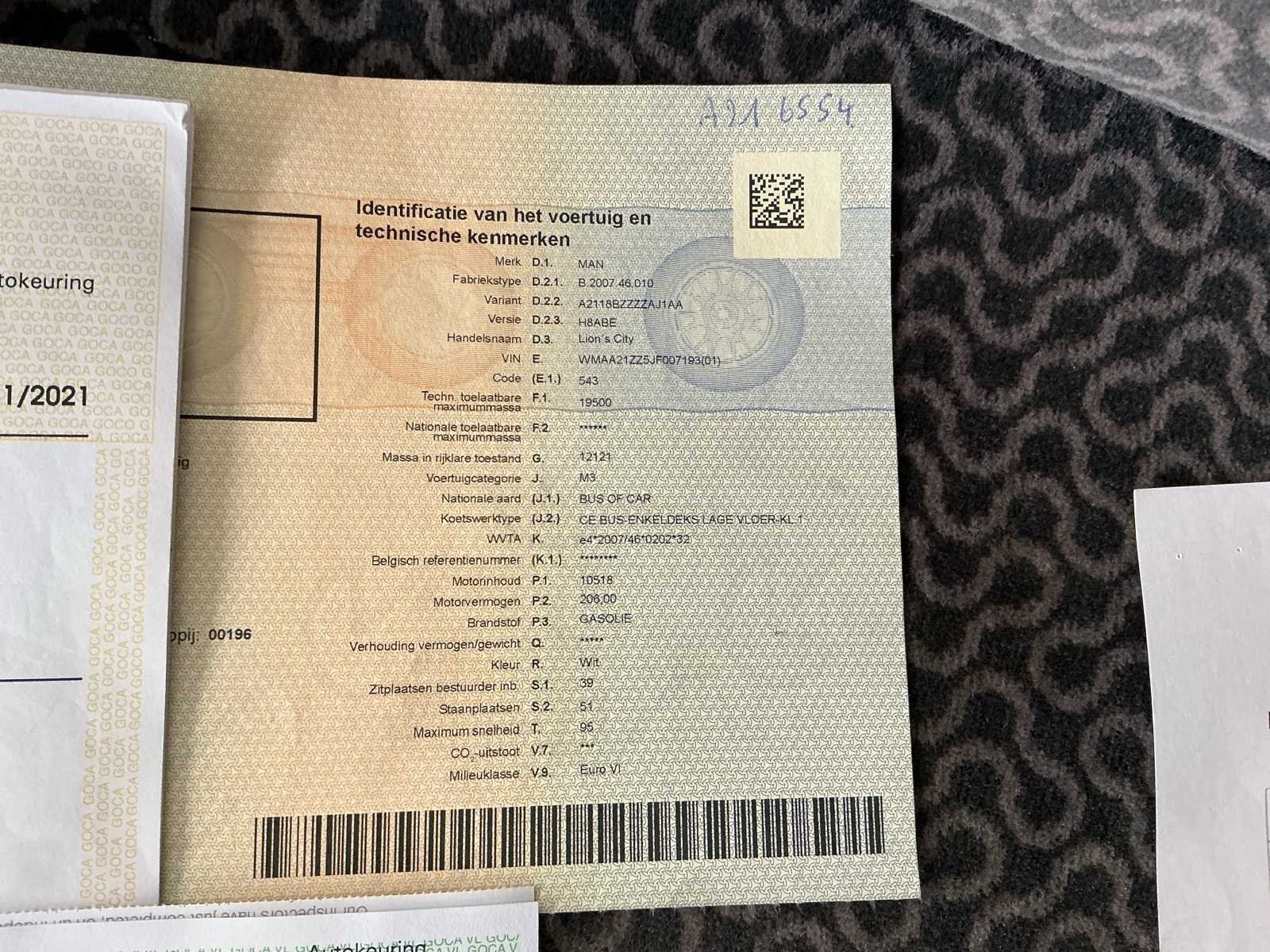 No Merk: MAN Model: A21 Bouwjaar: 2018 Chassisnummer VIN: WMAA21ZZ5JF007193 Datum eerste toelating: 24/05/2018 Automaat: true Motorvermogen (kW): 206 Brandstof: Diesel Emissieklasse: EURO 6 Kilometerstand bij opname: 589802km Aantal personen: 89 Stadsbus: true Aantal noodluiken: 2