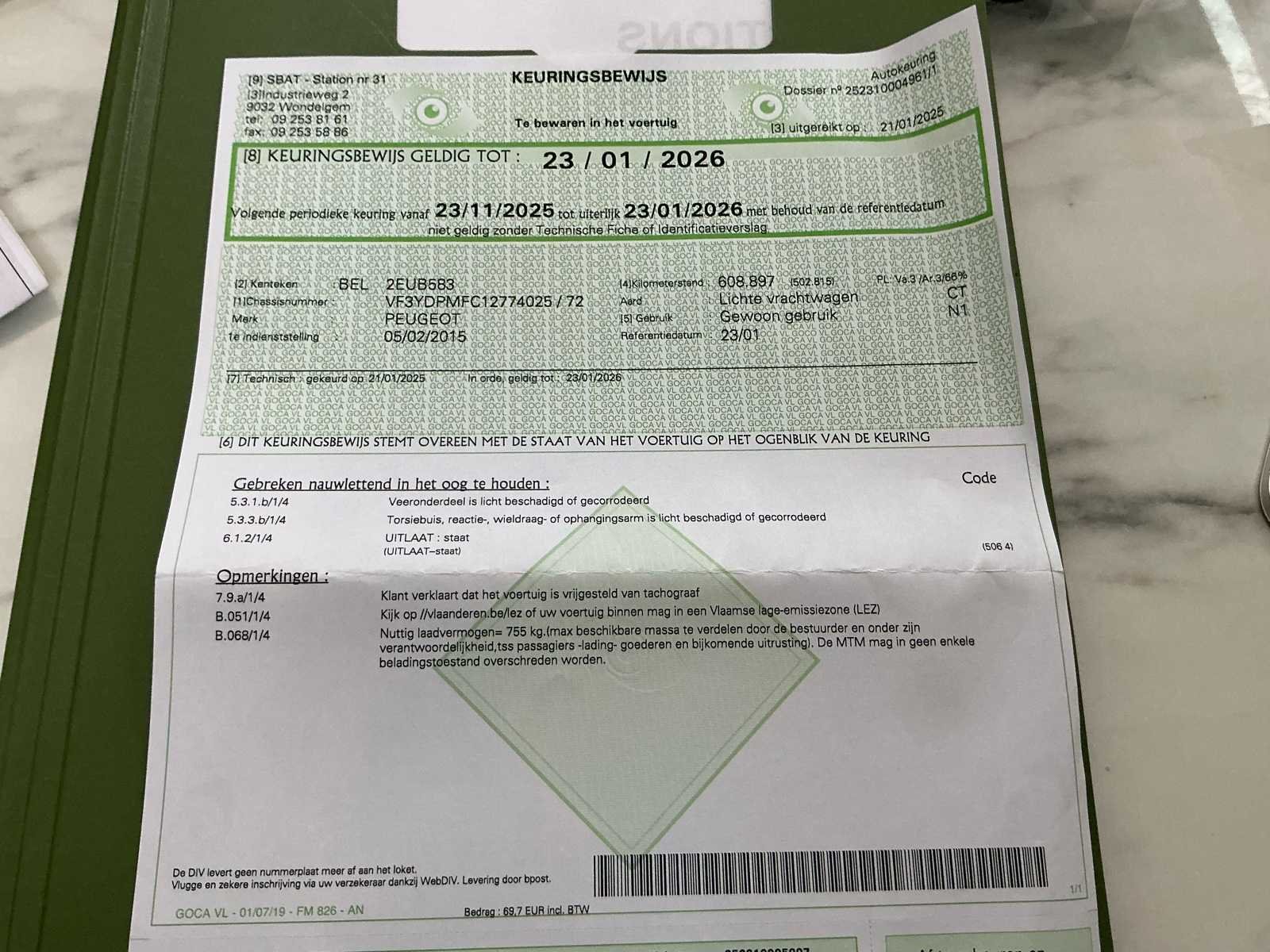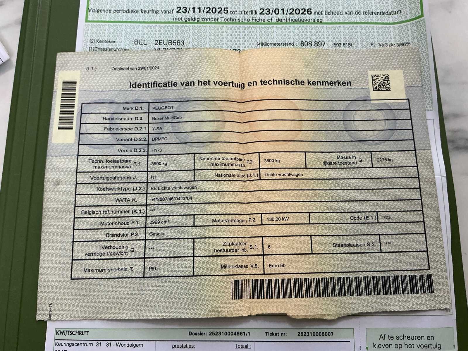 Zal geledigd zijn bij afhaling No Kenteken: 2EUB583 Merk: Peugeot Model: Boxer Multicab Type: Y-SA Bouwjaar: 2015 Afgelezen kilometerstand: 657797km Cilinderinhoud: 2999cc Vermogen (kW): 130kW Brandstof: Diesel Chassisnummer: VF3YDPMFC12774025 Datum eerste toelating: 05/02/2015 Aantal zitplaatsen: 6 Transmissie: Handgeschakeld Emissieklasse: Euro 5b Nationaliteit documenten: Belgische Start en rijdt: Ja Keuringsrapport geldig tot: 23/01/2026 Vavato voert geen technische keuring uit.: true Inschrijvingsbewijs - deel 1 : Aanwezig Inschrijvingsbewijs - deel 2: Aanwezig