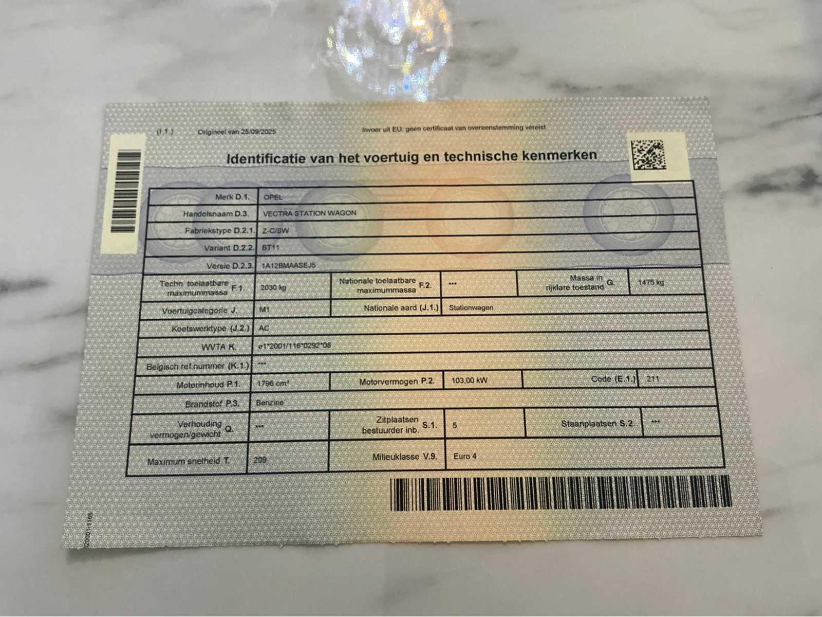 Deel 2 zal aanwezig zijn bij afhaling Nee Kenteken: 2FEW212 Merk: Opel Model: Vectra Bouwjaar: 2008 Afgelezen kilometerstand: 246109km Cilinderinhoud: 1796cc Vermogen (kW): 103kW Brandstof: benzine Chassisnummer: WOLOZCF3581061625 Datum eerste toelating (NL): 28/02/2008 Transmissie: Handgeschakeld Emissieklasse: Euro 4 Ledig gewicht: 1475kg Start en rijdt: Ja Keuringsrapport geldig tot: 27/06/2026 Vavato voert geen technische keuring uit.: true Inschrijvingsbewijs - deel 1 : Aanwezig Inschrijvingsbewijs - deel 2: Aanwezig