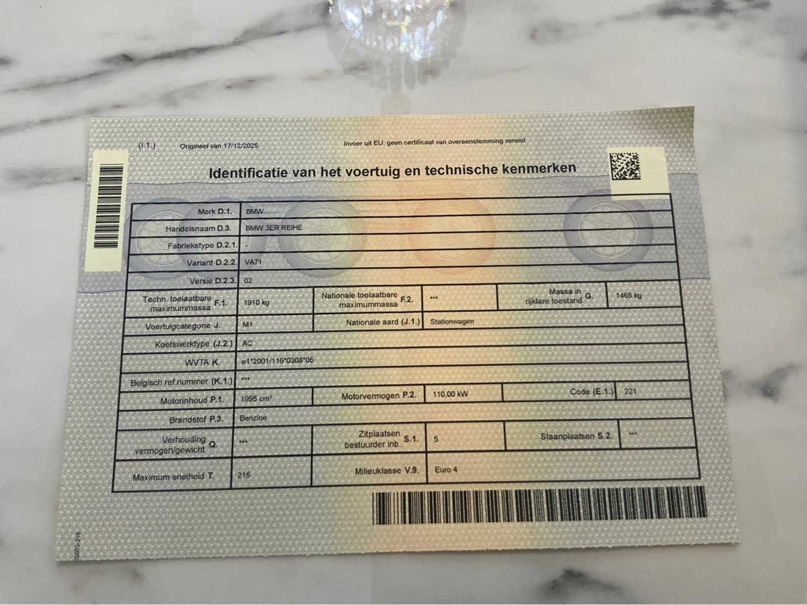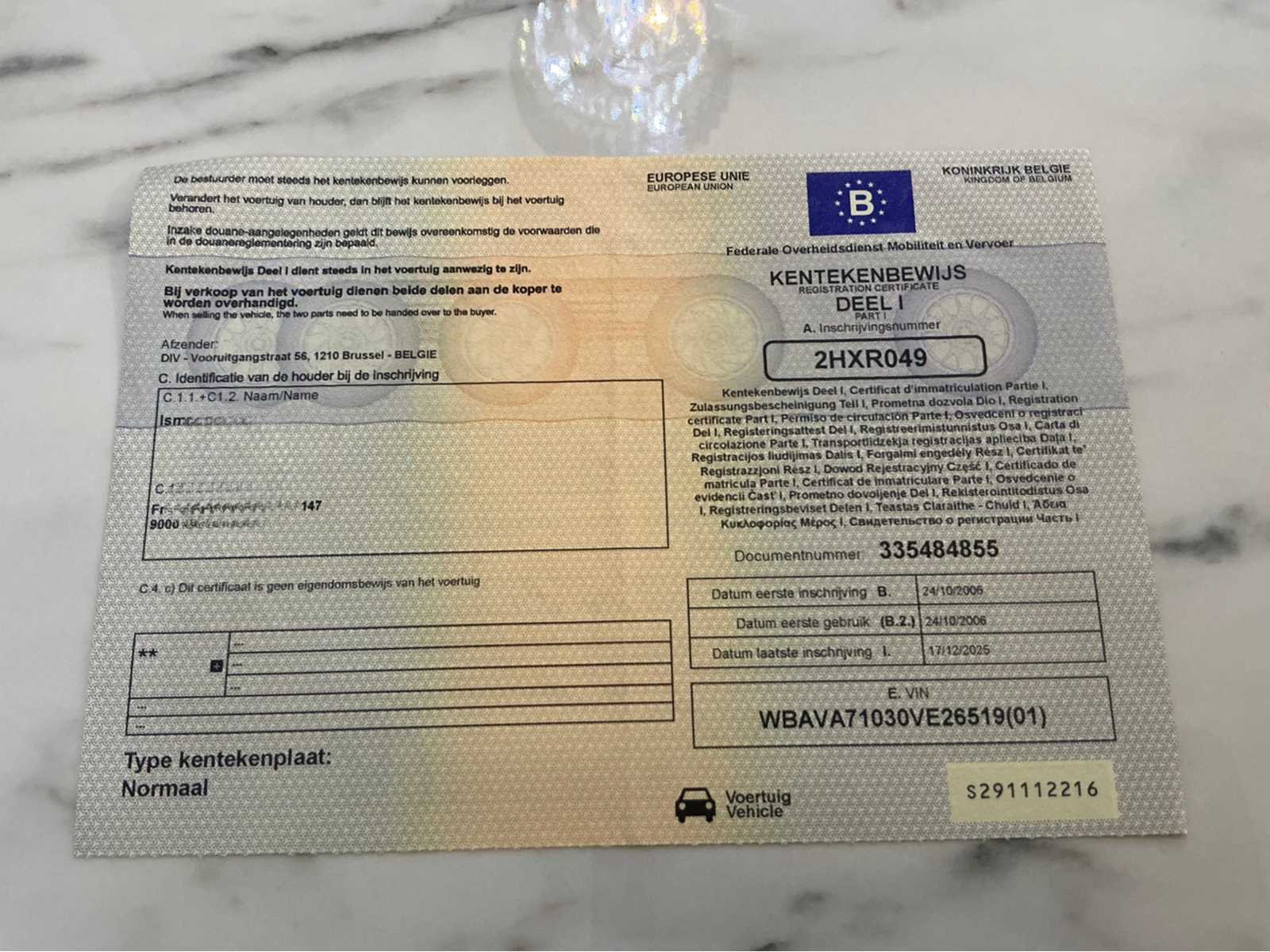 Deel 2 zal aanwezig zijn bij afhaling Nee Kenteken: 2HXR049 Merk: BMW Model: 3-reeks Bouwjaar: 2006 Afgelezen kilometerstand: 225470km Cilinderinhoud: 1995cc Vermogen (kW): 110kW Brandstof: benzine Chassisnummer: WBAVA71030VE26519 Datum eerste toelating (NL): 24/10/2006 Aantal zitplaatsen: 5 Transmissie: Automaat Emissieklasse: Euro 4 Ledig gewicht: 1465kg Nationaliteit documenten: Belgische Start en rijdt: Ja Keuringsrapport geldig tot: 14/10/2026 Vavato voert geen technische keuring uit.: true Inschrijvingsbewijs - deel 1 : Aanwezig Inschrijvingsbewijs - deel 2: Aanwezig