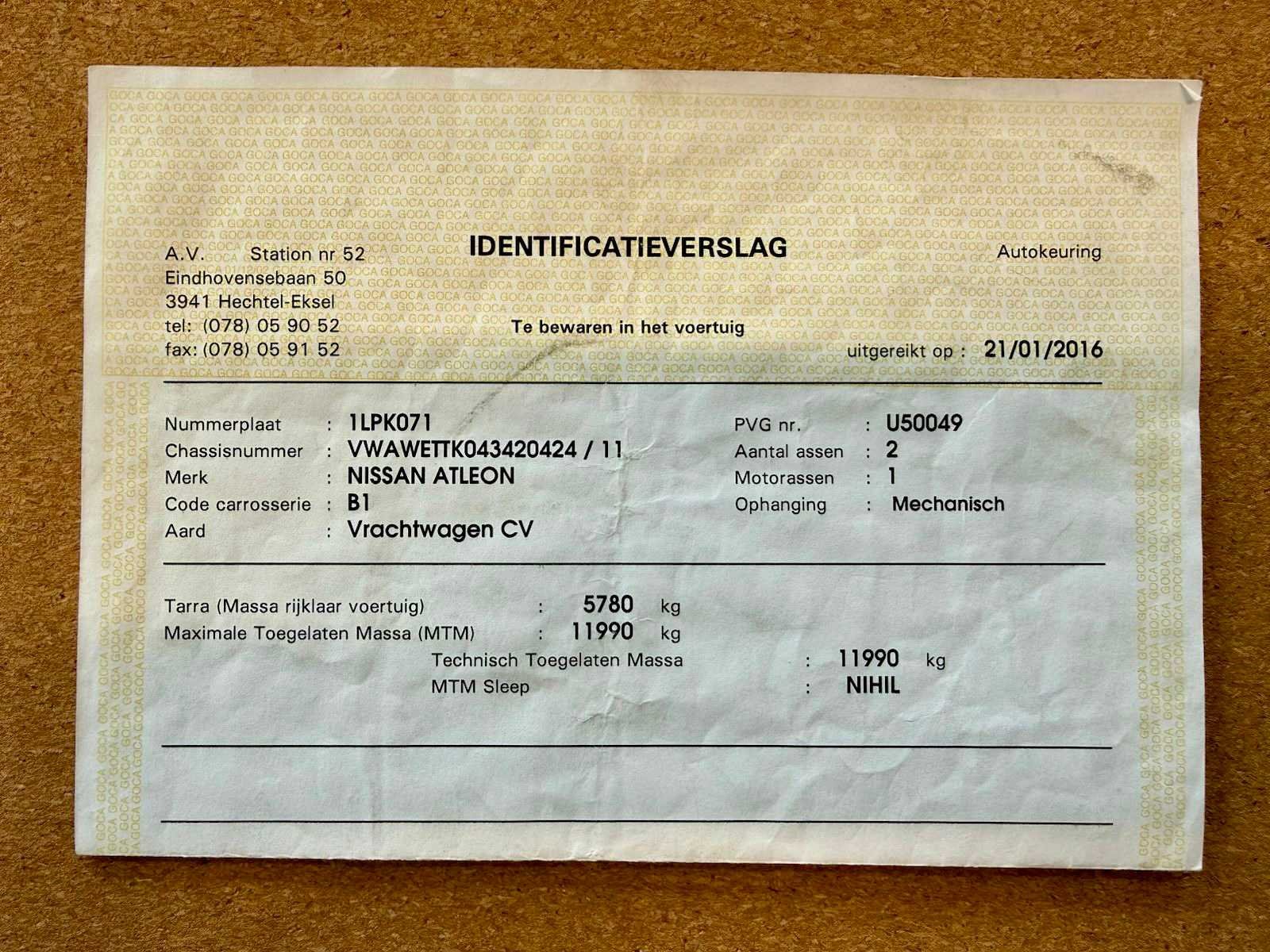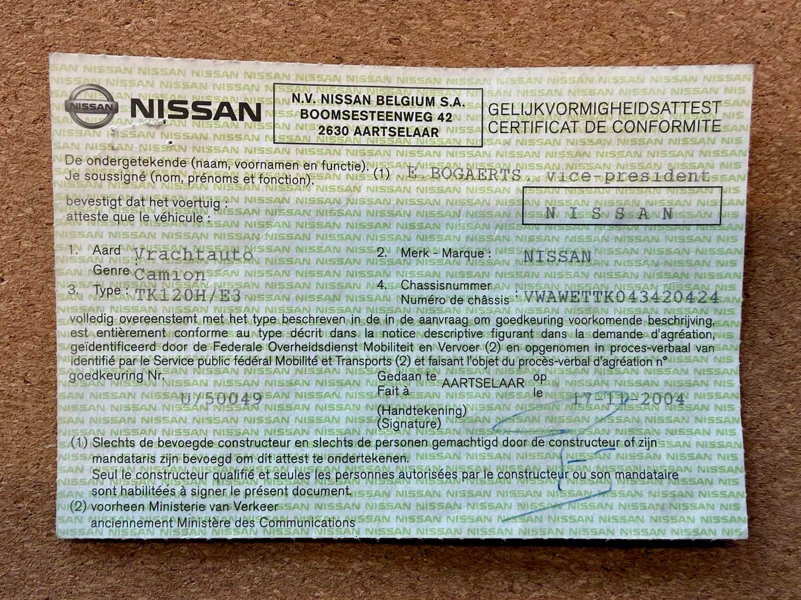 Start met booster. Lekt olie, ABS kapot. EXPORT Nee Merk: Nissan Type: Atleon Bouwjaar: 2004 Chassisnummer VIN: VWAWETTK043420424 Cilinderinhoud: 5985cc Kilometerstand bij opname: 236968km Aantal assen: 2 Emissieklasse: Euro3 Hydraulische laadklep: true Gesloten opbouw: true Startinformatie: Met booster Nationaliteit documenten: Belgisch Kentekenpapieren compleet?: true Automaat: true Diesel: true