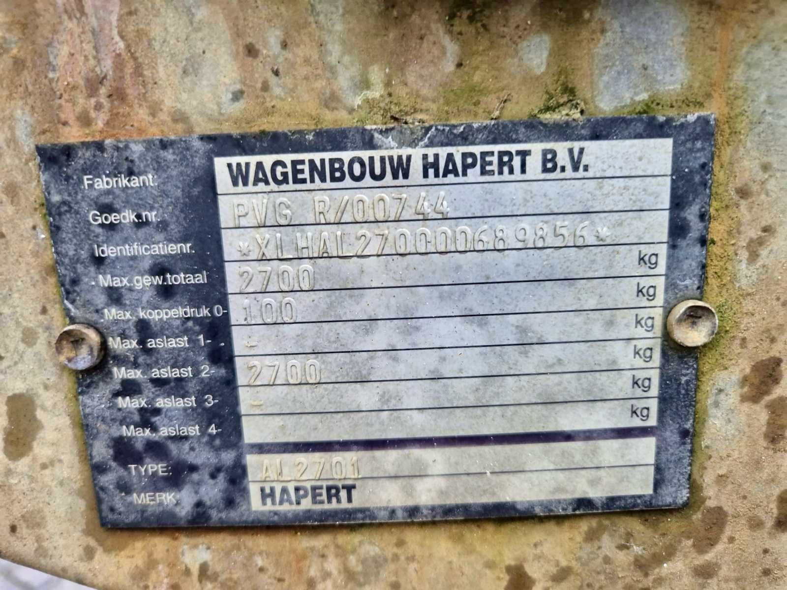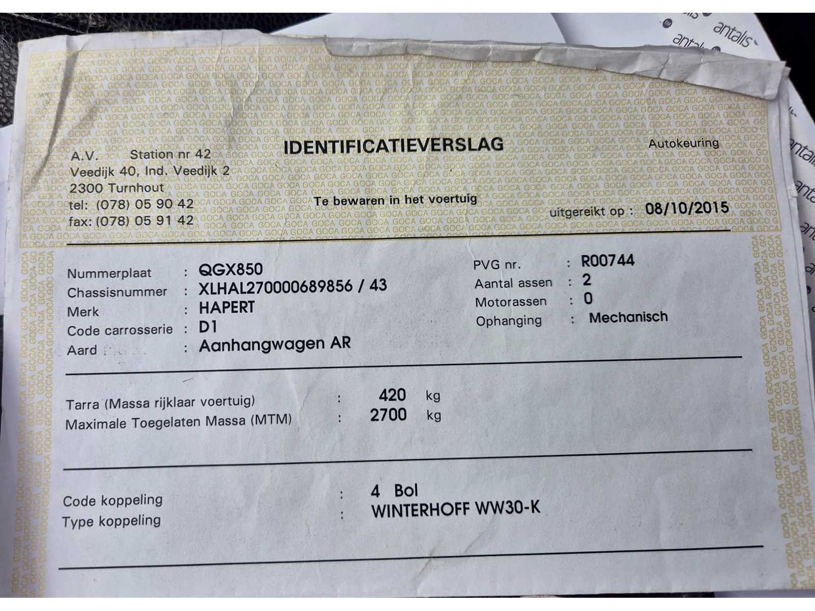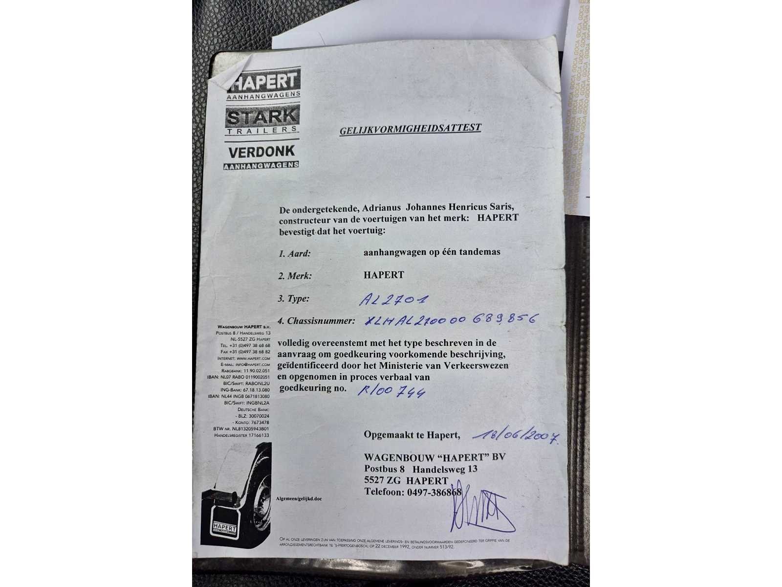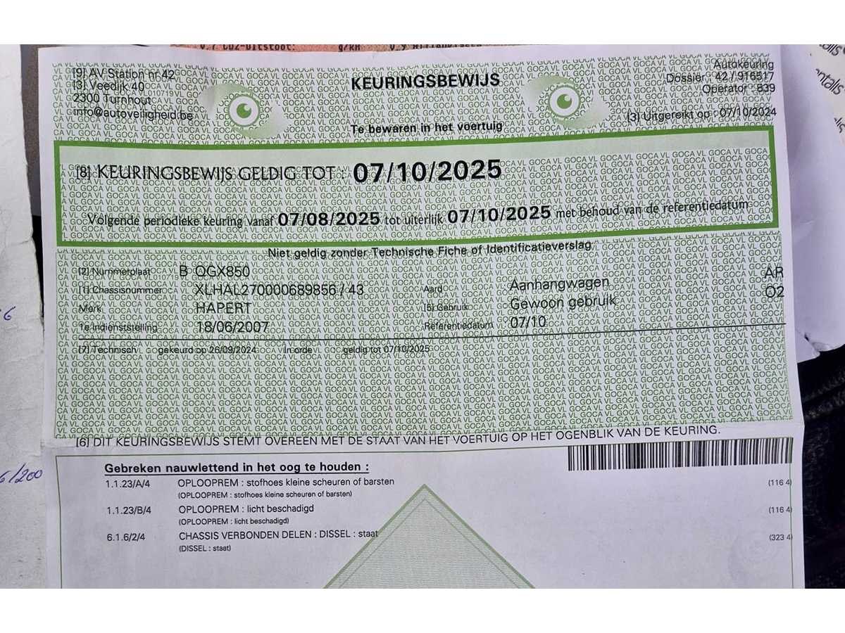 Opgelet, dit lot zal niet worden gekeurd voor verkoop (van toepassing op Belgische particuliere kopers). Nee Merk: Hapert Type: AL2701 Bouwjaar: 2007 Chassisnummer: XLHAL270000689856 APK vervaldatum: 07/10/2025 Kentekenpapieren compleet?: true Lengte: 340cm Breedte: 180cm Nationaliteit documenten: Belgisch