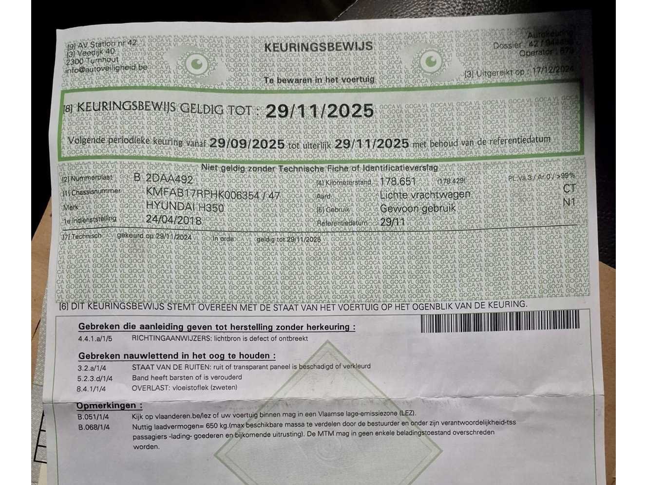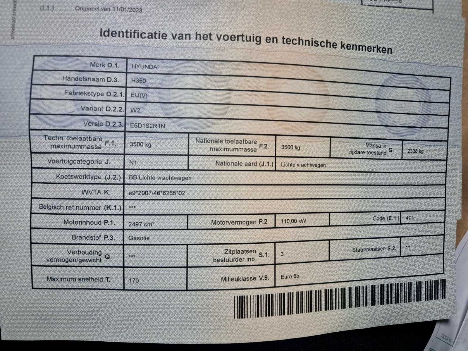 Opgelet, deze auto zal niet worden gekeurd voor verkoop (van toepassing op Belgische particuliere kopers). Nee Merk: Hyundai Type: H350 Bouwjaar: 2018 Chassisnummer: KMFAB17RPHK006354 Afgelezen kilometerstand: 199670km Cilinderinhoud: 2497cc Vermogen (kW): 110kW Brandstof: Diesel APK vervaldatum: 29/11/2025 Nationaliteit documenten: Belgisch Kentekenpapieren compleet?: true
