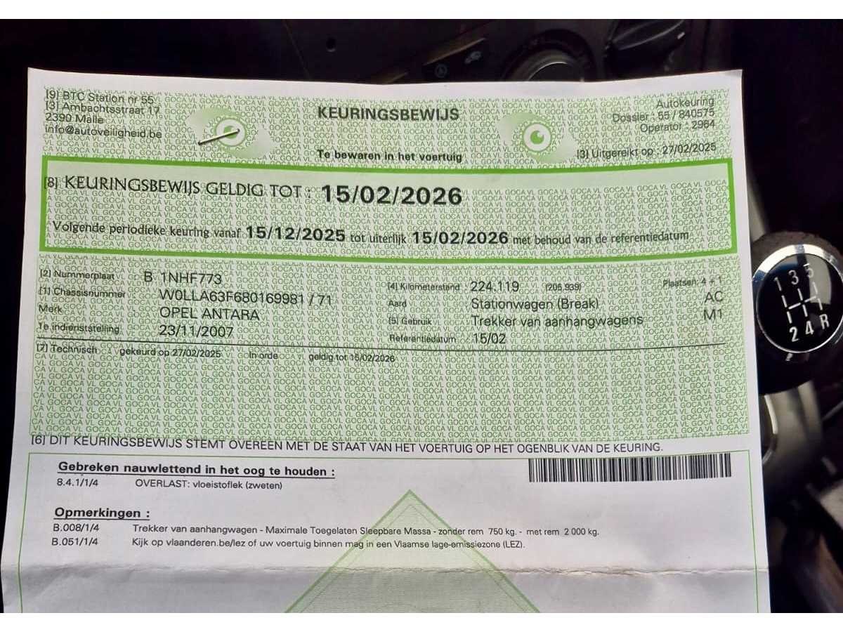 Opgelet, deze auto zal niet worden gekeurd voor verkoop (van toepassing op Belgische particuliere kopers). Nee Merk: Opel Model: Antara 4x4 Type: 2.0 CDTI Bouwjaar: 2007 Afgelezen kilometerstand: 249674km Cilinderinhoud: 1991cc Vermogen (kW): 110kW Brandstof: Diesel Chassisnummer: W0LLA63F680169981 Nationaliteit documenten: Belgisch Keuringsrapport geldig tot: 15/02/2026 Vavato voert geen technische keuring uit.: true Inschrijvingsbewijs - deel 1 : Aanwezig Inschrijvingsbewijs - deel 2: Aanwezig