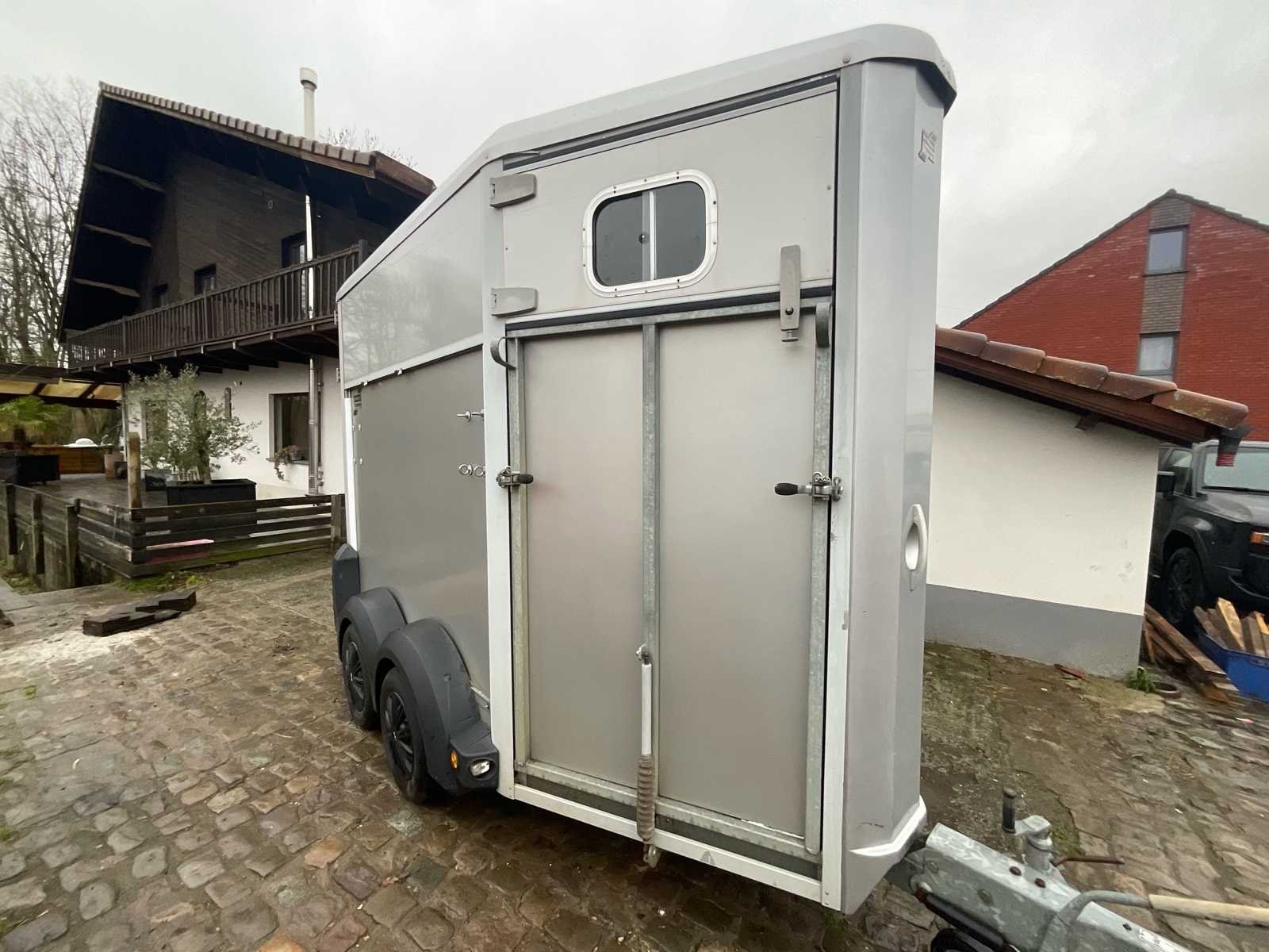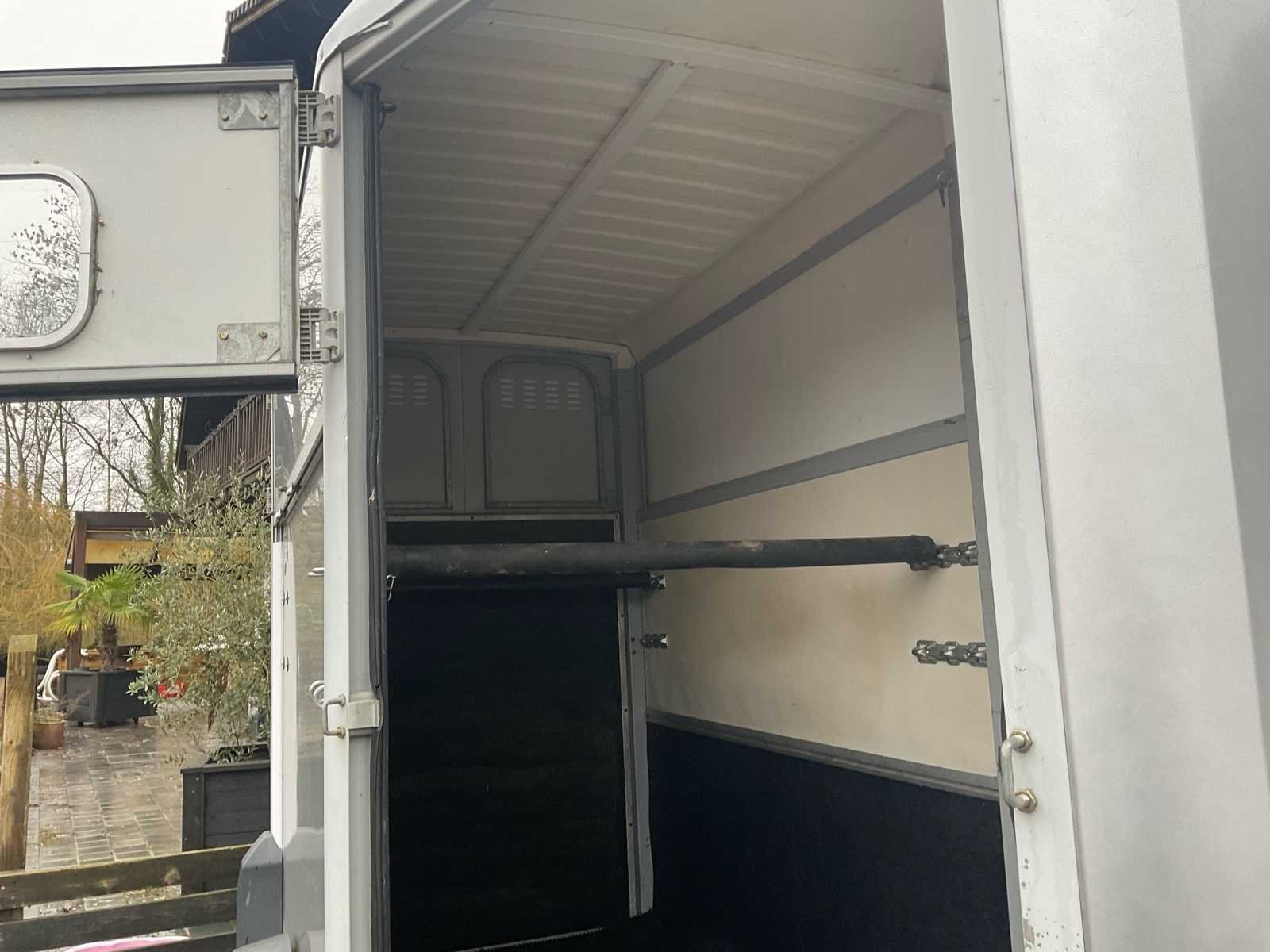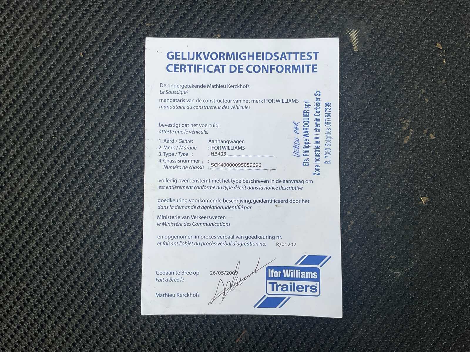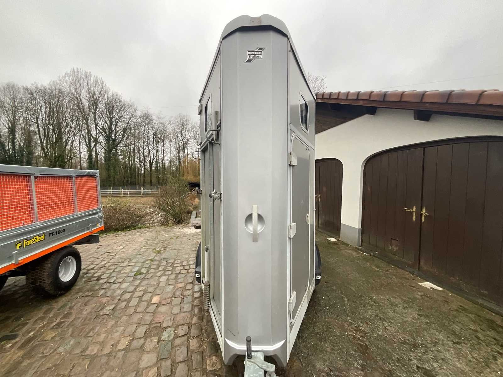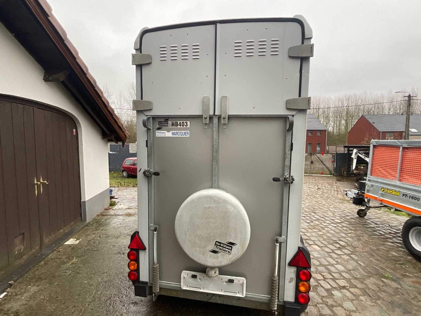 Ifor Williams paardenwagen, model HB403, geschikt voor het vervoeren van paarden, uitgerust met een dubbele as en een remsysteem. De bestelwagen heeft een zijdeur met schuifraam, scharnierende achterdeuren, een binnenwand, borststangen en een slipvrije rubberen vloer. Gegalvaniseerd frame. Reservewielhouder met wiel aanwezig. Belangrijkste kenmerken: Merk: Ifor Williams Model / Type: HB403 Jaar: 2009 Chassisnummer (VIN): SCK40000095059696 GVW: 1.600 kg Configuratie: 2 zitplaatsen Assen: dubbele as (800 kg per as) Remmen: Geremde aanhanger Zijdeur: ja, met raam Reservewiel: aanwezig Status: De bestelwagen verkeert in goede tot redelijke algehele staat, passend bij zijn leeftijd en gebruik. Aanwezigheid van gebruikssporen en krassen, vooral op de wielkasten. Functioneel interieur, zonder zichtbare structurele schade. Documenten: Conformiteitscertificaat aanwezig No Merk: Ifor Williams Model: HB403 Product type: Paardentrailer 1 1/2 Chassisnummer: SCK40000095059696 Kleur: Grijs Nationaliteit documenten: België