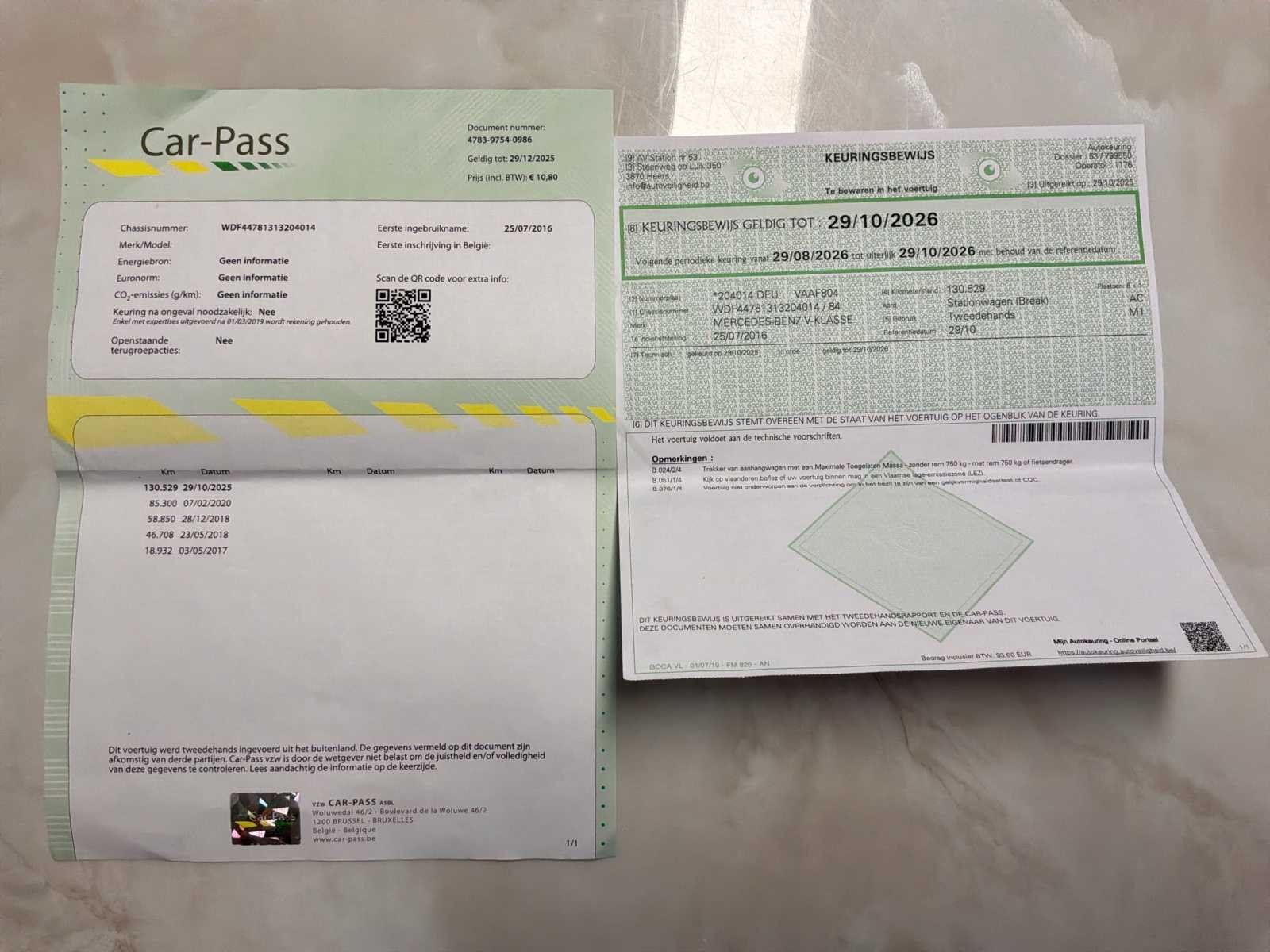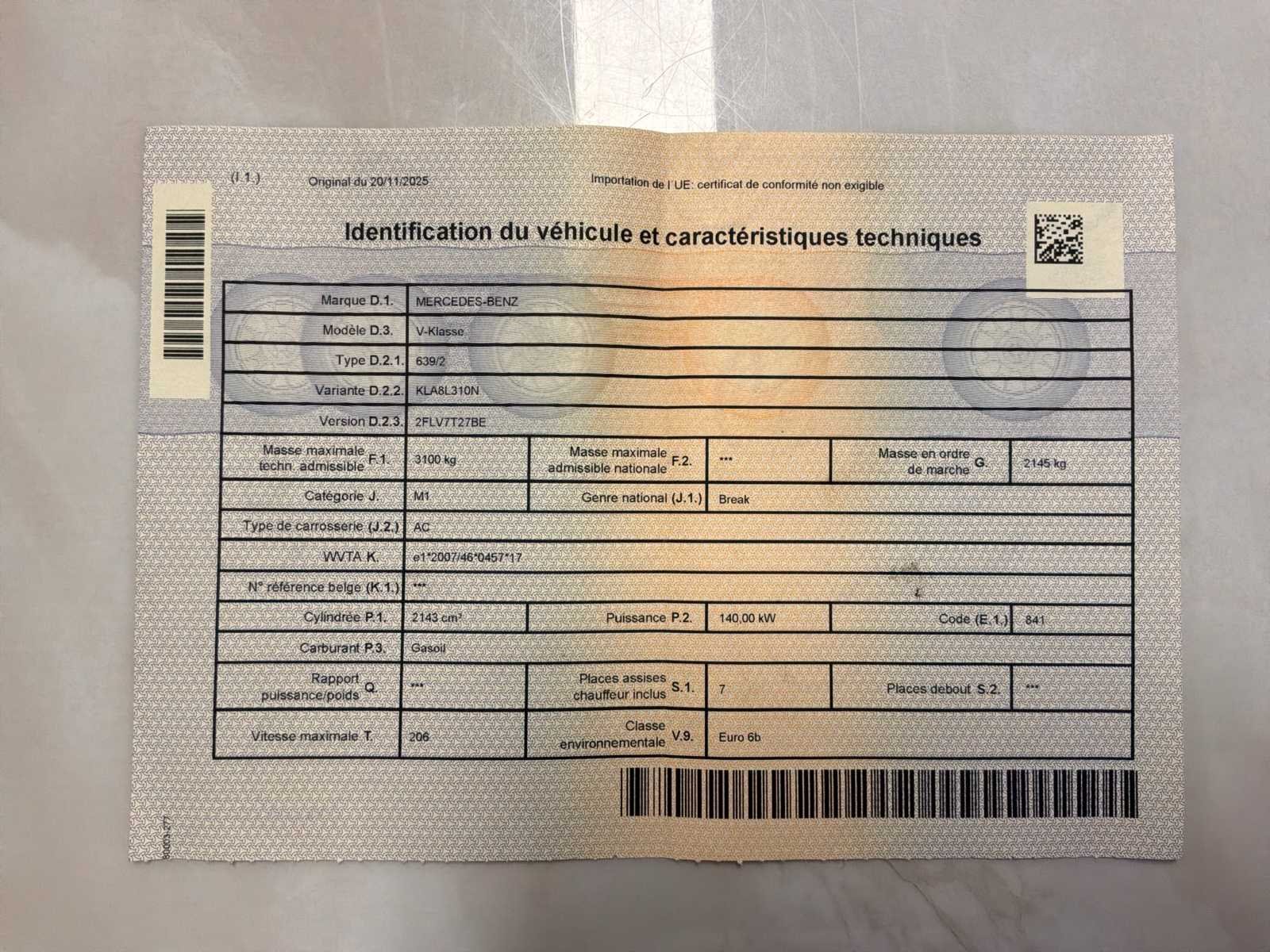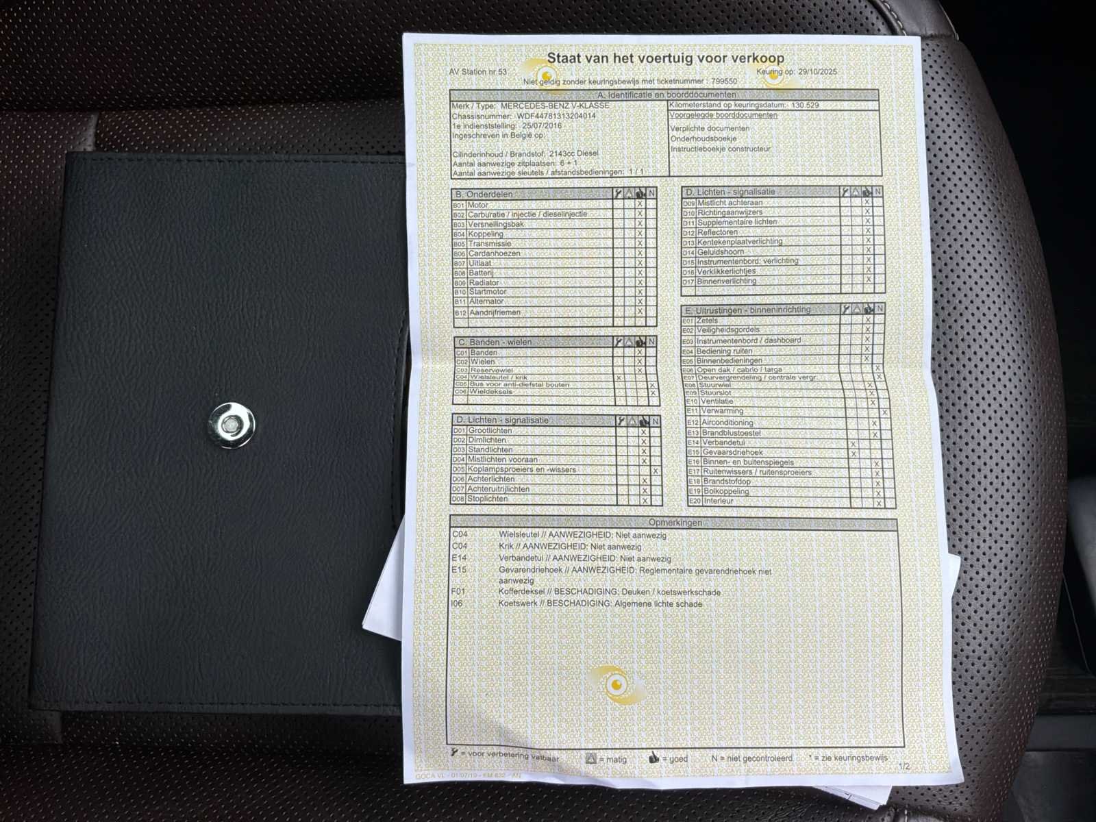 17-inch velg met winterbanden + 1 set 19-inch zomerbanden 360° camera Multifunctioneel stuurwiel Alleen parkeren Airconditioning be zone Middenarmleuning Koelkast Verwarmde en geklimatiseerde stoel Panoramisch schuifdak Elektrische schuifdeuren No Merk: Mercedes-Benz Model: V-250 Type: 639/2 Bouwjaar: 2016 Afgelezen kilometerstand: 139000km Cilinderinhoud: 2143cc Vermogen (kW): 140kW Brandstof: Diesels Chassisnummer: WDF44781313204014 Laadvermogen: 3100kg Datum eerste toelating: 25/07/2016 APK vervaldatum: 20/11/2026 Vermogen (pk): 190hp Energielabel: Euro 6b Aandrijving: Links Aantal zitplaatsen: 6 Maximaal trekgewicht ongeremd: 750kg Maximaal trekgewicht geremd: 750kg Kleur: Zwart Transmissie: Euro6 Automatisch Emissieklasse: Euro6b Aantal deuren: 5 Aantal sleutels: 2 Velgmaat: 17 Aantal cilinders: 4 Carrosserie: Multi Space (ac) Nationaliteit documenten: België CO2-uitstoot NEDC: 158 Onderhoudshistorie: 22/01/2026 Gelijkvormigheidsattest aanwezig: waar Carpass: waar Start en rijdt: OK Keuringsrapport geldig tot: 29/10/2026 Technische fiche: waar startinformatie : OK Vavato voert geen technische keuring uit.: waar Airconditioning: true Navigatie: true Xenon verlichting: true Leder bekleed: true Inschrijvingsbewijs - deel 1 : OK Inschrijvingsbewijs - deel 2: OK