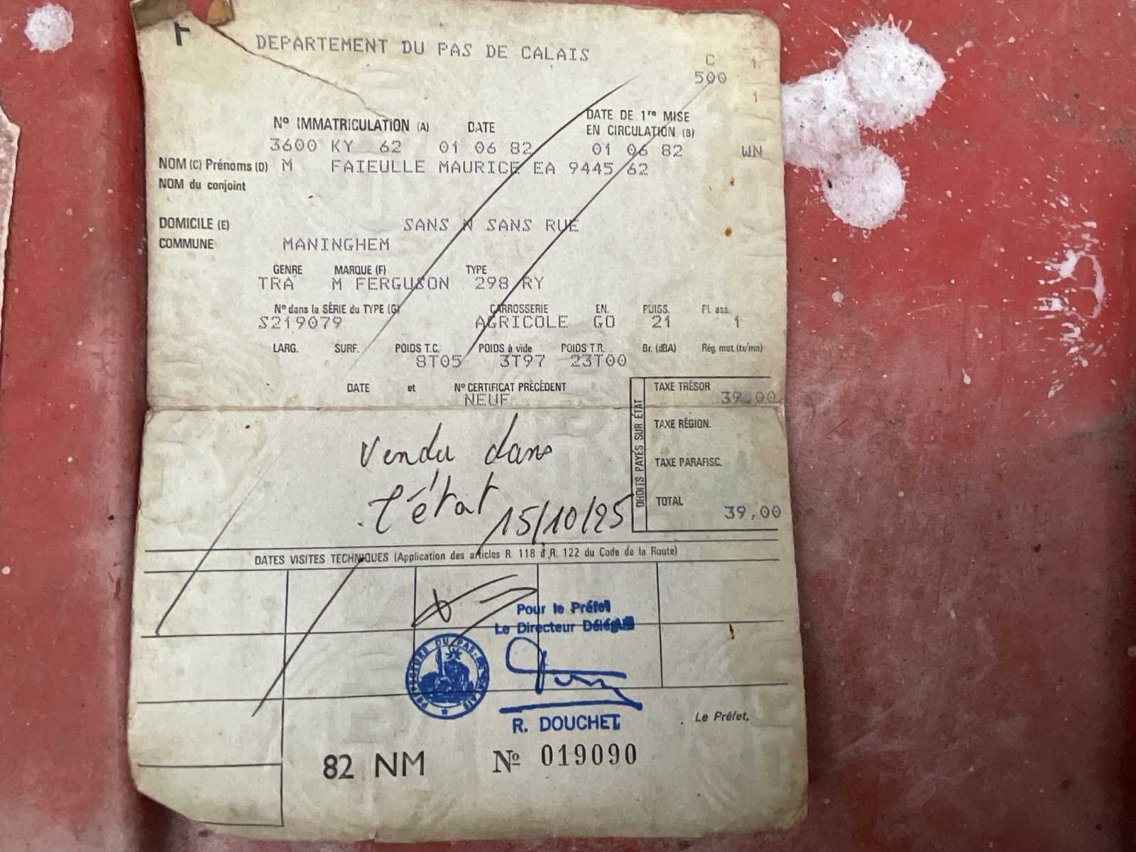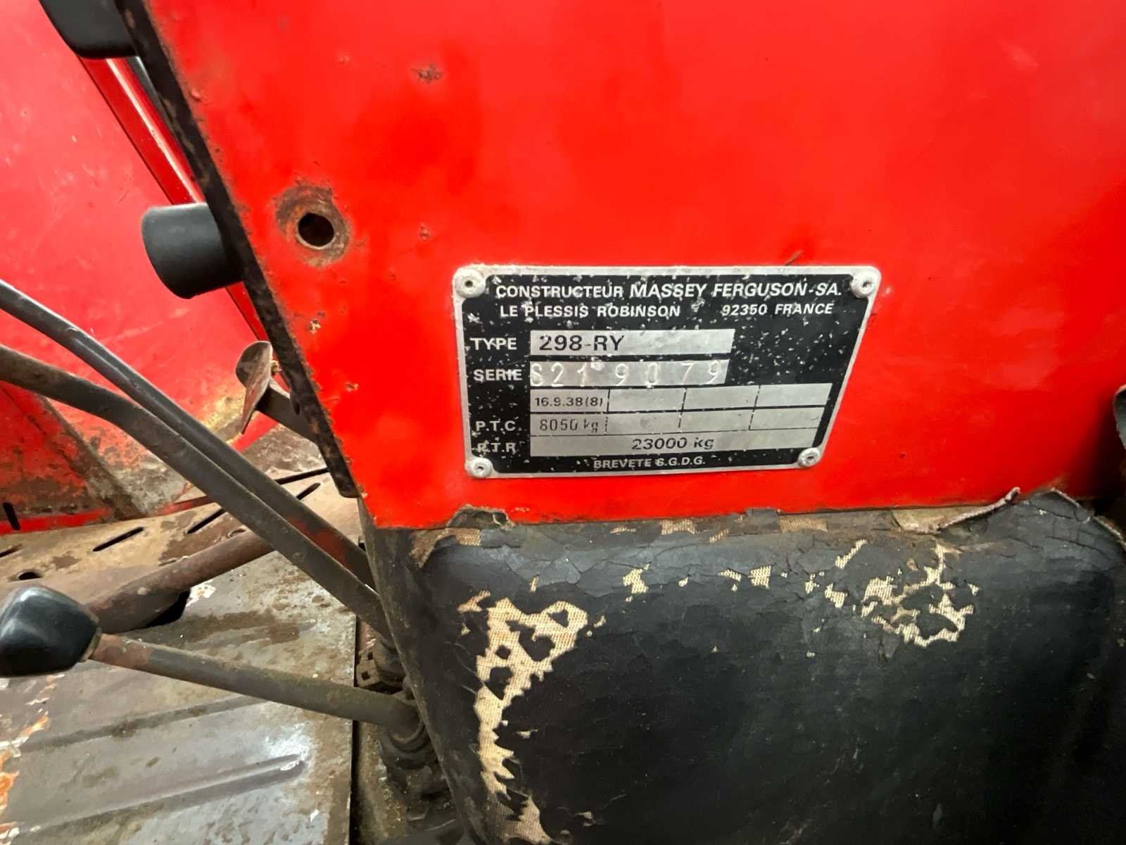 No Merk: Massey Ferguson Type: 298 Bouwjaar: 1982 Serienummer: S210979 Motorvermogen (kW): 70kW Afgelezen urenstand: 9419 Aftakastoerental: 540rpm Aantal hydraulische ventielen achter: 2 Bandenmaat achter: 480/70R38 Cabine: true Eigen gewicht: 3970kg Kentekenpapieren compleet?: true Chassisnummer: S219079 Datum eerste toelating: 01/06/1982 Nationaliteit documenten: FR