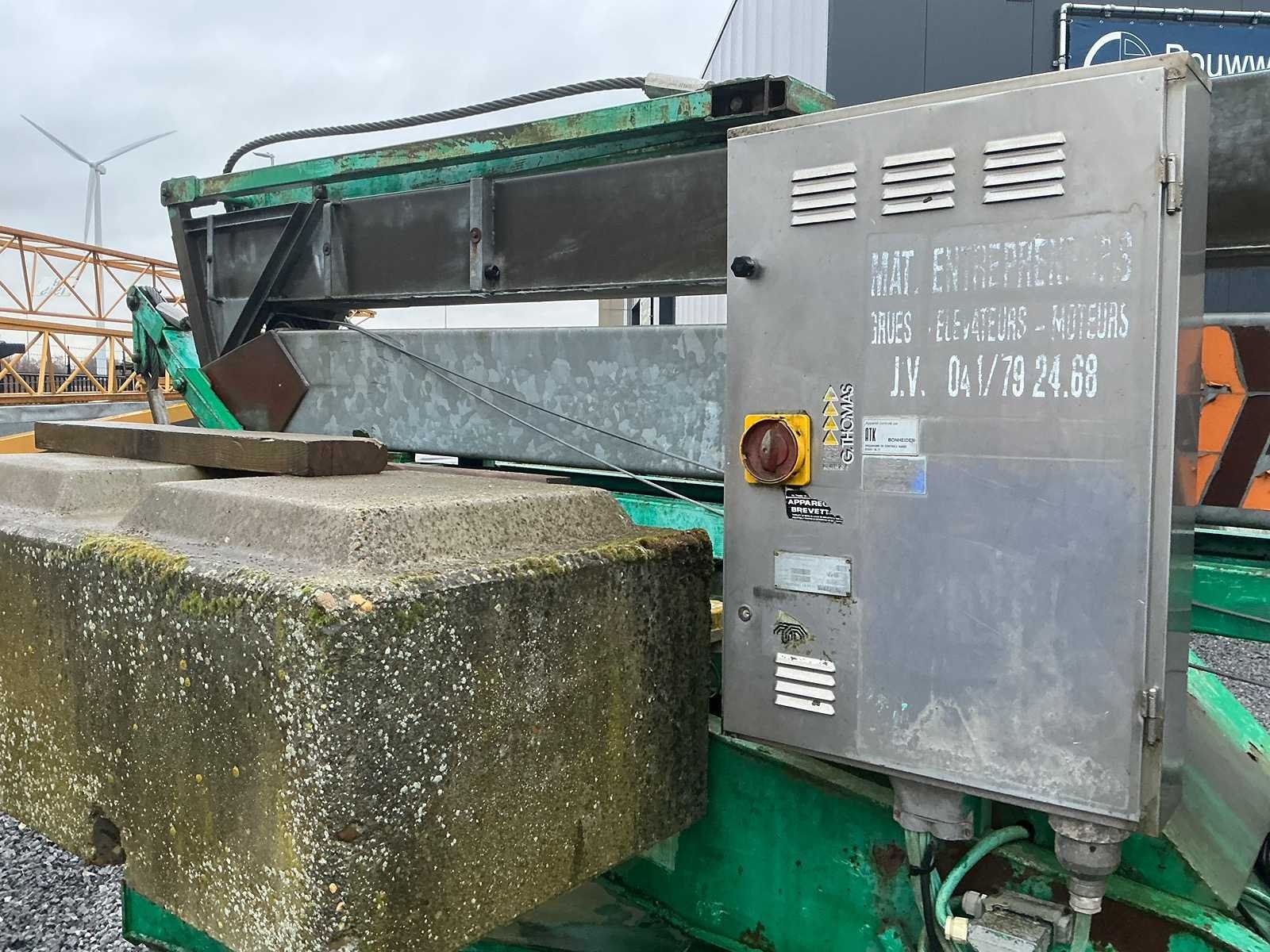 Mobiele Cattaneo giek-kraan van de maker C.M. Costruttrice Meccanica S.p.A. (Italië), type CM 61, bouwjaar 1989. De kraan is uitgevoerd met een horizontale (inschuifbare) giek, loopkat met hijshaak en een maximaal hefvermogen van 1.000 kg. Voorzien van een elektrische hijsinstallatie, bedrade afstandsbediening ( moet hersteld worden) en betonnen contragewichten. De kraan staat op een verrijdbaar onderstel met wielen en steunpoten voor positionering op het terrein. Ideaal voor verbouwing / klein tot middelgrote bouwwerken. Inclusief gewichtklem om de betonblokken te plaatsen. Werkt op gewone 230v stekker. Nee Merk: Cattaneo Type: CM 61 230v Bouwjaar: 1989 Serienummer: 3467 MI 85 Max. hijscapaciteit: 1000kg Met afstandsbediening (bedraad): true