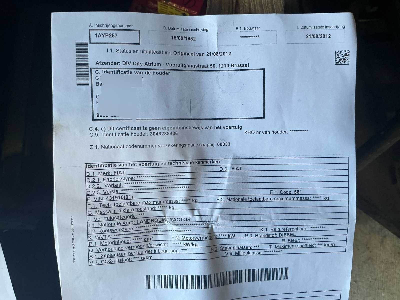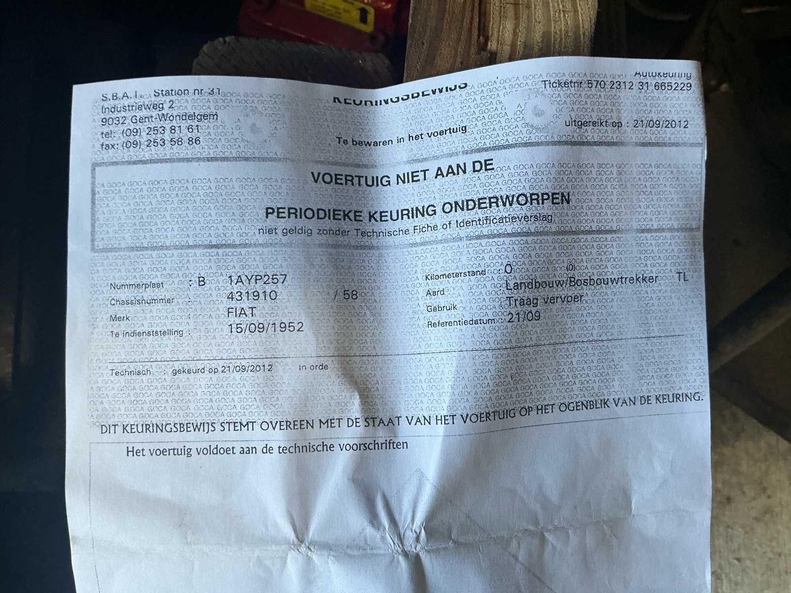 Originele documenten zullen bij afhaling aanwezig zijn No Merk: Fiat Type: 411R Bouwjaar: 1952 Kenteken: 1AYP257 Afgelezen urenstand: 3006 Chassisnummer: 431910
