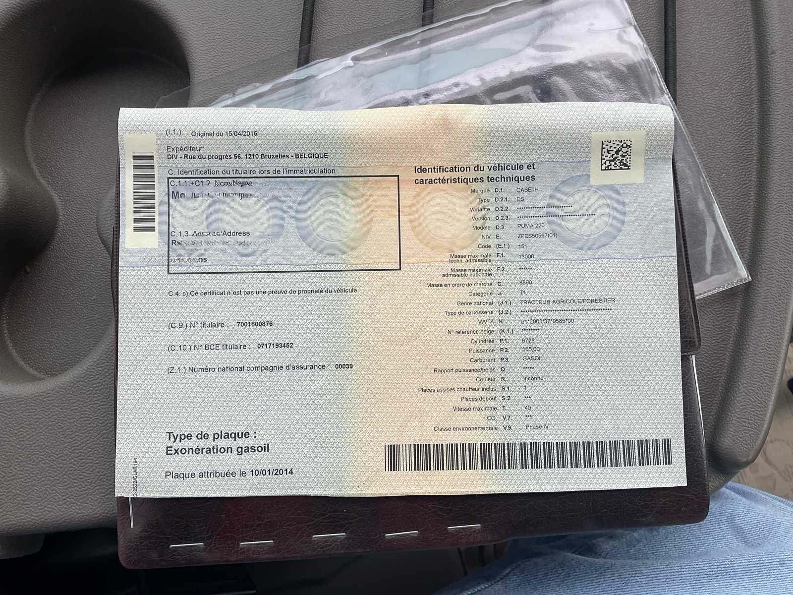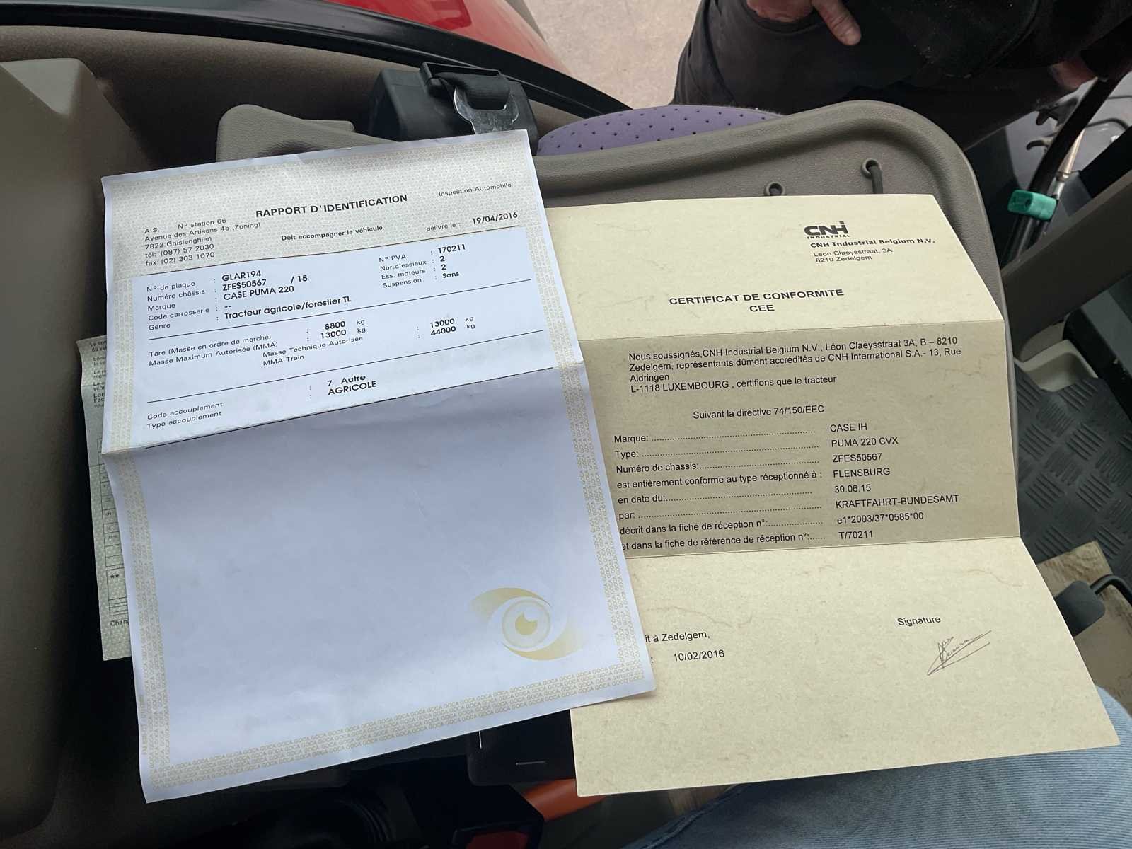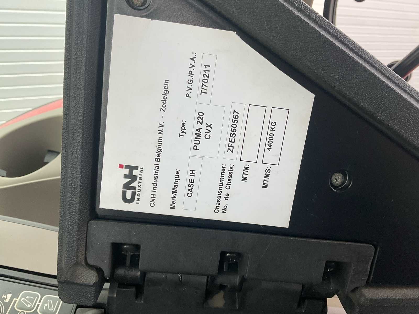 Merk: Case IH Model: Puma 220 CVX Type: Landbouwtractor Transmissie: CVX (Continu Dimbaar) Chassisnummer (VIN): ZFES50567 Bouwjaar: 2016 Datum van eerste inschrijving: 15/04/2016 Openingstijden Zichtbare uurmeter: 4161,2 uur Cabine & Elektronica Hangende gesloten cabine Case IH AFS Pro 700 Terminal (Functioneel Display, Zichtbaar Display) CVX multifunctionele joystick Uitgebreide bedieningsconsole Airconditioning / verwarming (plafondblok zichtbaar) Radio geïnstalleerd Case IH Geschorste Bestuurdersstoel Ruitenwisser voor de voorruit Werklichten voor en achter Draaiende daklampen Banden (bevestigd) Voor: Michelin 600/65 R28 Achter: Michelin 650/85 R38 Visuele conditie: goede, duidelijk zichtbare sculpturen Uitrusting Voor: Hydraulische voorste schakel Voorste koppeling Voorste hydraulische doppen Achter: Hydraulische achterste verbinding Derde hydraulisch punt Achterste hydraulische doppen Achterste PTO (PTO) Massa's & Technische Gegevens (Documenten) Maximaal toegestane massa (MTM): 13.000 kg Maximaal technisch gewicht: 44.000 kg Ontvangsttype: PUMA 220 CVX EEG-conformiteitscertificaat aanwezig Belgisch registratiebewijs aanwezig Identificatierapport aanwezig 2️⃣ Algemene staat (alleen op basis van foto's) Volledige tractor, geen zichtbare ontbrekende onderdelen Schone cabine, bekleding in goede visuele staat Visueel functionele bedieningselementen, display en dashboard Normale slijtage gerelateerd aan landbouwgebruik Geen zichtbare structurele schade No Merk: Case IH Type: Puma 220 CVX Bouwjaar: 2016 Serienummer: ZFES50567 Afgelezen urenstand: 4161 Load sensing: true Frontgewichtenset: true Voorlader: true Fronthefinrichting: true Frontaftakas: true Cabine: true Luchtgeveerde stoel: true Chassisnummer: ZFES50567