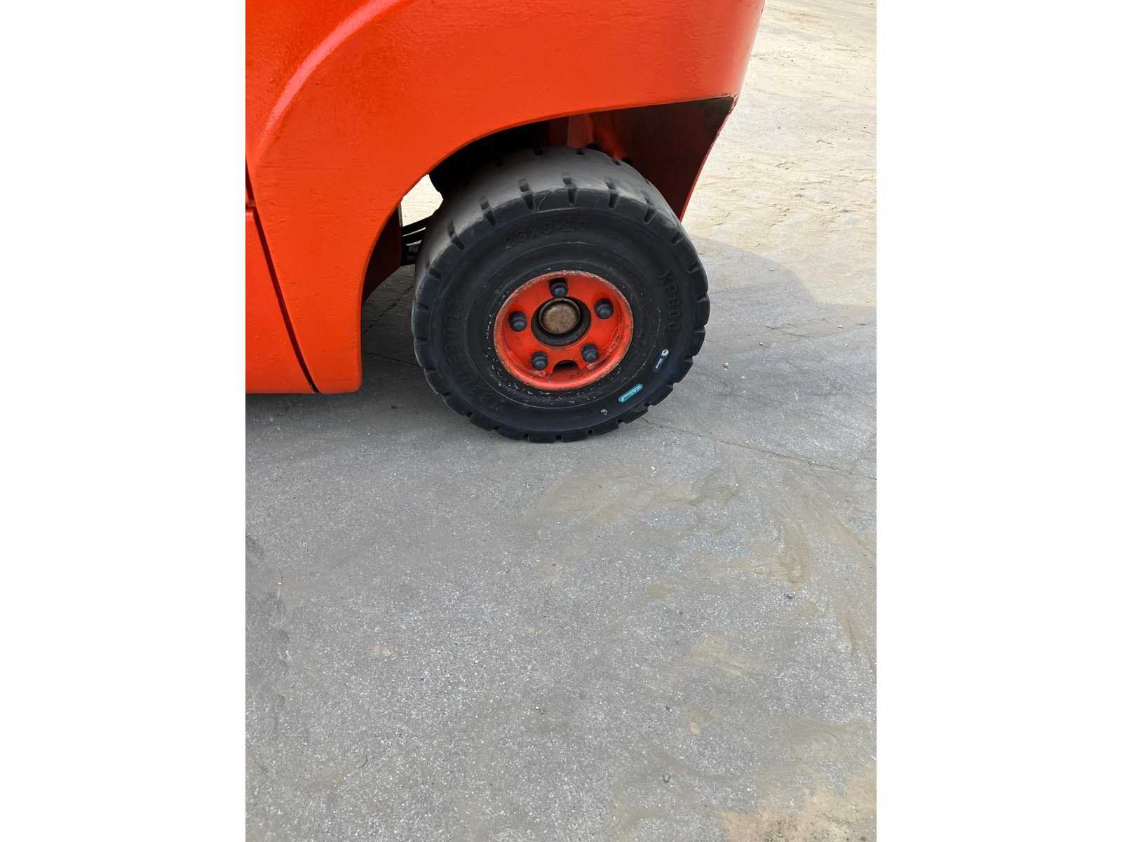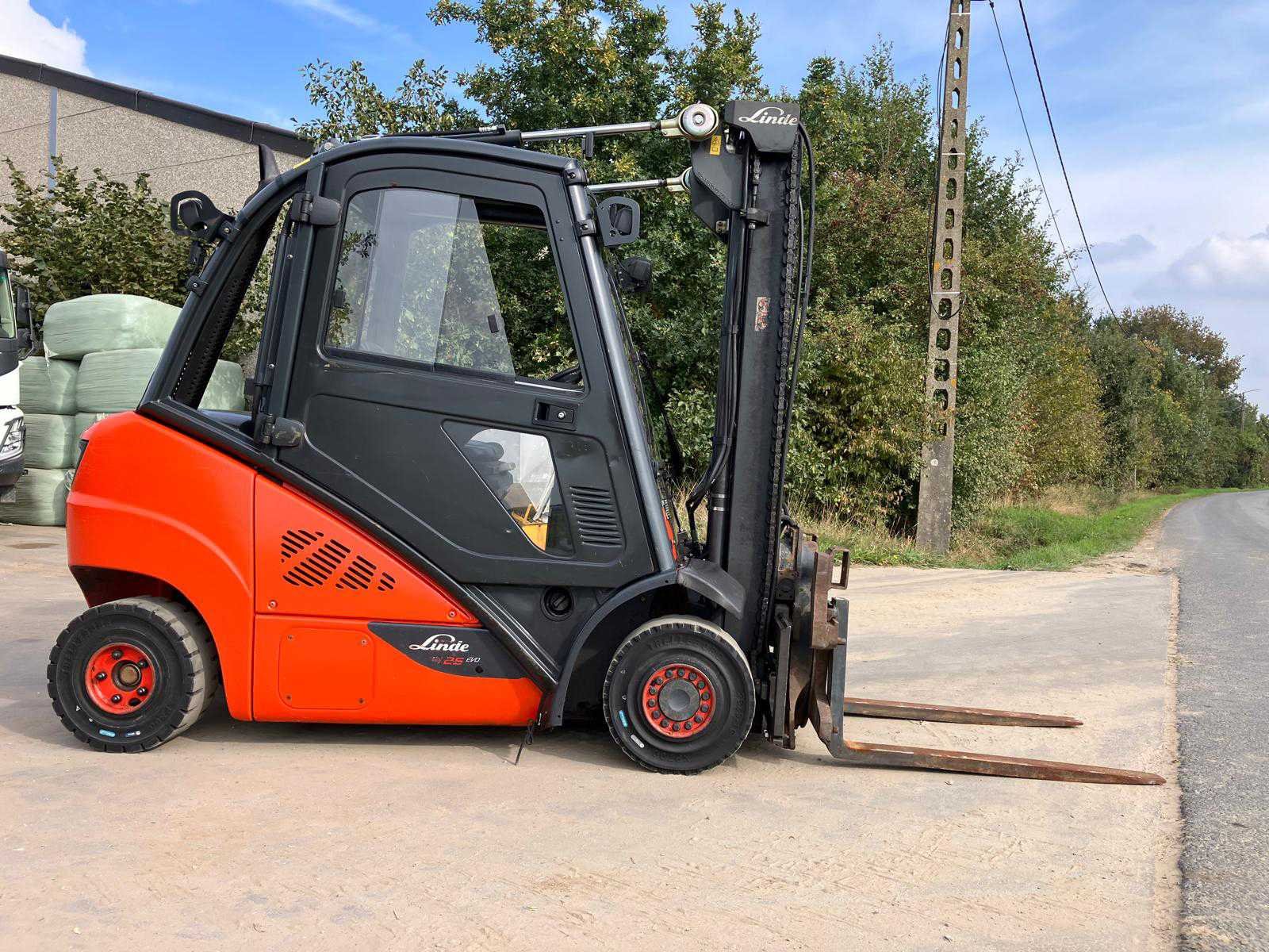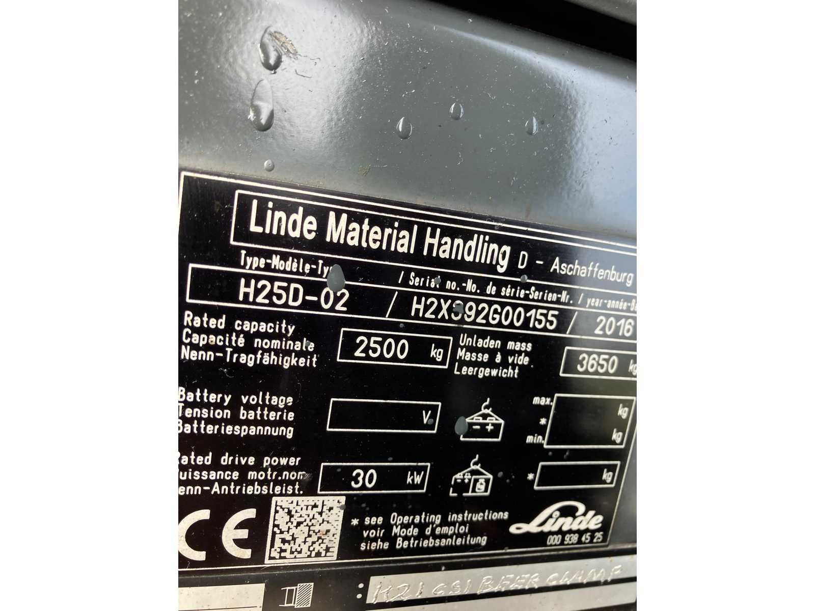 No Merk: Linde Type: H25D Bouwjaar: 2016 Serienummer: H2X392G00155 Brandstof: Diesel Mast: Duplex Soort band: Volrubber banden Aantal wielen: 4 Afgelezen urenstand: 7048 Roterend vorkenbord: true Duplex mast: true Eigen gewicht: 3650kg Hefvermogen: 2500kg Lepellengte: 1200mm Max. hefhoogte: 3500mm Totale afmeting L: 2500mm Totale afmeting Breedte: 1150mm Totale afmeting Hoogte: 2400mm