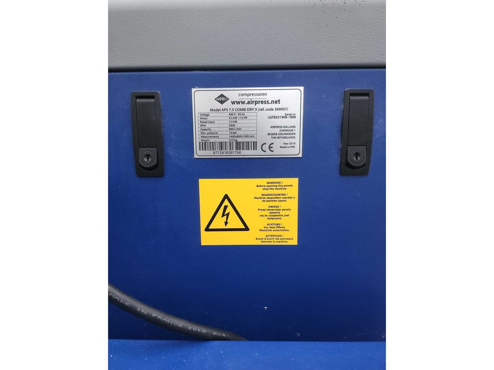 Bekeerd in perfecte conditie Nee Merk: Airpress Type: APS 7.5 Comby Dry x Bouwjaar: 2019 Serienummer: 369007 Vermogen: 5,5kW Aansluiting: 400V Eigen gewicht: 310kg