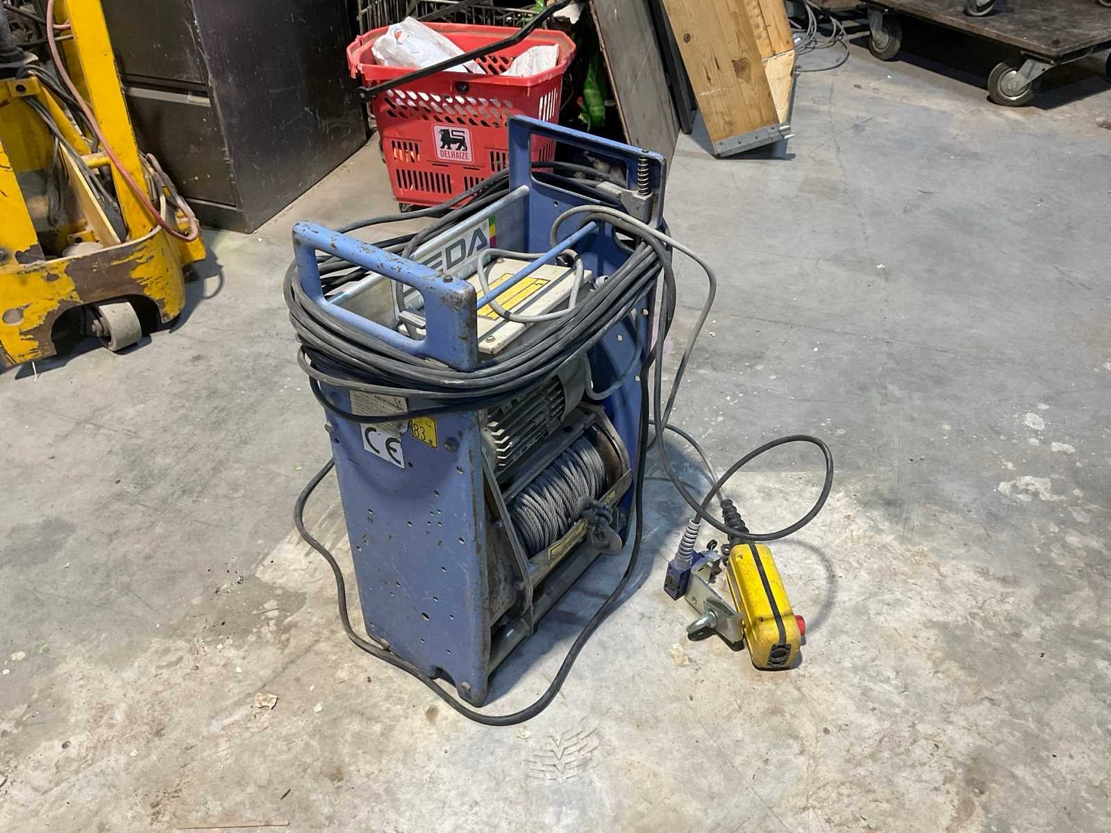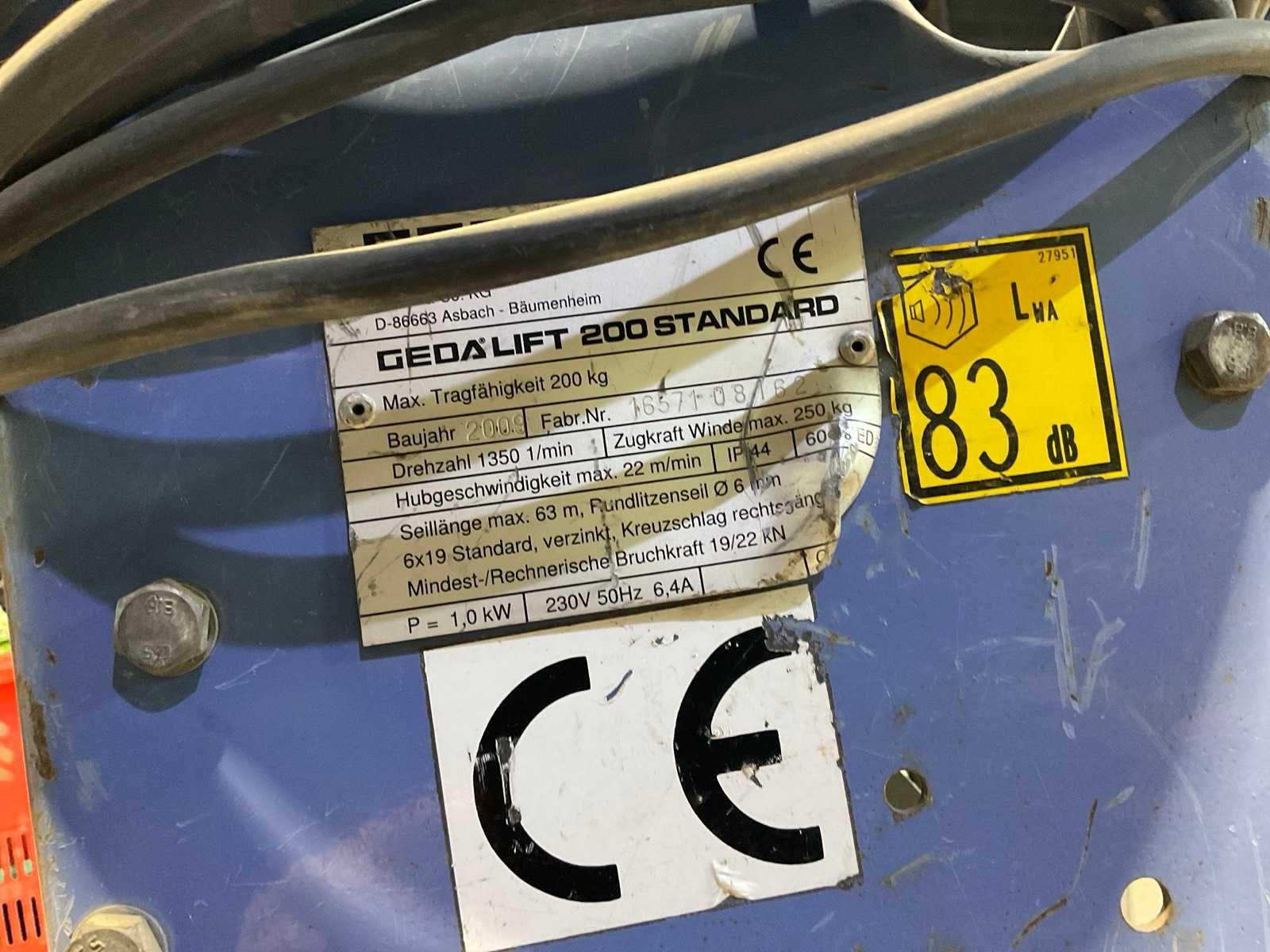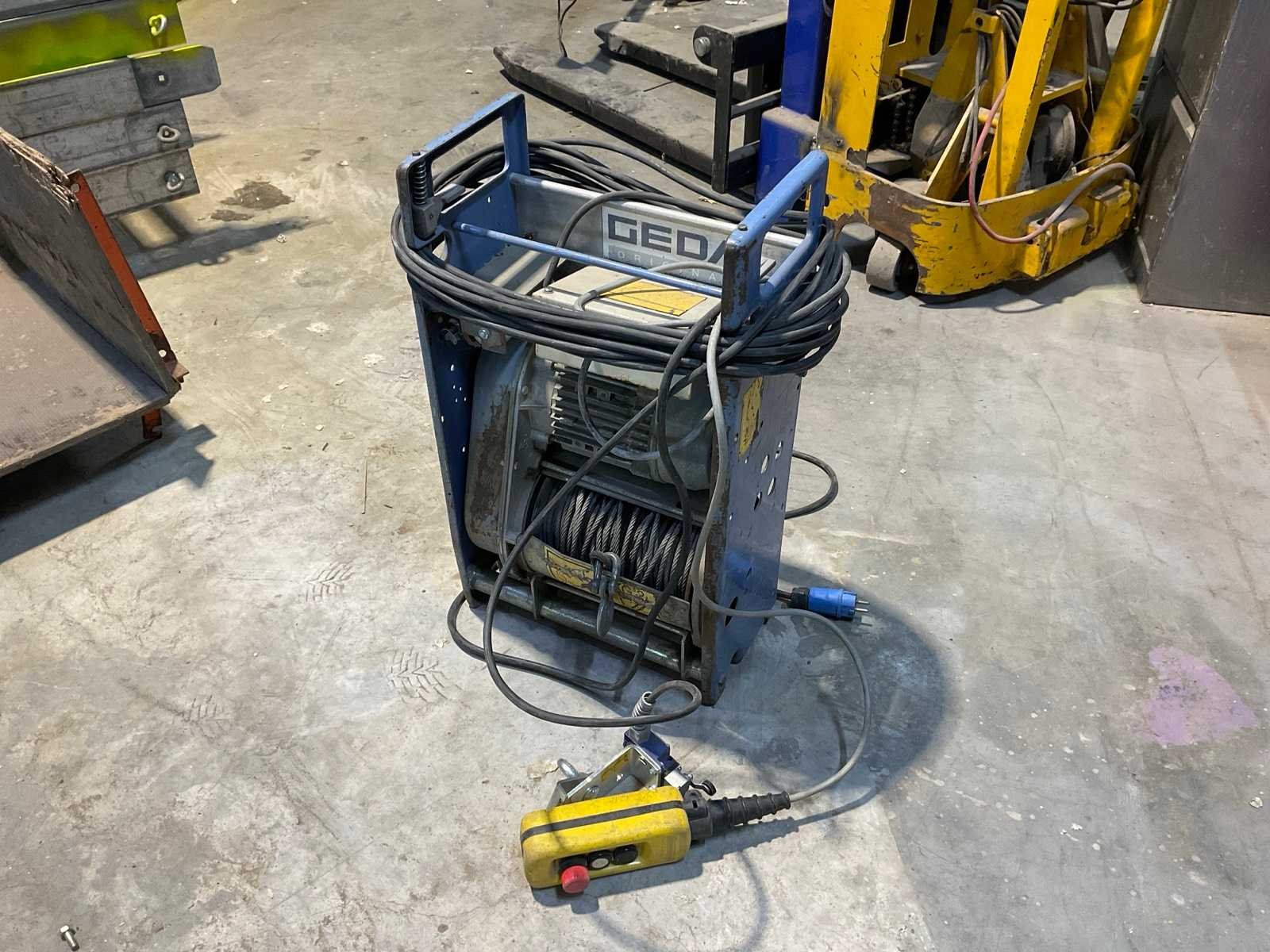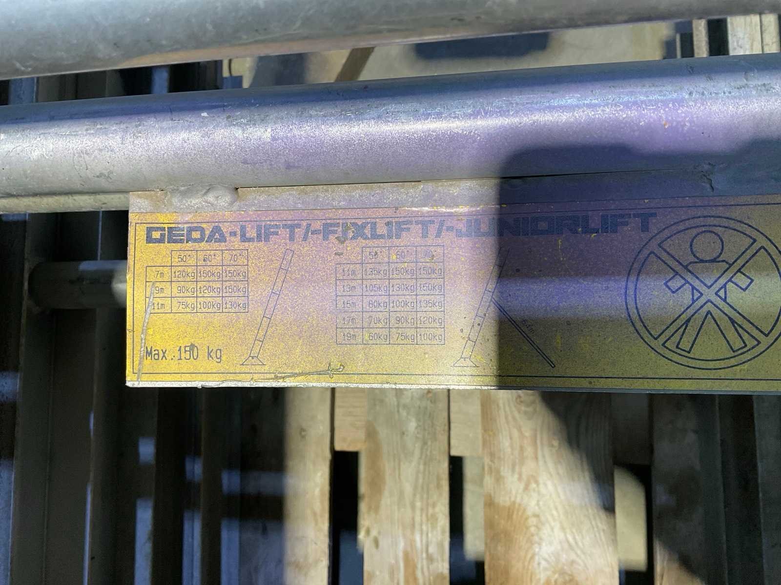 In werkende staat, 1versnelling Nee Merk: Geda-lift Bouwjaar: 2009 Max. platformhoogte: 14m Max. belasting: 250kg Plateau afm. l: 1000mm Plateau afm. b: 75mm Met afstandsbediening (bedraad): true Motorvermogen (kW): 1kW Aansluiting: 230V