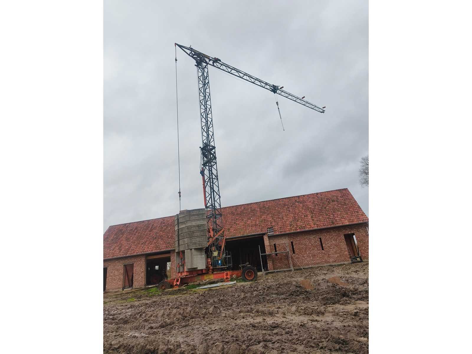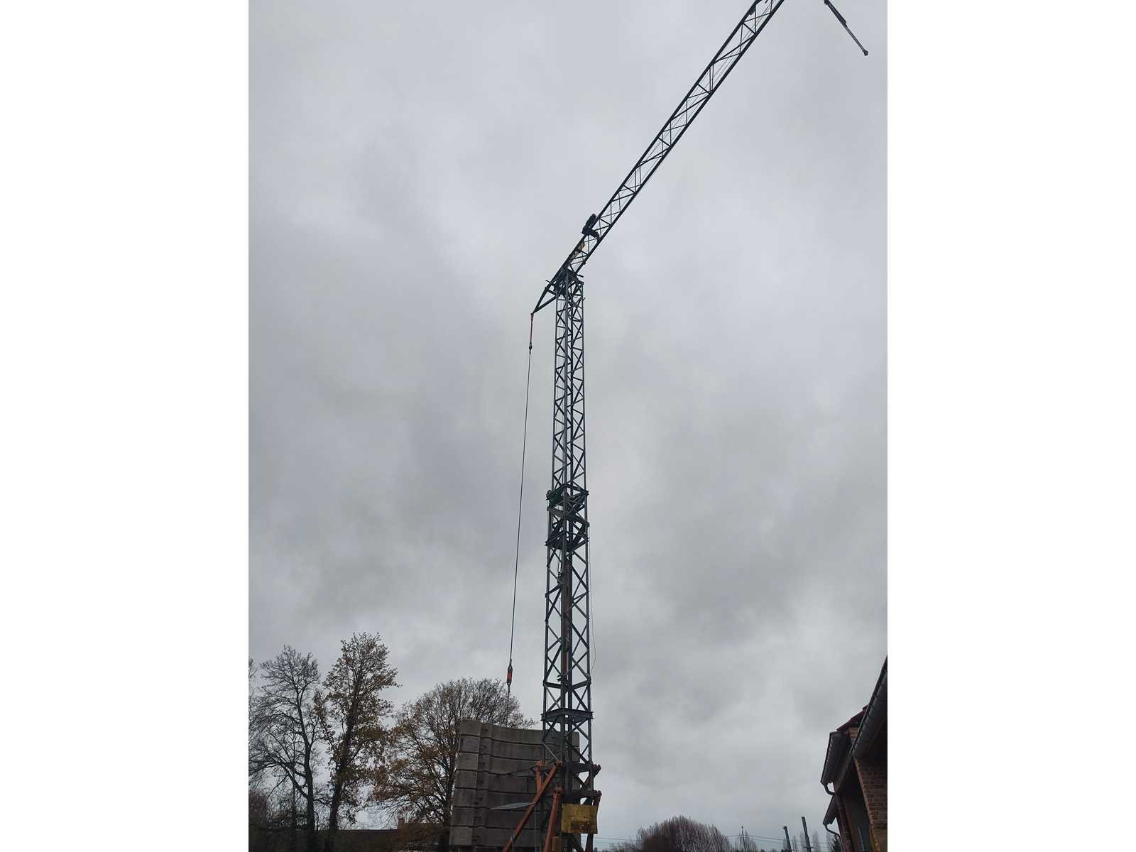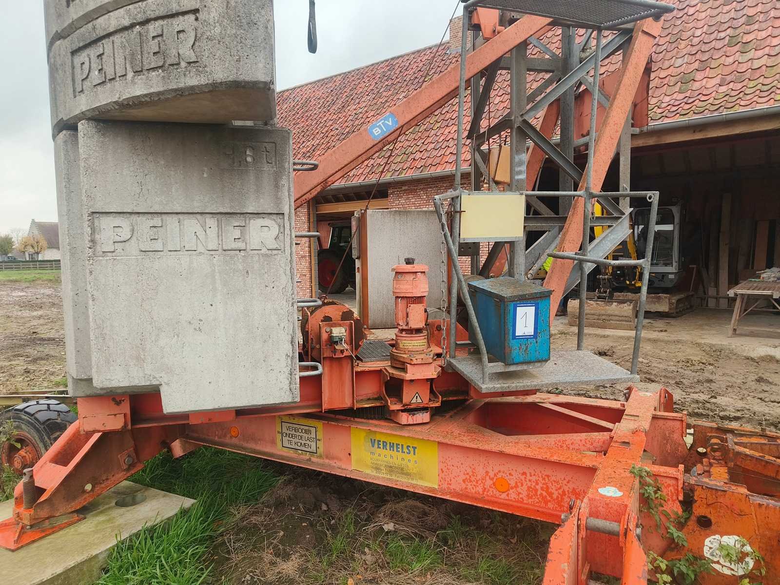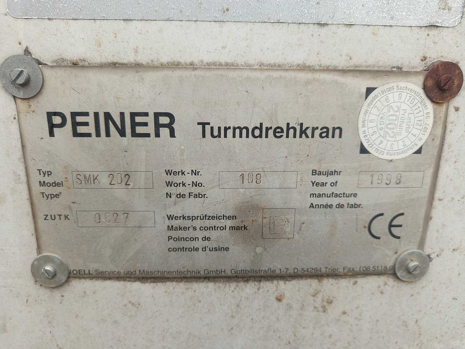 Demontage ten laste voor de koper. Opgesteld en af te breken in Nevele. Inbegrepen contragewichten: 1x 4600 kg / 7x 2000kg Inbegrepen 4 voetplaten: (120x120x15 cm) Inbegrepen pallethaak Totale afmetingen voor transport: 14700mm x 2500mm x 3700mm Nee Merk: Peiner Type: SMK202 Bouwjaar: 1998 Serienummer: 108 Max. hijscapaciteit: 2200kg Gieklengte: 25m Max. hijshoogte: 20m Met kraanboek: true