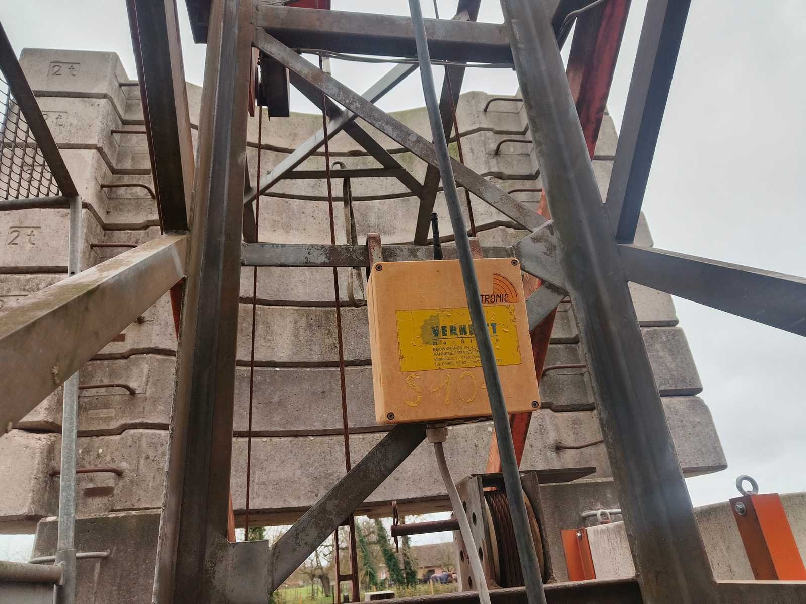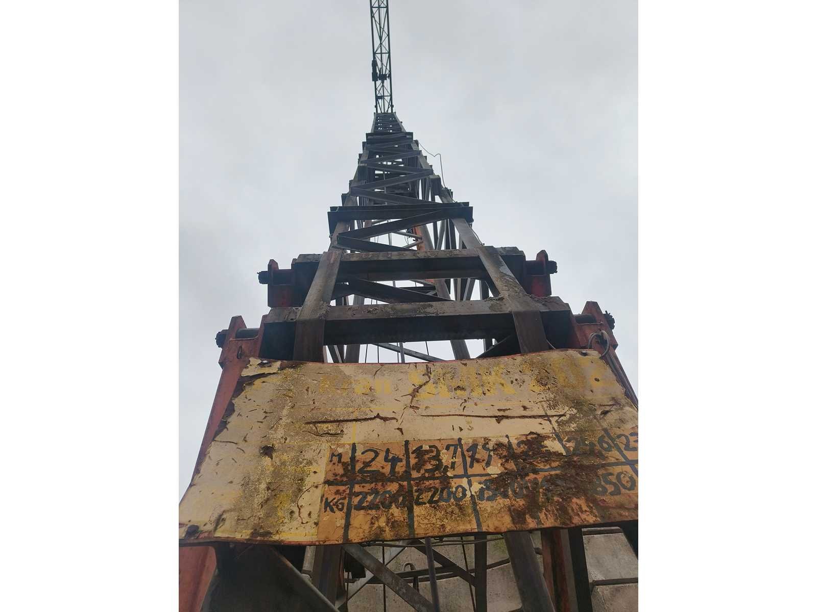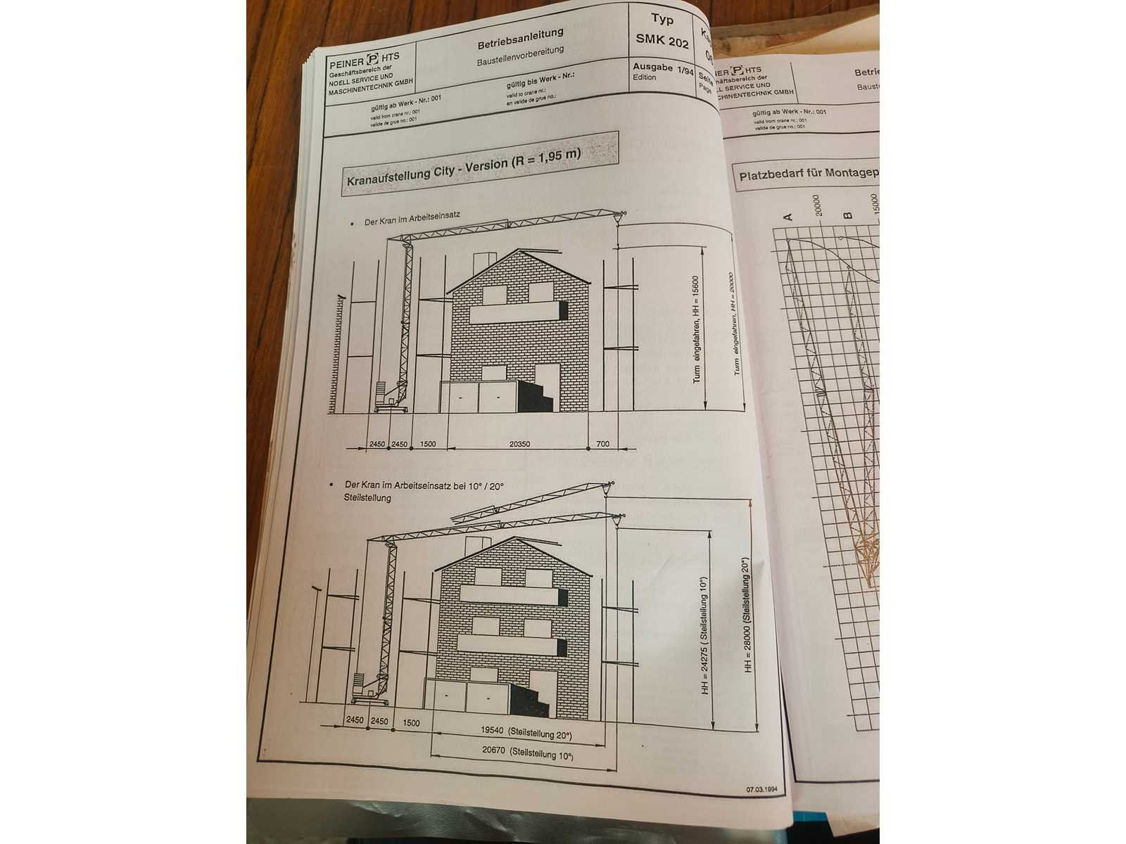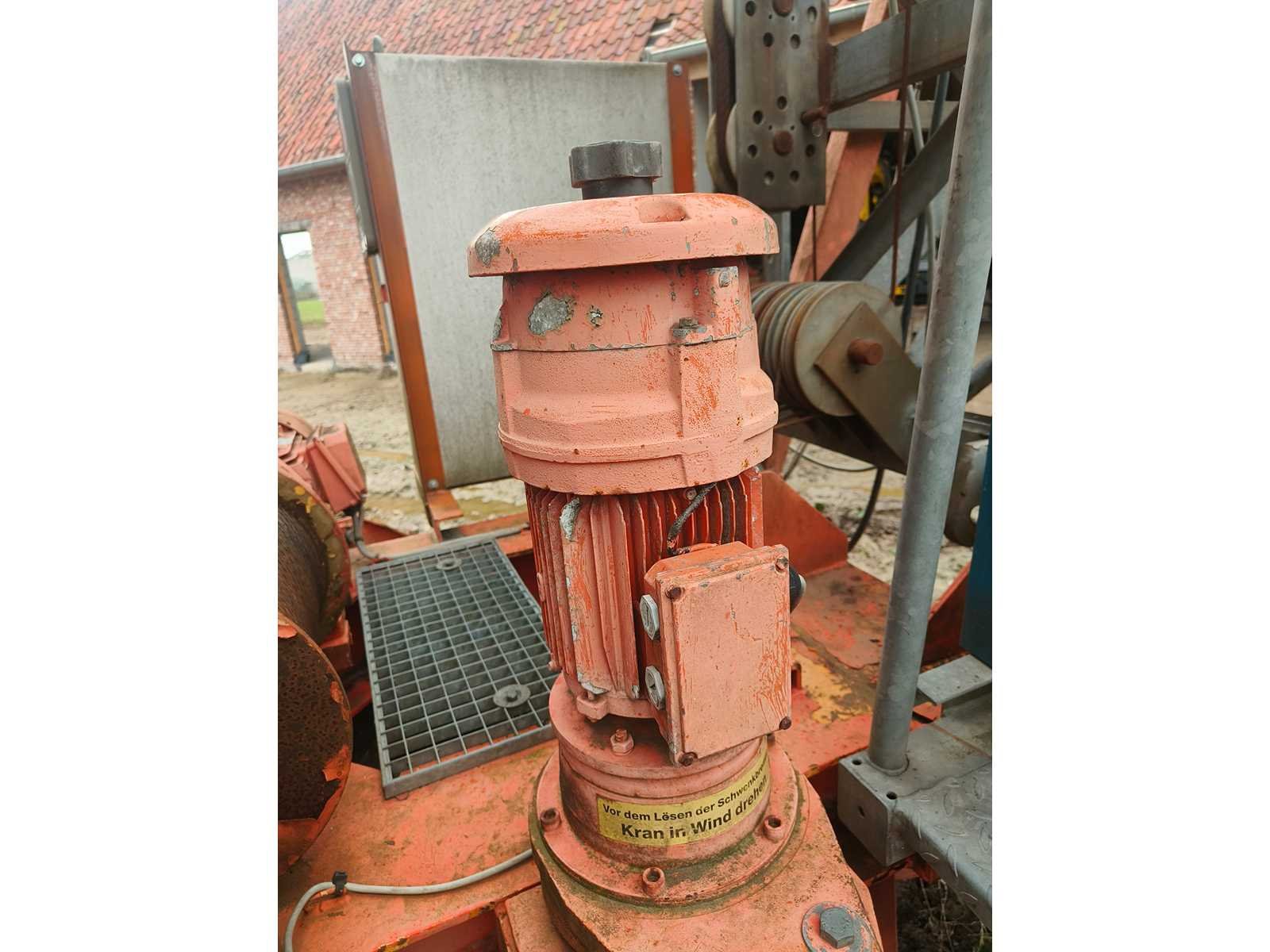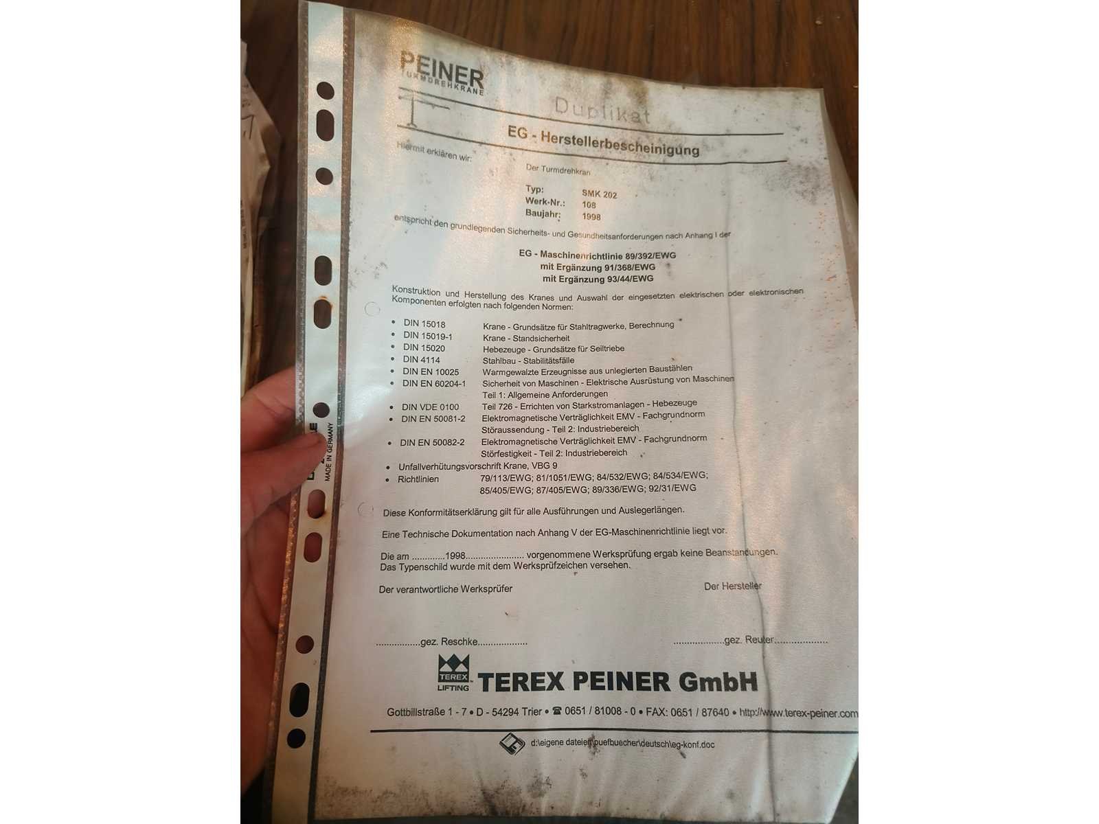 Demontage ten laste voor de koper. Opgesteld en af te breken in Nevele. Inbegrepen contragewichten: 1x 4600 kg / 7x 2000kg Inbegrepen 4 voetplaten: (120x120x15 cm) Inbegrepen pallethaak Totale afmetingen voor transport: 14700mm x 2500mm x 3700mm Nee Merk: Peiner Type: SMK202 Bouwjaar: 1998 Serienummer: 108 Max. hijscapaciteit: 2200kg Gieklengte: 25m Max. hijshoogte: 20m Met kraanboek: true