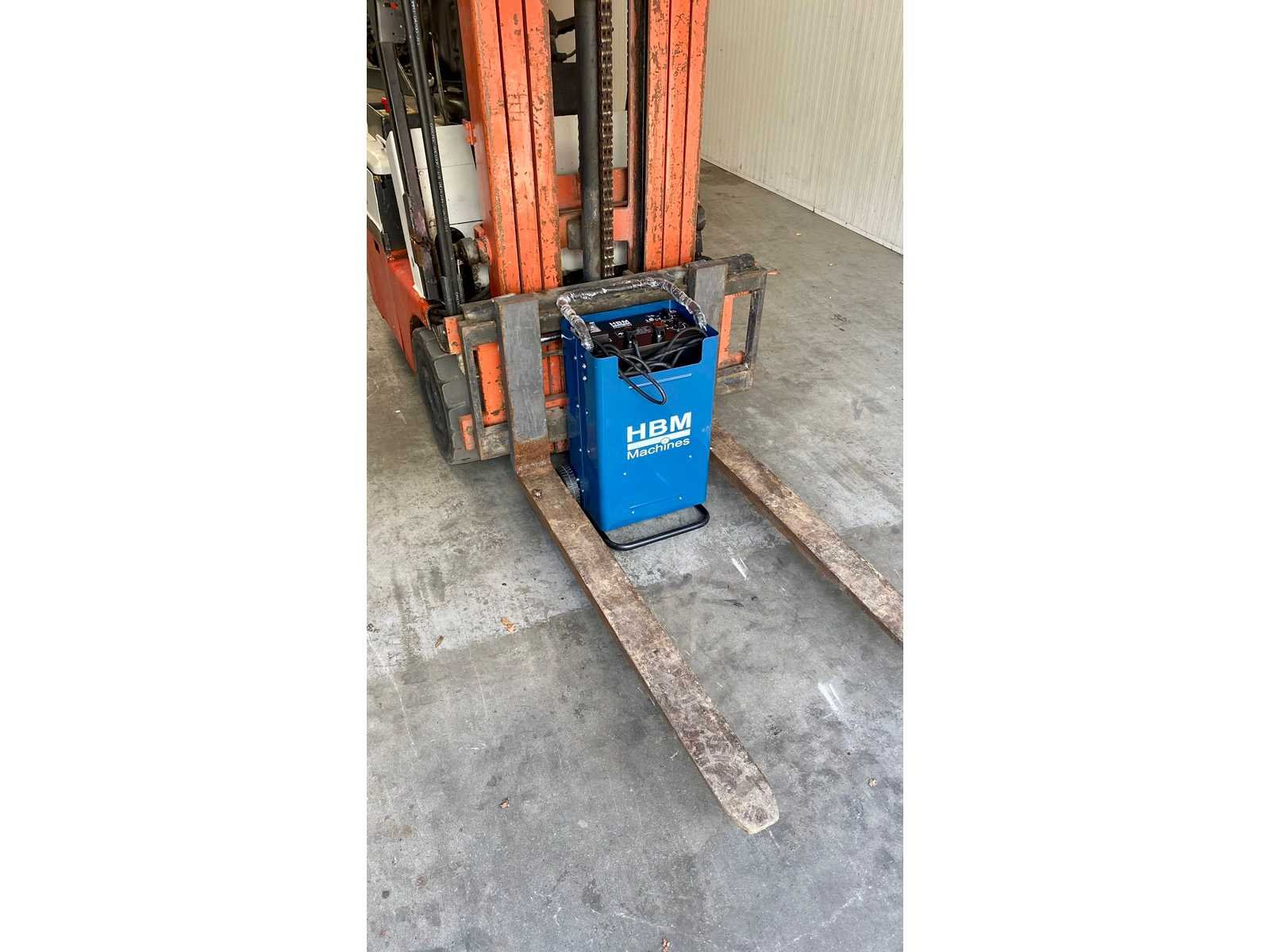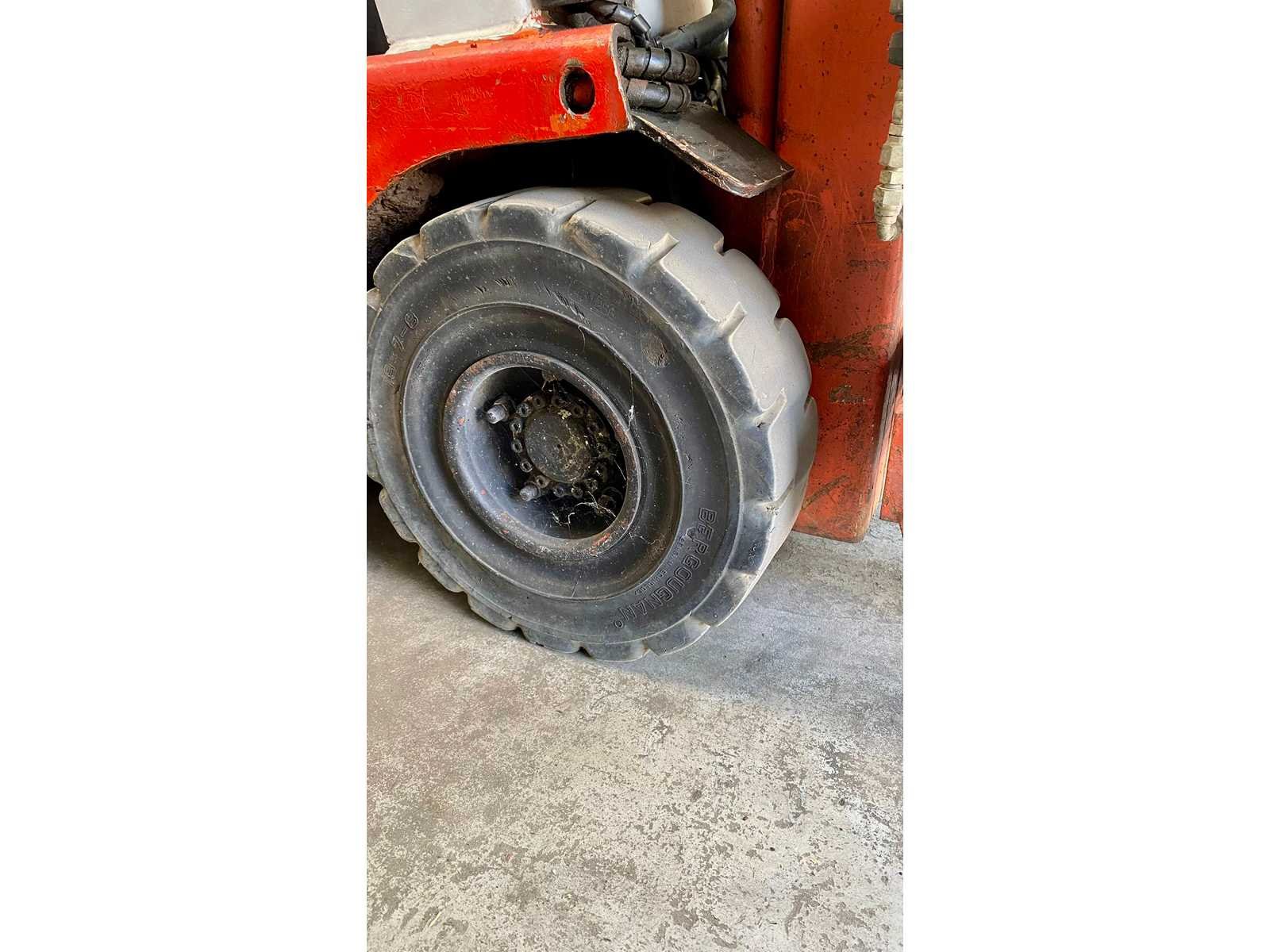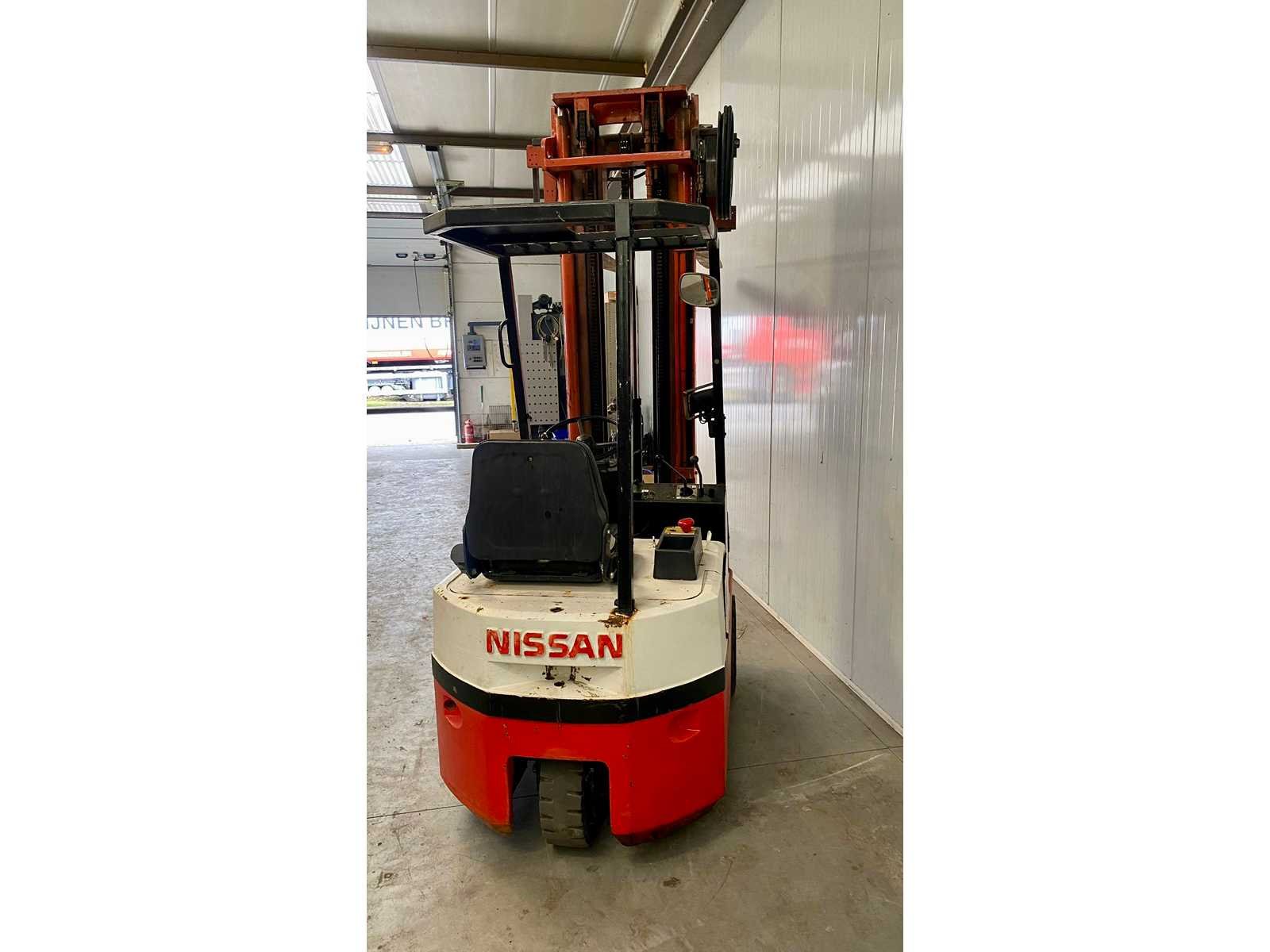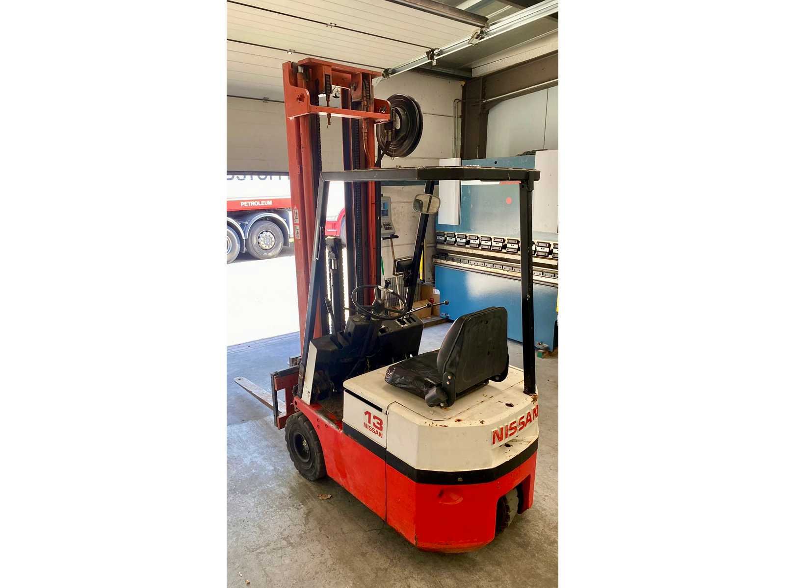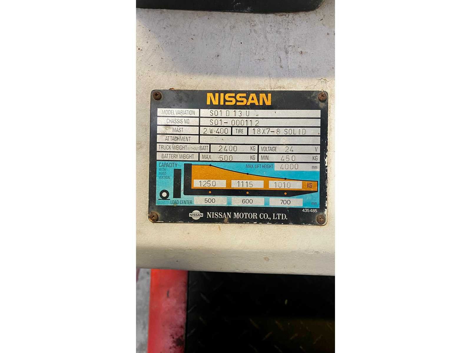 Nee Merk: Nissan Type: 1,3 ton S01 13U Serienummer: S01-000112 Brandstof: Elektrisch Soort band: Volrubber banden Aantal wielen: 3 Afgelezen urenstand: 15500 Accu lader: true Side-shift: true Roterend vorkenbord: true Eigen gewicht: 2400kg Hefvermogen: 1250kg Max. hefhoogte: 4000mm Vol rubber banden: true