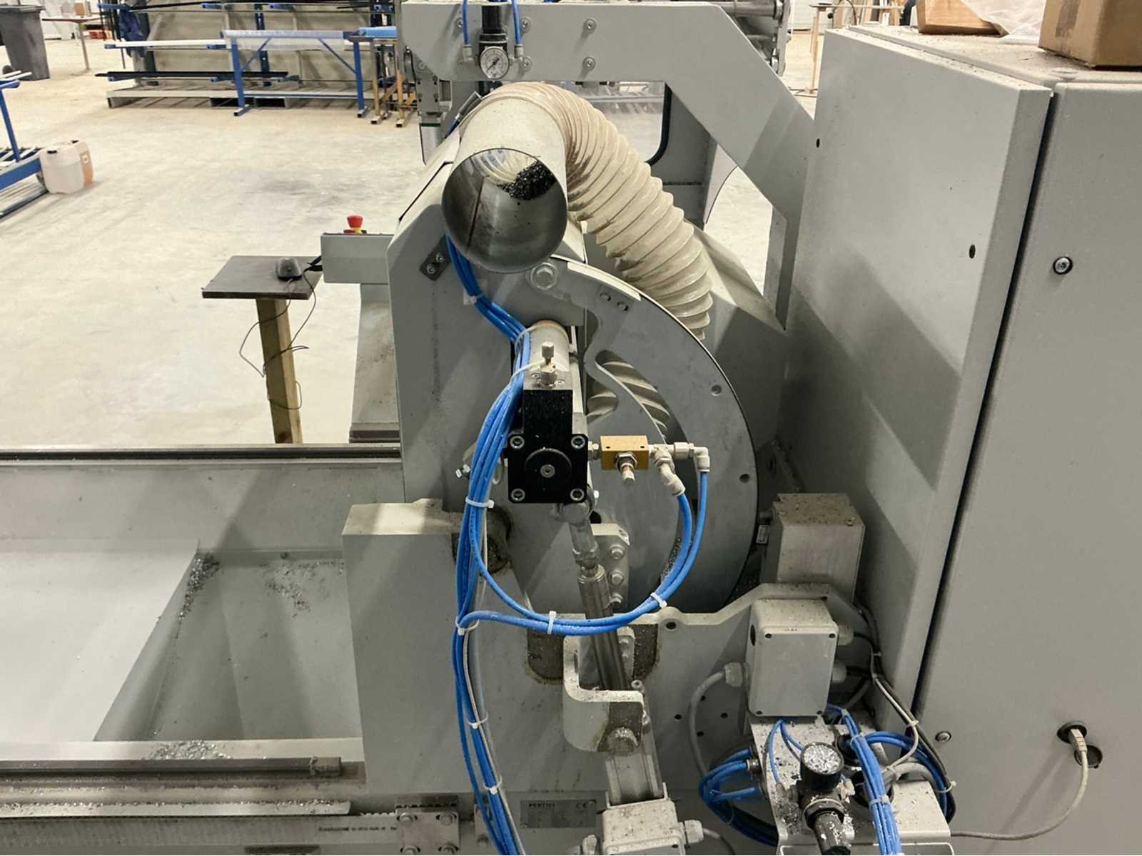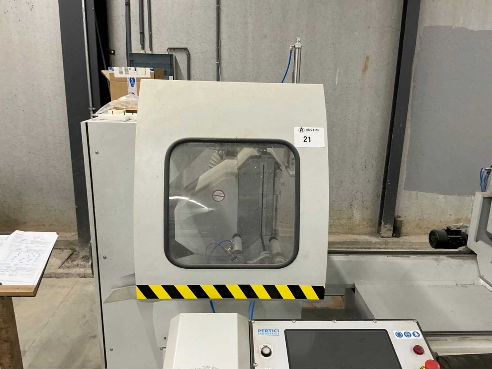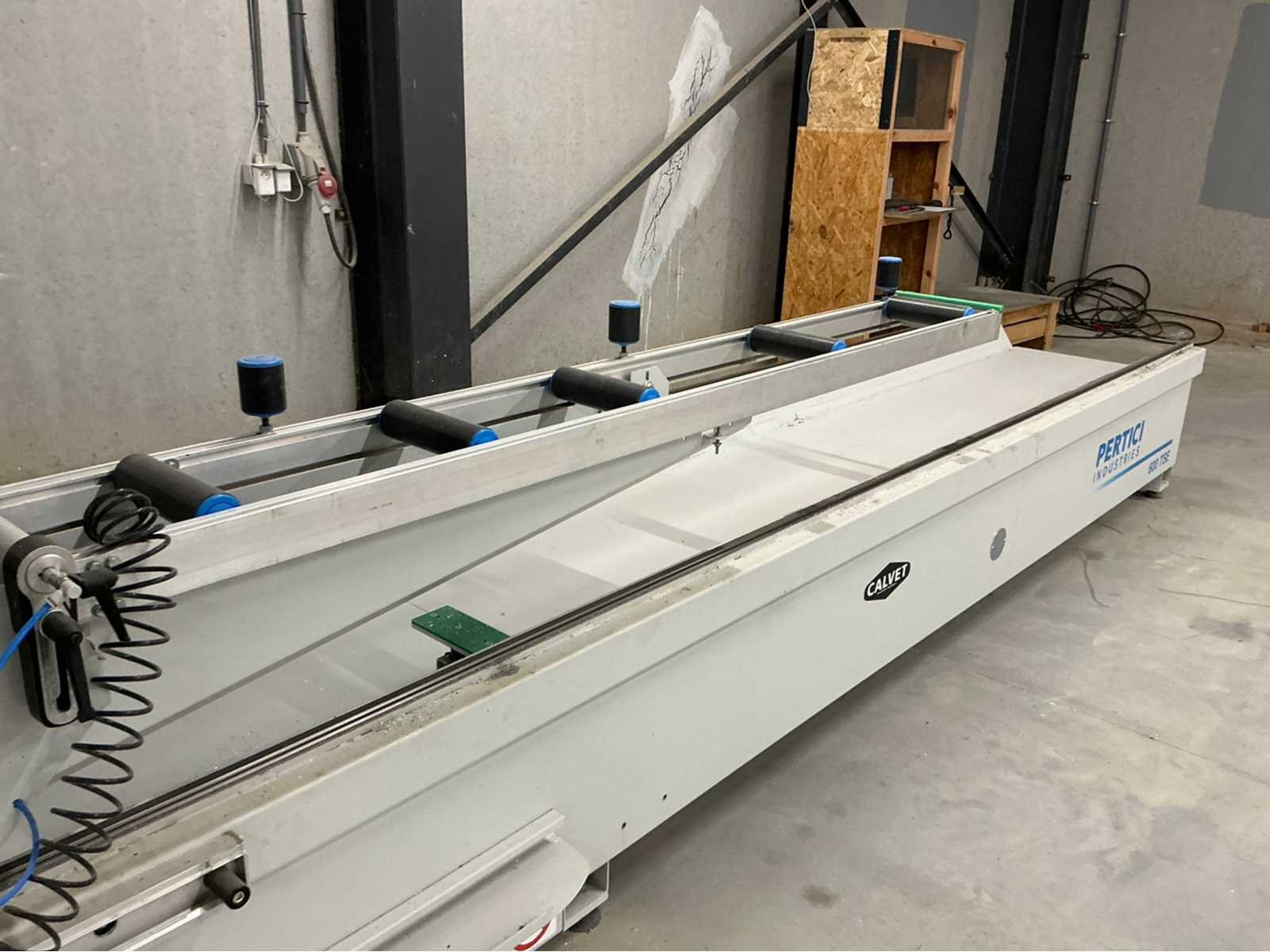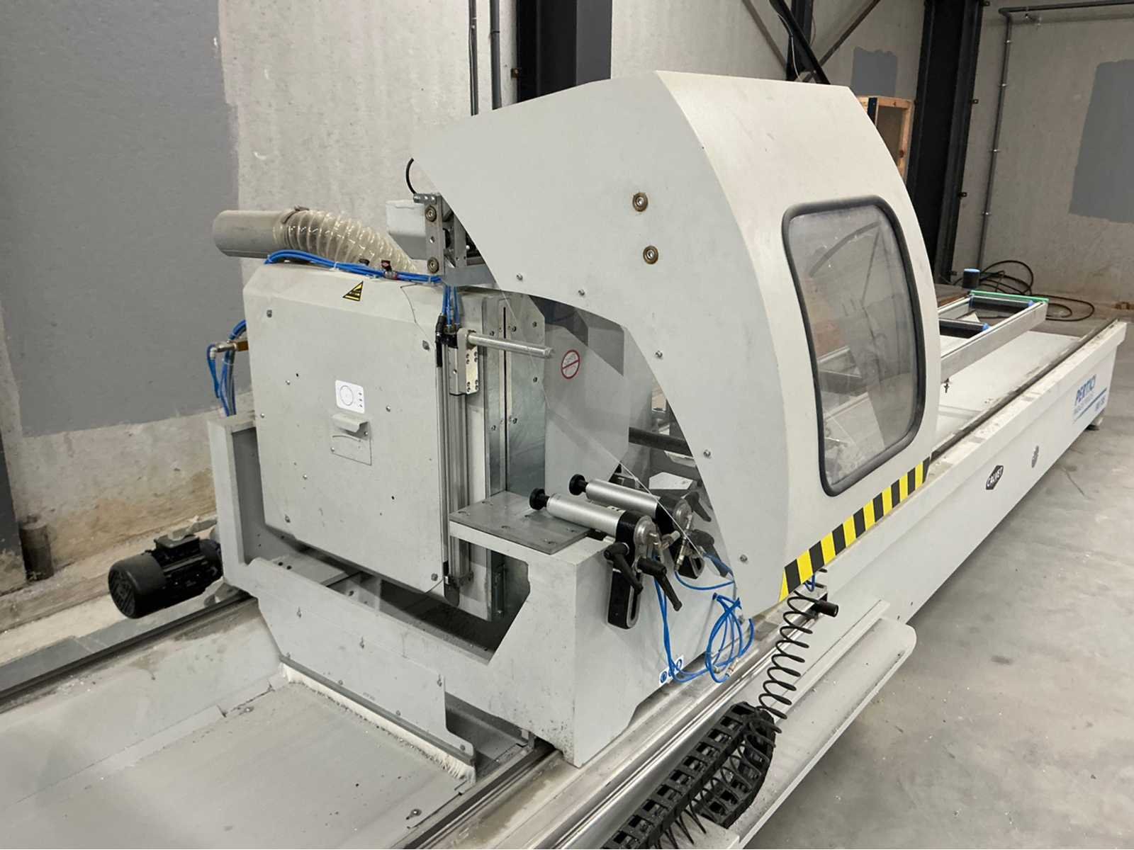 De machine bevindt zich in gebruikte maar goede staat: De Pertici 600 TSE is een dubbele verstekzaagmachine (Double Mitre Saw) voor het zagen van aluminium- en PVC-profielen. Belangrijkste kenmerken: Twee zaagkoppen met een zaagblad van 600 mm diameter. Beide koppen kunnen onder verstek zagen (meestal van 45° tot 90°). De rechterkop is automatisch verplaatsbaar (servo- of pneumatisch gestuurd). Geschikt voor precisiewerk in raam- en deurproductie of gevelbouw. Aansturing via een CNC- of digitaal controlesysteem (afhankelijk van de uitvoering). ⚡ Aansluitings- en gebruiksvereisten: Elektrisch: 400 V / 3-fase / 50 Hz. Perslucht: minimaal 6,5 bar (droog en olievrij). Vermogen: 8 kW → aanbevolen zekering ± 16–20 A. Geluidslevel: ± 63 dB(A) op werkafstand. Non Merk: Pertici Type: 600 TSE twee kops afkortzaag Bouwjaar: 2022 Serienummer: 00000037 Motorvermogen (kW): 8kW Aansluiting: 400V Machinegewicht: 2050kg