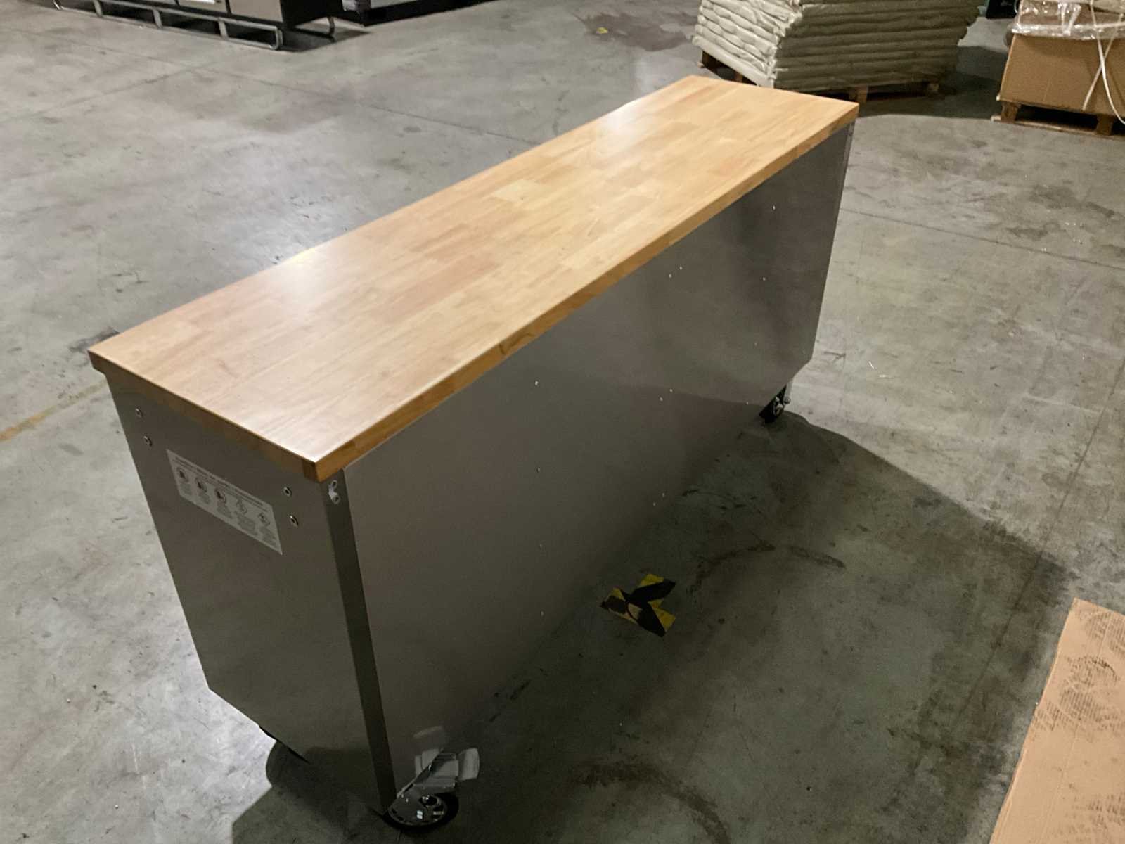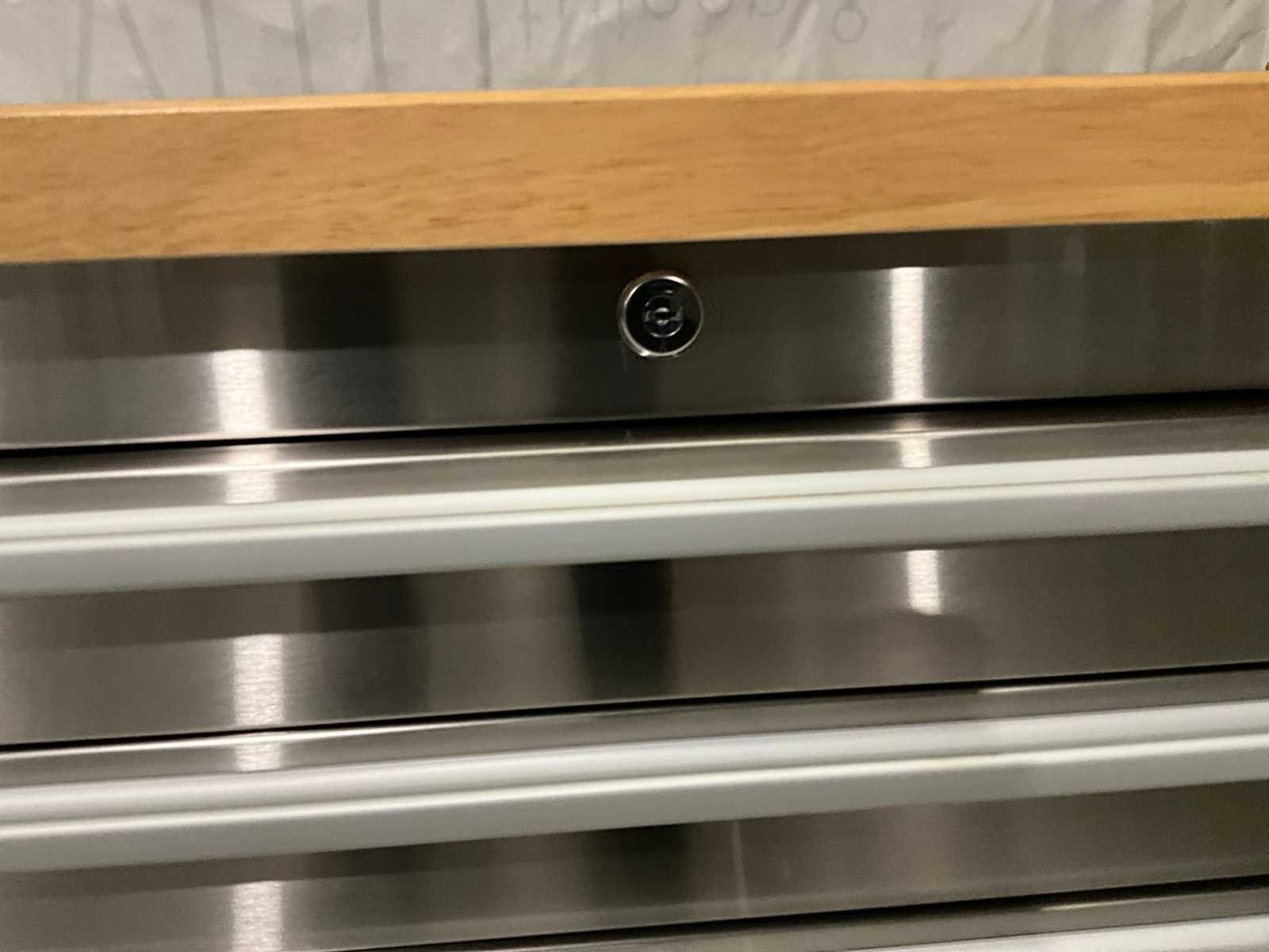 RVS gereedschapwagen - 2 wznkwielen en 2 vaste wielen - rubberwood werkblad - 6 lades : 40x40x8 cm - 2 lades : 40x40x15,5 cm - 2 lades 40x40x23,5 - 3 lades : 86x40x8 cm - 1 lade : 86x4015,5 - 1 lade 86x40x23,5 - slot inbegrepen - 2 handvaten inbegrepen - laadmogelijkheden aanwezig Nee Merk: Optimus Lengte: 184cm Breedte: 49cm Hoogte: 95cm Materiaal: RVS