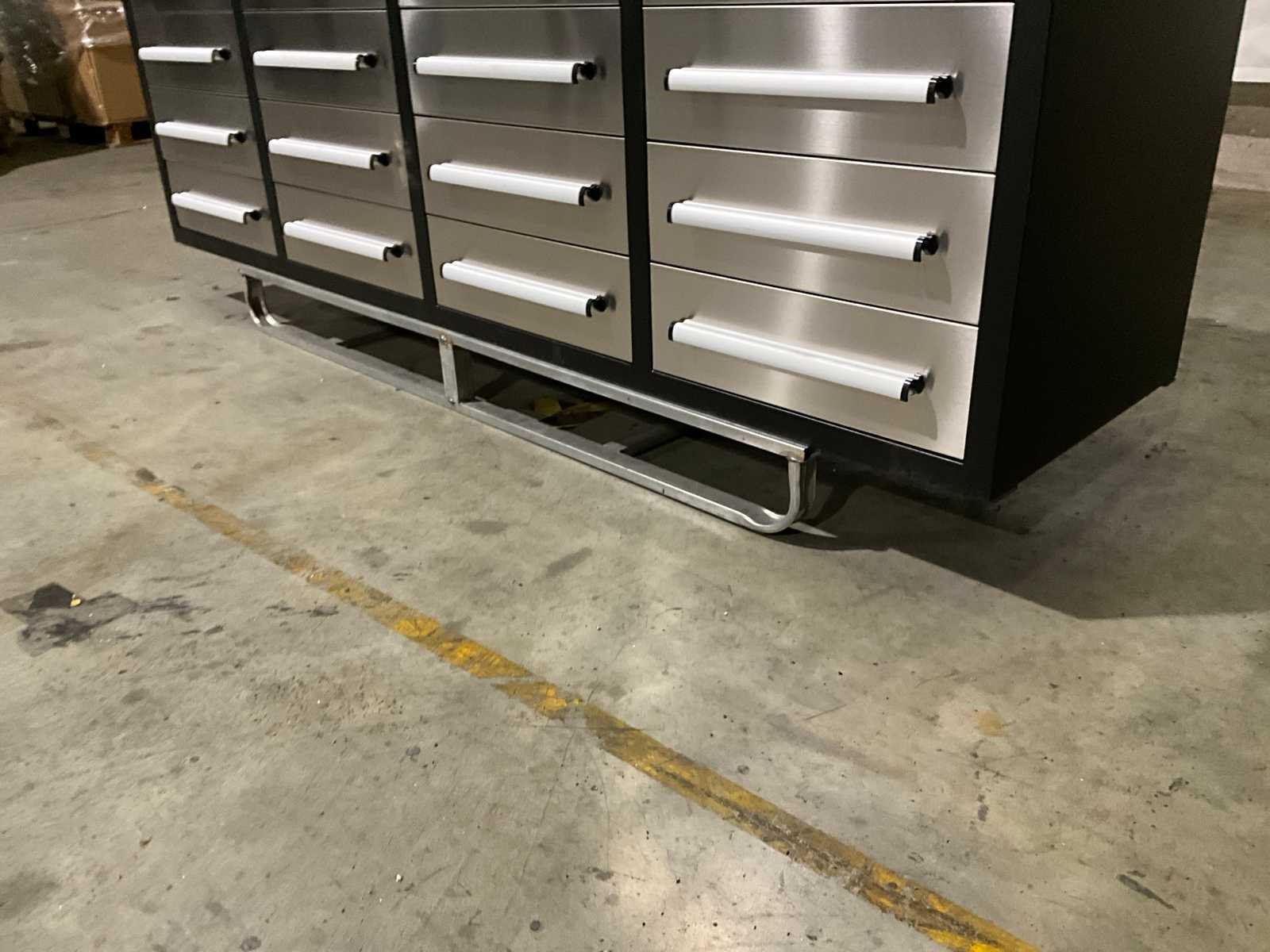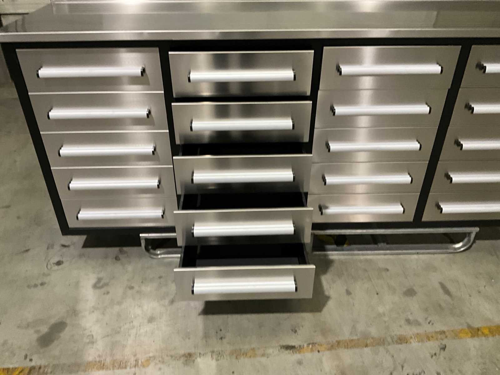 Ongebruikte RVS werkbank - RVS werkblad - 20 lades : 45x48x12 cm - geen slot aanwezig- laadmogelijkheden aanwezig Nee Merk: Optimus Lengte: 2230mm Hoogte: 920mm Materiaal: RVS