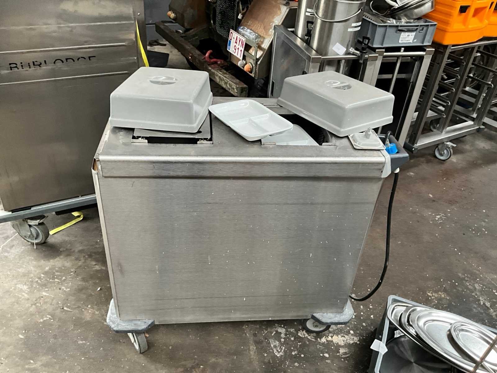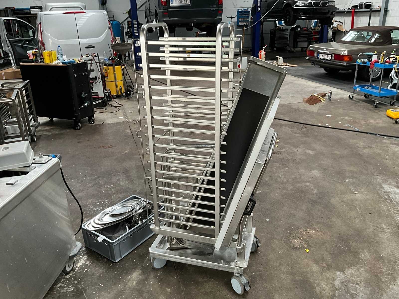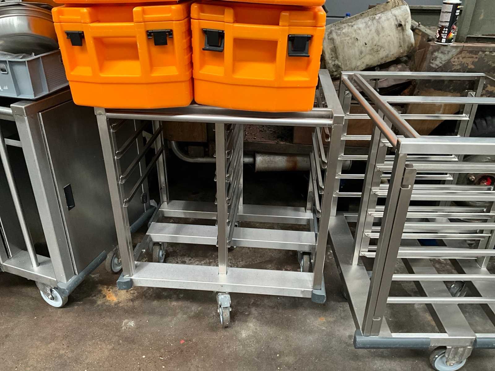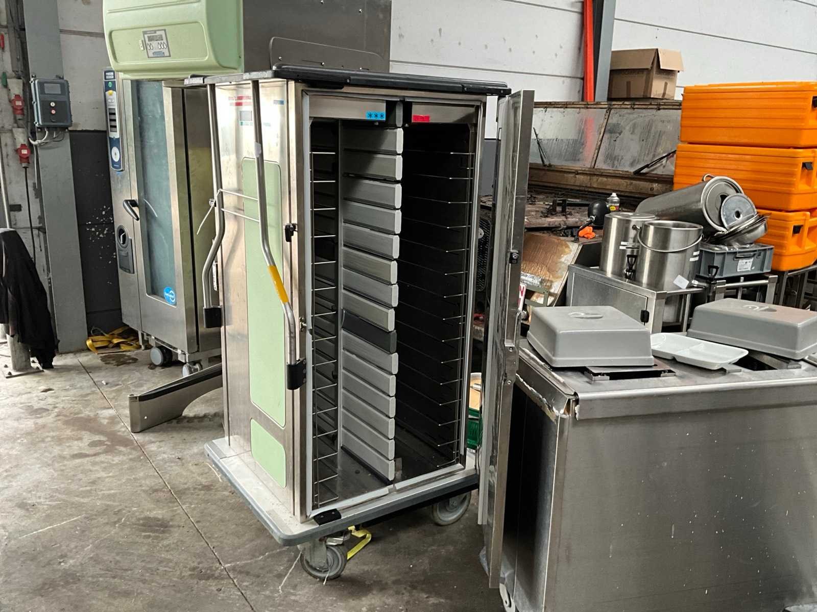 Waaronder 3 mobiele onderstellen, een stoomoven, warm/koud hou machine, bordverwarmers met borden en diverse plateaus en 3 warmte houders. ( + diverse extra’s) Nee