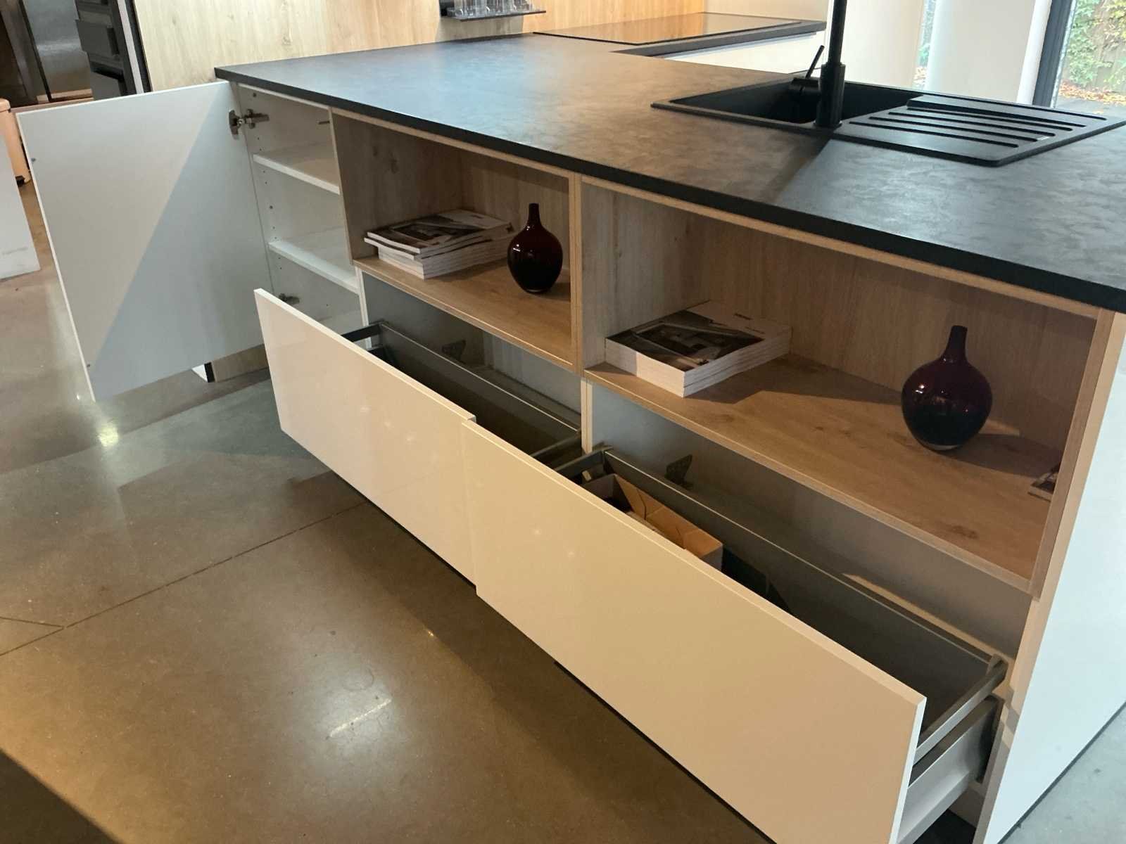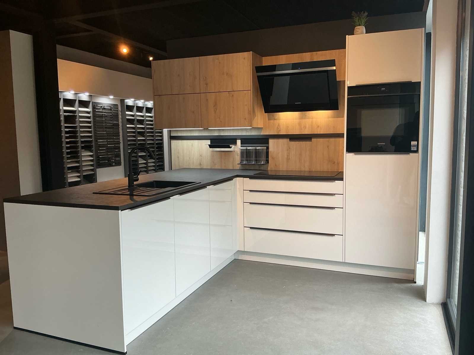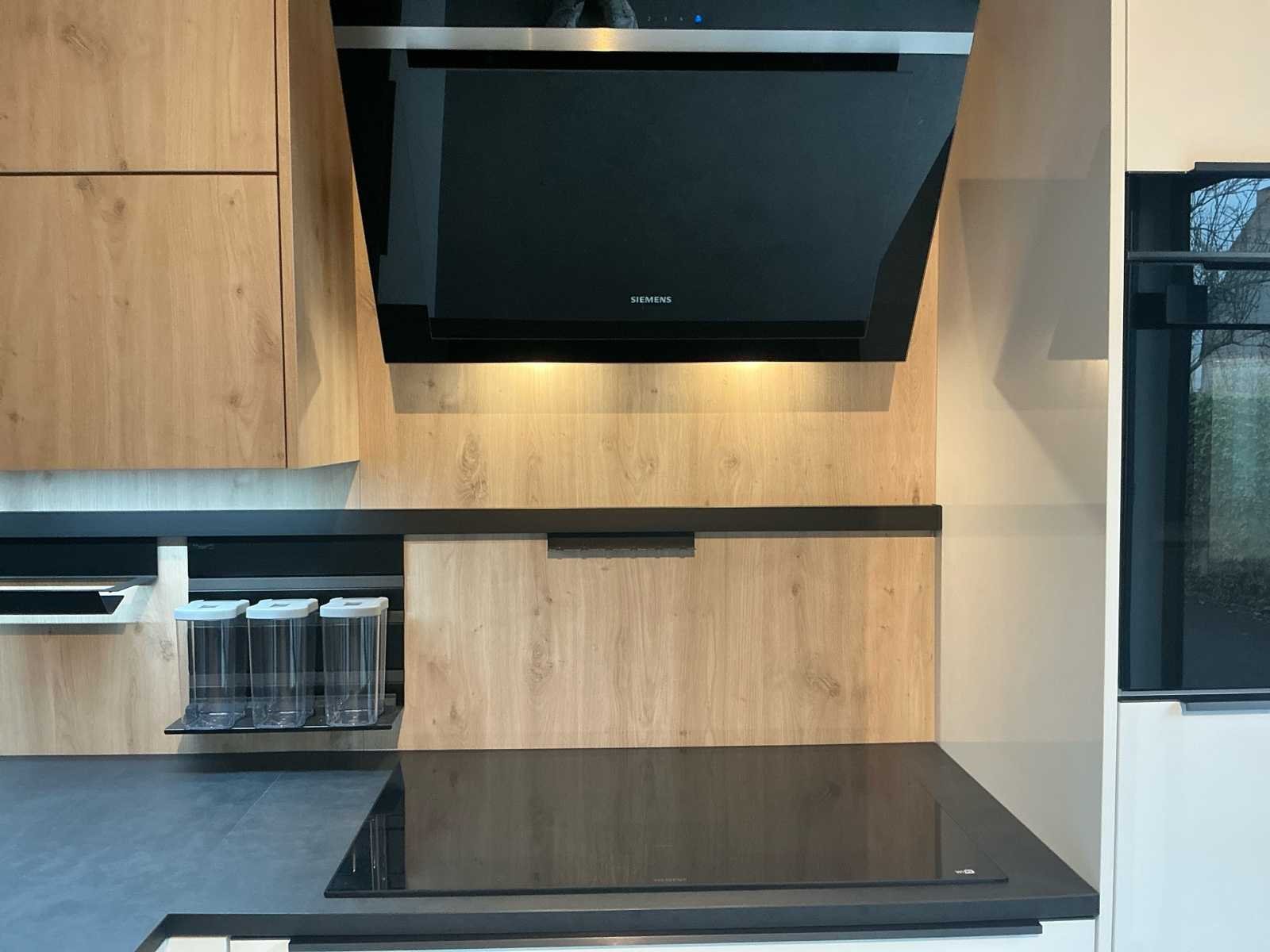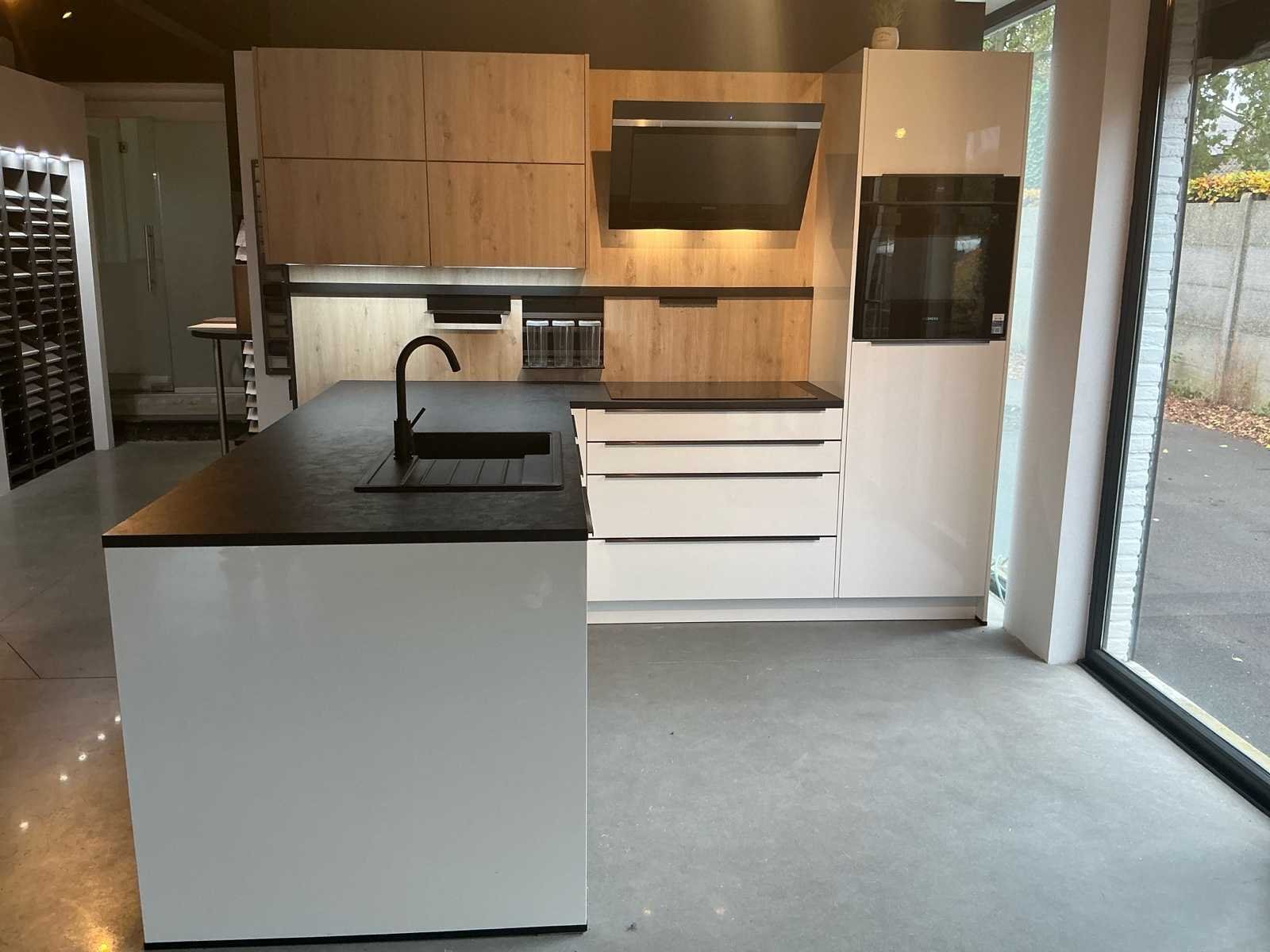 Zelf te demonteren Ophaling 5 Januari 2026 Scandinavische designkeuken – Siemens & Bosch premium Strak kristalwit hoogglans laminaat, geplamuurd beton-look werkblad. Achterwand, bovenkasten & regalen in warm licht eiken. Le Mans-hoekonderkast + alle deuren soft-close. Massief houten bestekindeling. Toestellen (inbouw, ongebruikt): Siemens LC87KHM60 schuine wandafzuigkap Siemens KI18RNFF2 inbouwkoelkast Siemens EX877NYV6E 80cm flex-inductie Siemens HM936GCB1 combi-oven/magnetron Bosch SMV6EB800E volledig geïntegreerde vaatwasser No Merk: Hacker Model: Concept Type keukenopstelling: L-vormig Kraan: Blanco Mida Gootsteen: Blanco Legra 6 Werkblad hoogte: 930cm Aanrechtblad: Laminaat Magnetron: Siemens Fornuis: Inductie siemens Koelkast: Siemens Oven: Siemens Vaatwasser: Bosch Hoofdkleur: Glans wit / Wit eik Style: Scandinavisch Kleur: Wit/Licht eik Materiaal: Laminaat