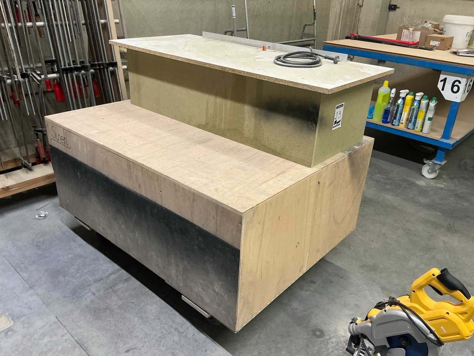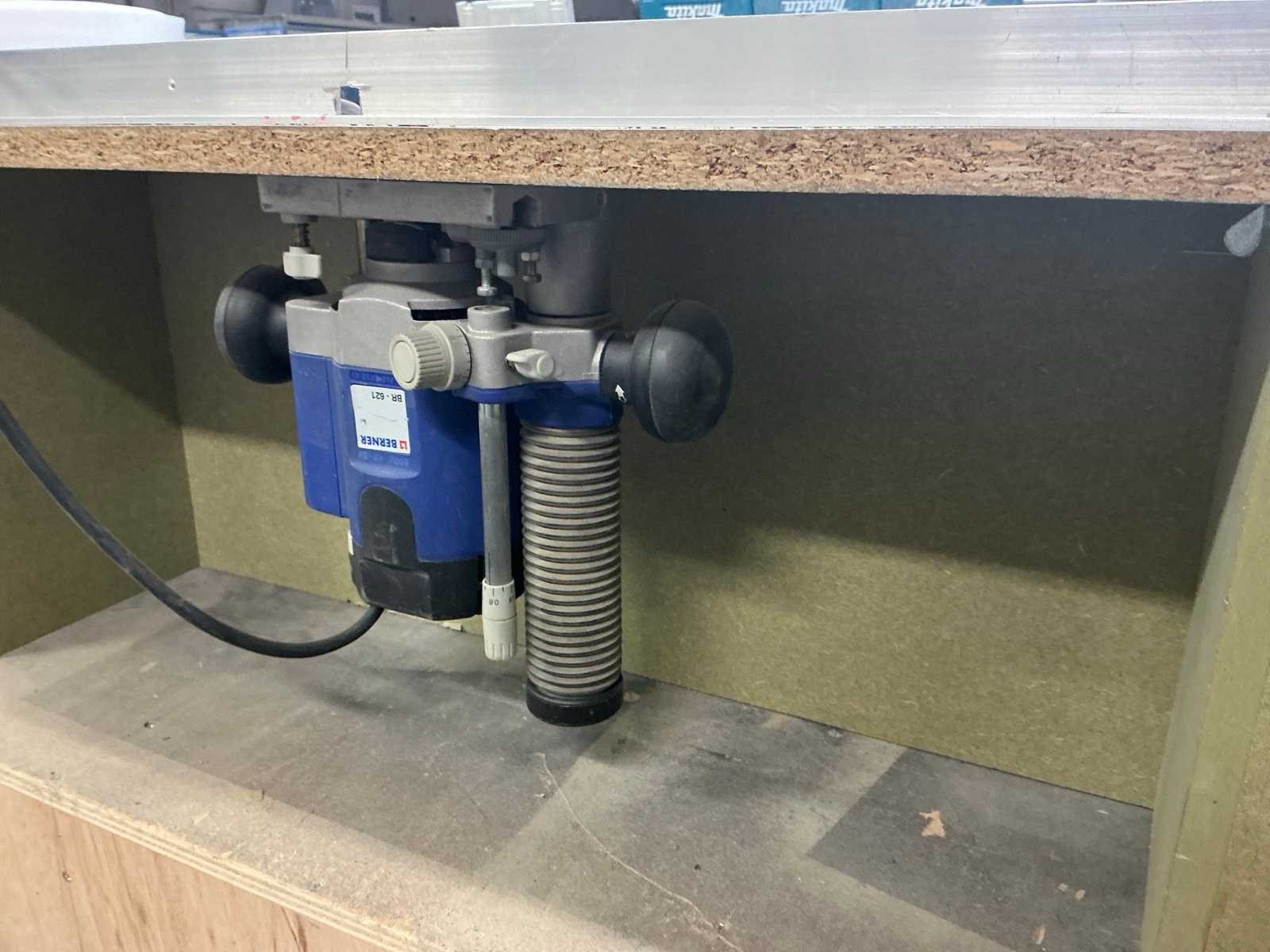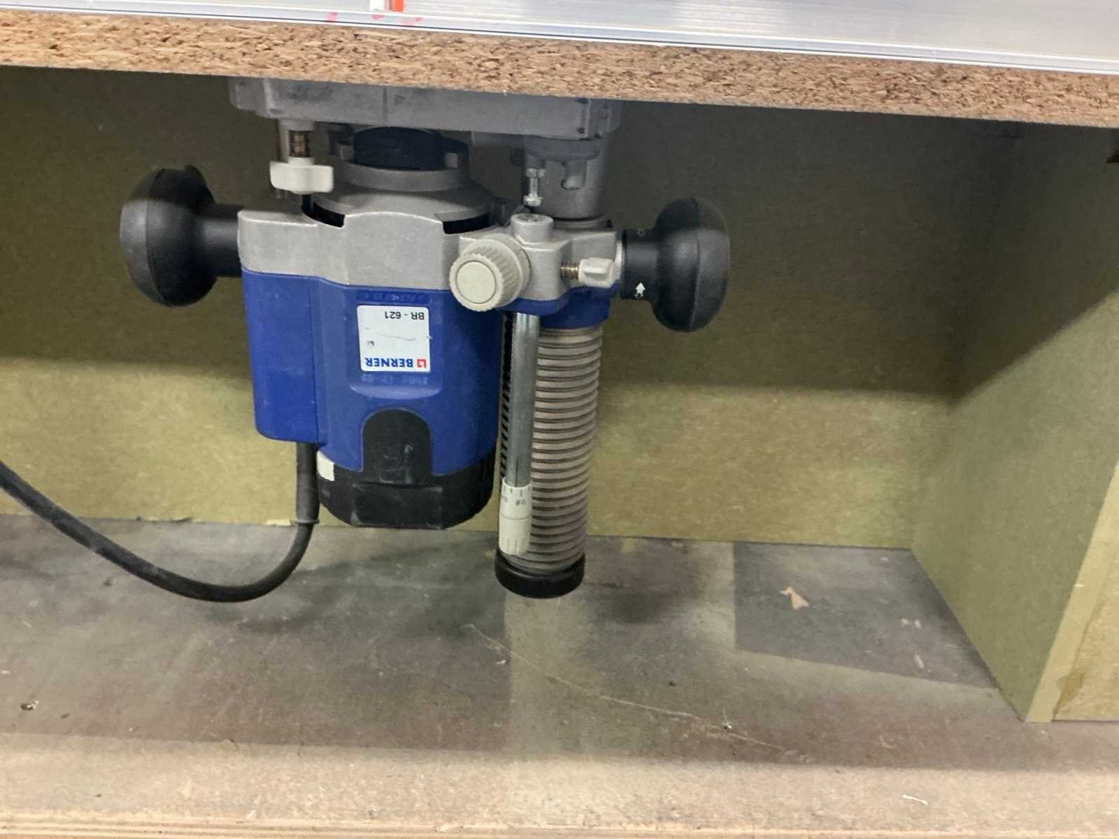 Gemonteerd op mobiele houten werkbank met afmeting 1000x1300x1030mm Nee Merk: Berner Type: BR-621 Aansluiting: 230V