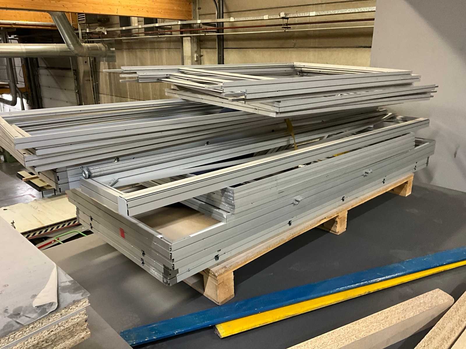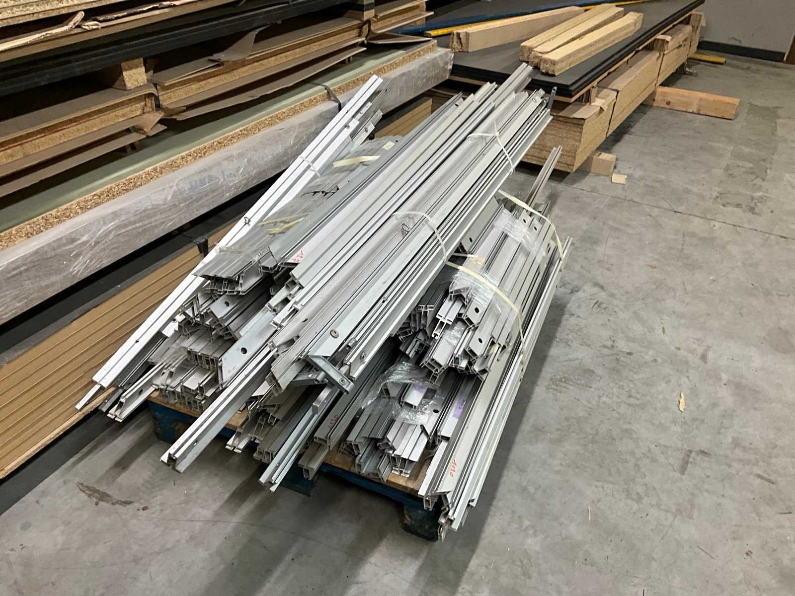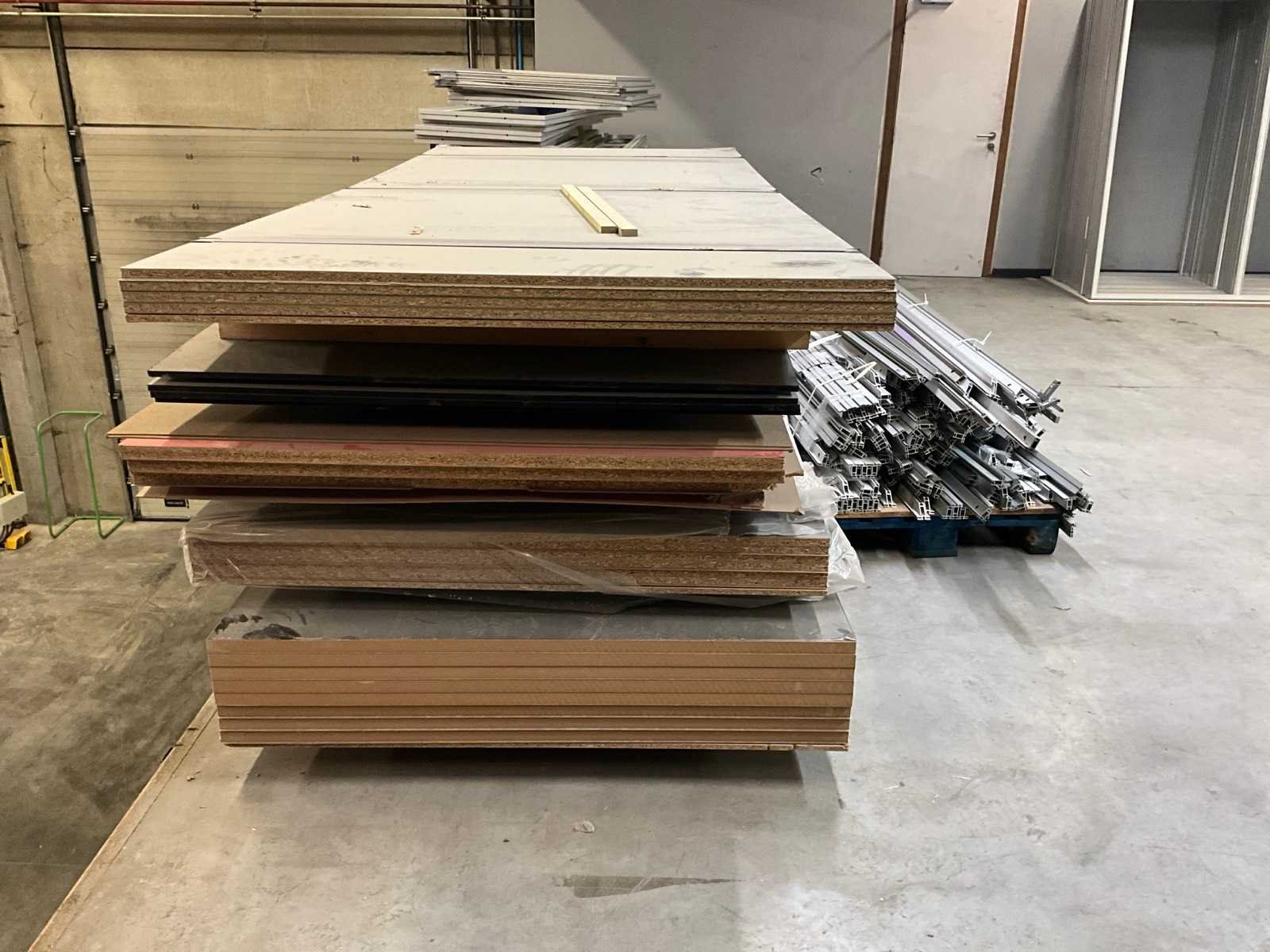 Bestaand uit MDF + vezelplaten met fineer met diverse afmeting en breedtes tot 2075 mm, + 2x pallet met aluminium profielen en kaders Nee Gewicht: 4000kg Lengte: 4100mm Breedte: 1223mm Hoogte: 15mm