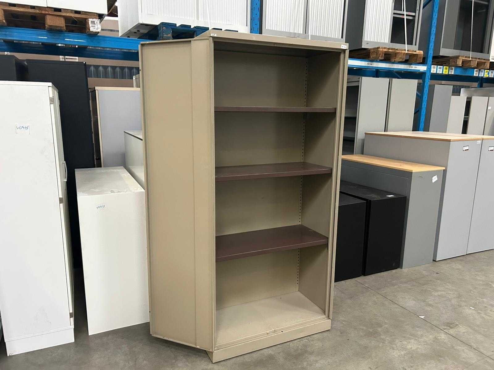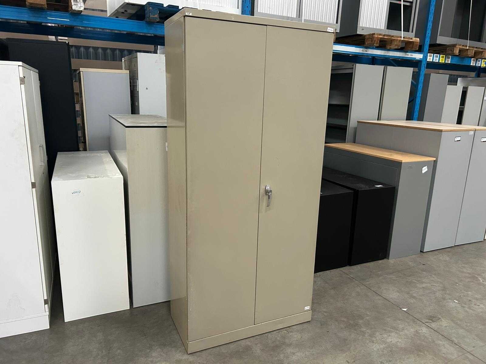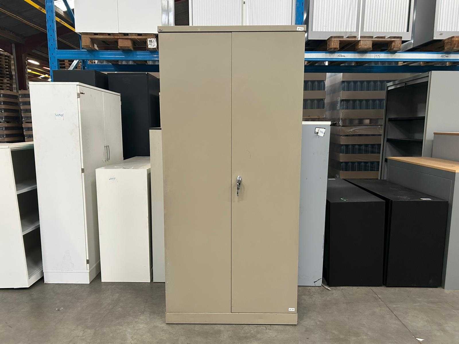 Vintage hoge metalen draaideurkast met 3 leggers. Nee Merk: Elbe Type: Draaideurkast Kleur: Taupe Gewicht: 60kg Lengte: 90cm Breedte: 44cm Hoogte: 196cm Materiaal: Metaal