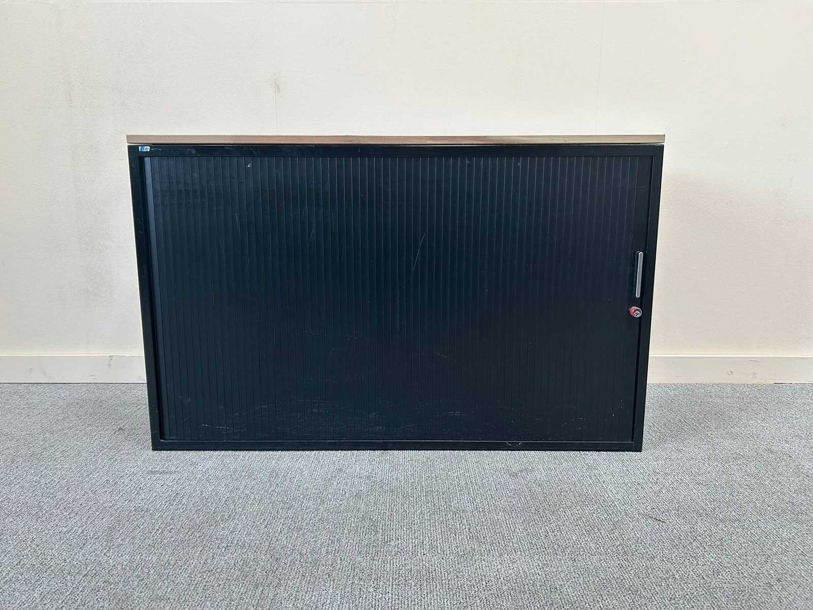 Zwarte lage schuifdeurkast , 1 legger, sleutel niet gegarandeerd Nee Merk: LISTA Type: lage schuifdeurkast Breedte: 120cm Hoogte: 76cm Materiaal: metaal Diepte: 40cm