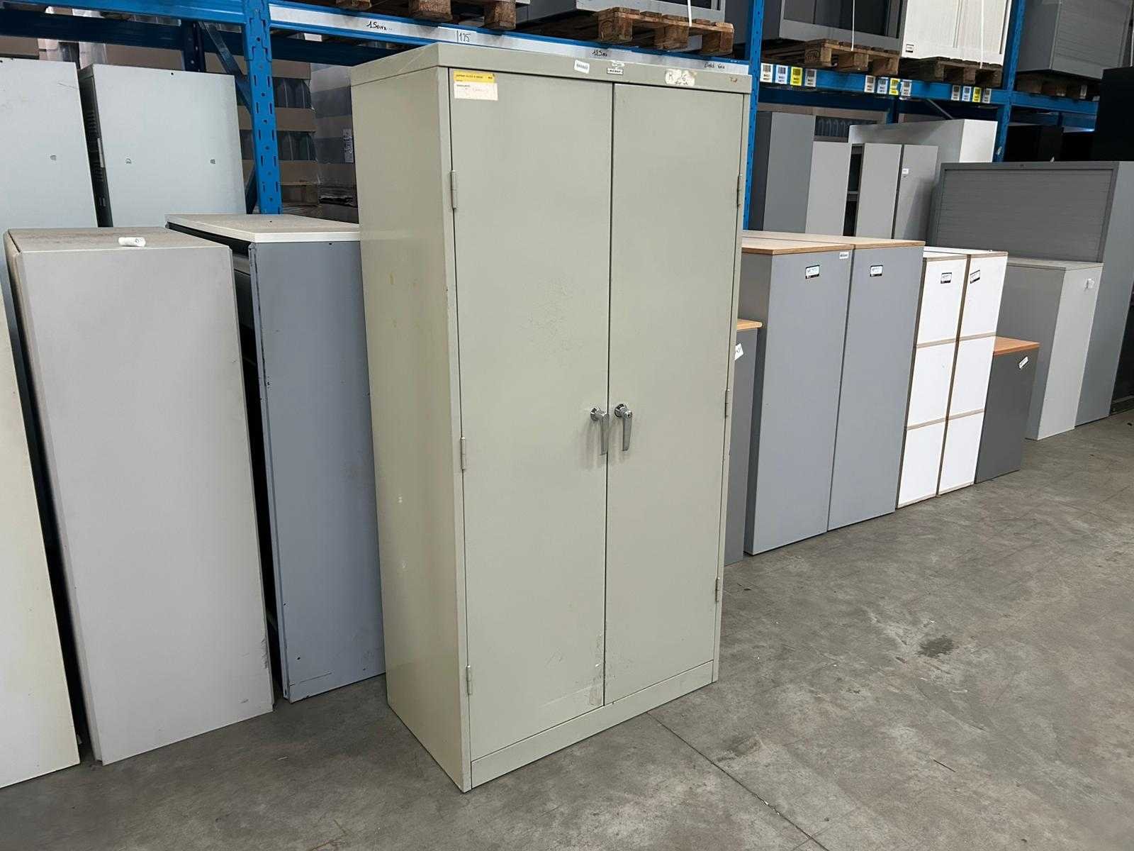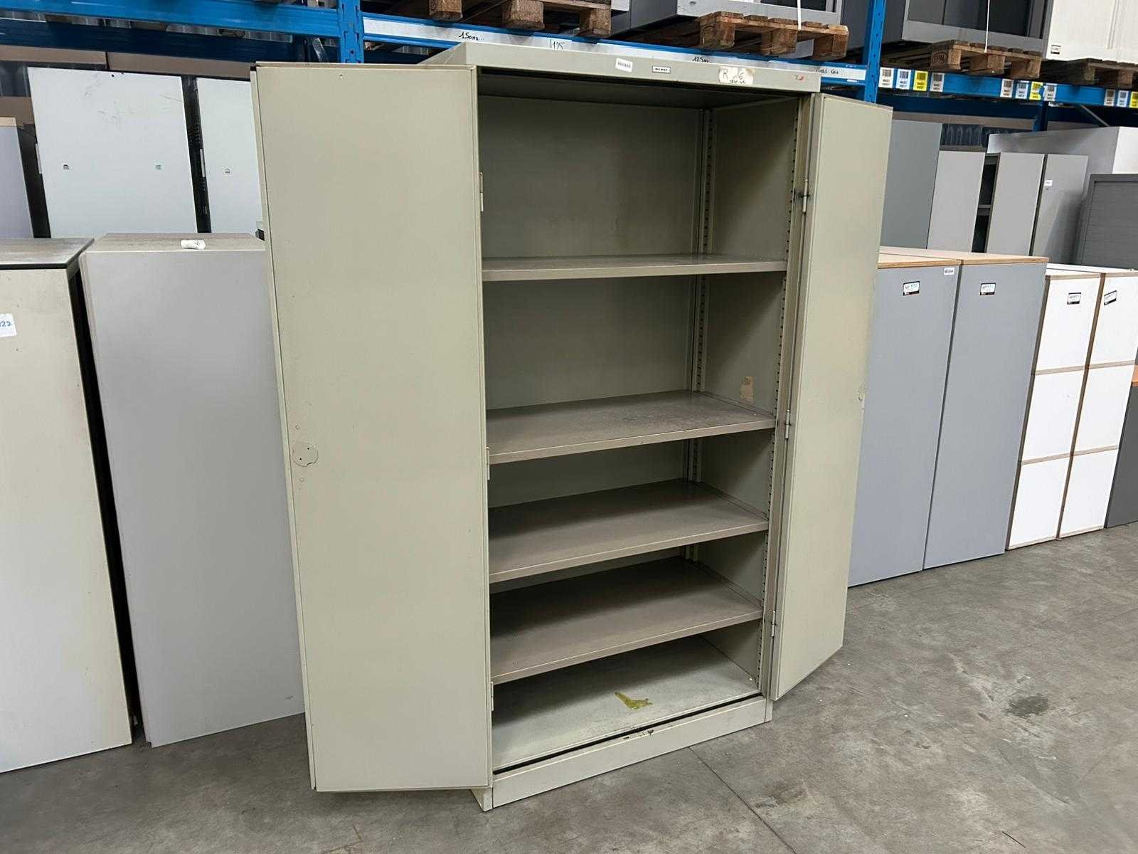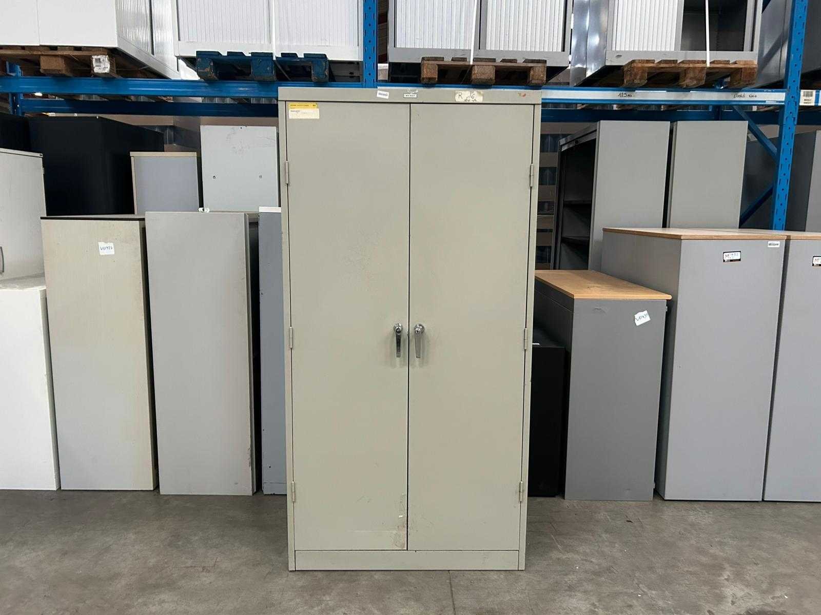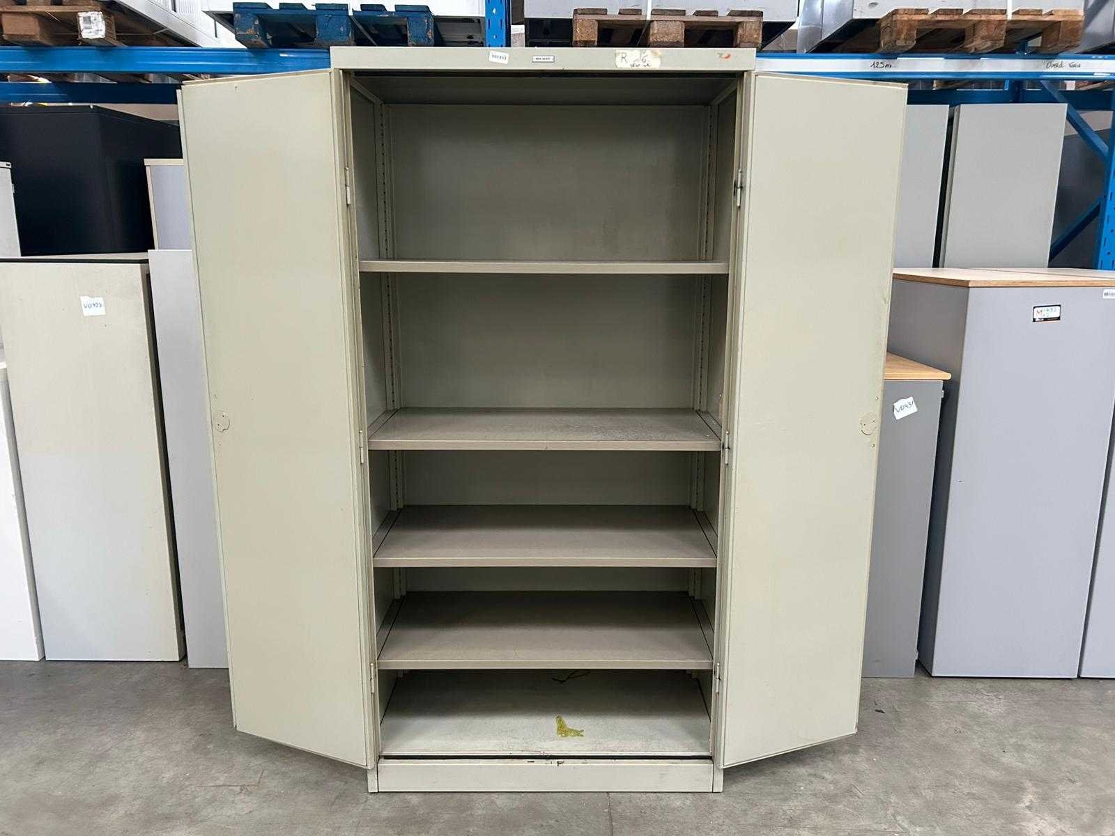 Hoge vintage metalen draaideurkast Mewaf, grijs met 4 leggers Nee Merk: Mewaf Type: Draaideurkast Kleur: Grijs Gewicht: 60kg Lengte: 92cm Breedte: 48cm Hoogte: 180cm Materiaal: Metaal