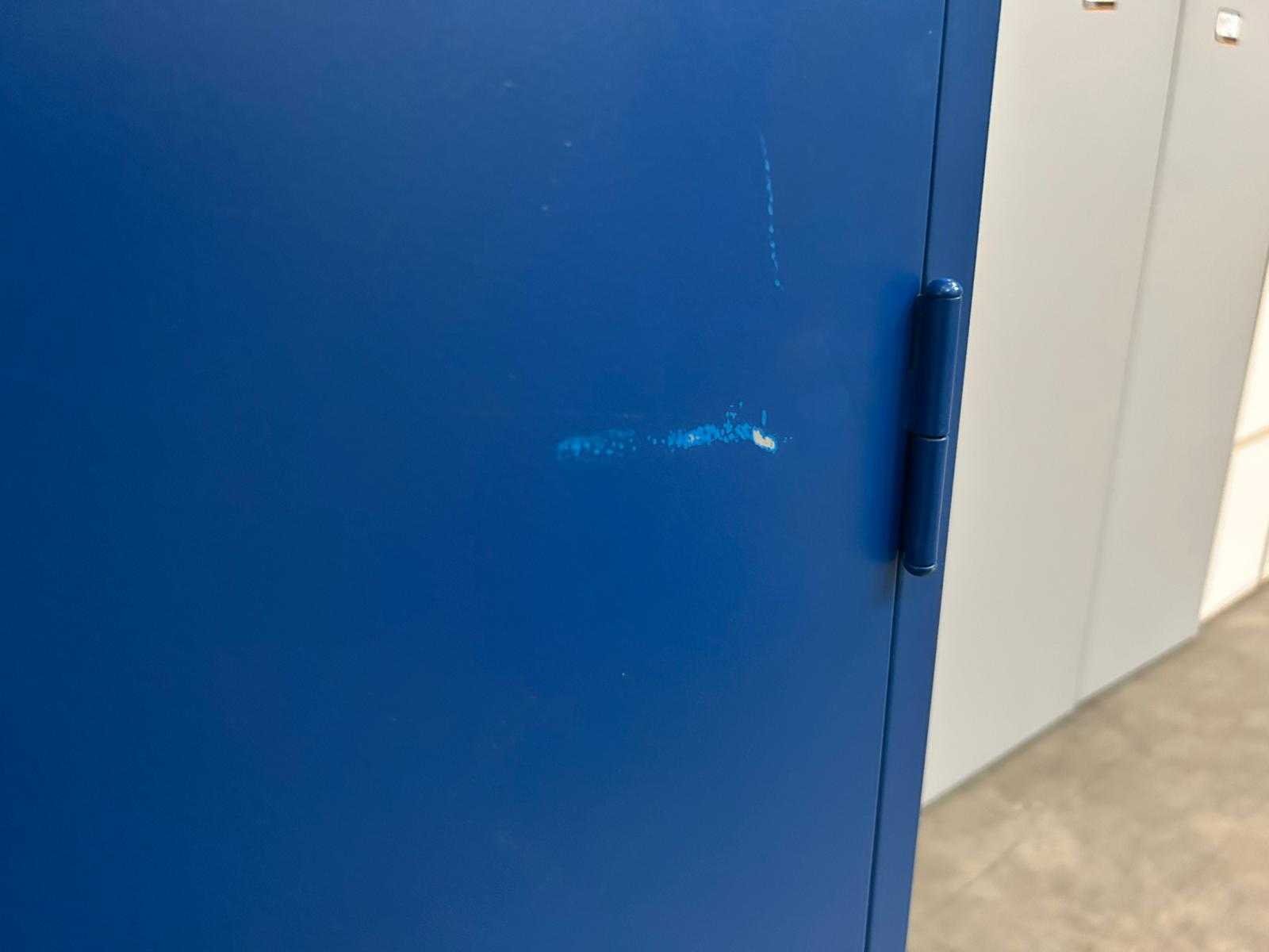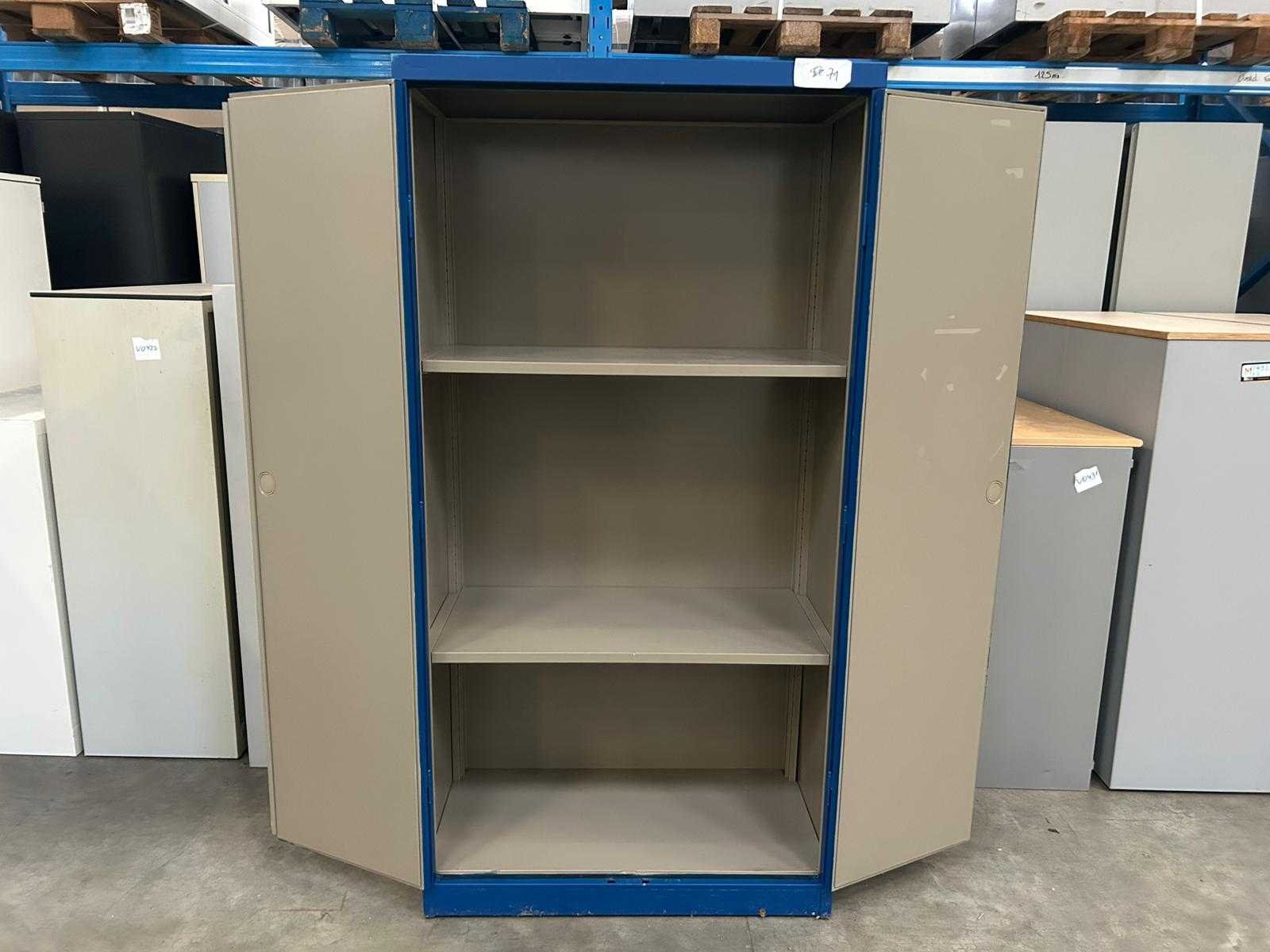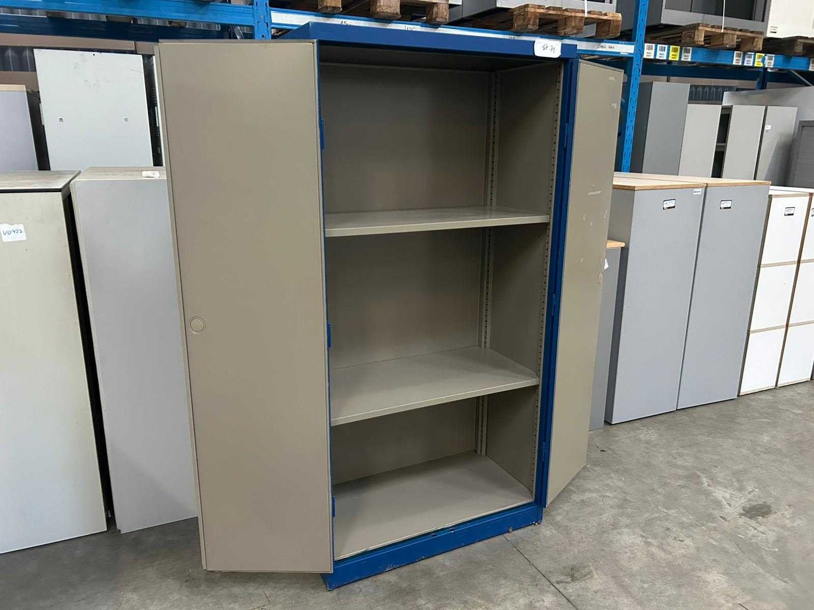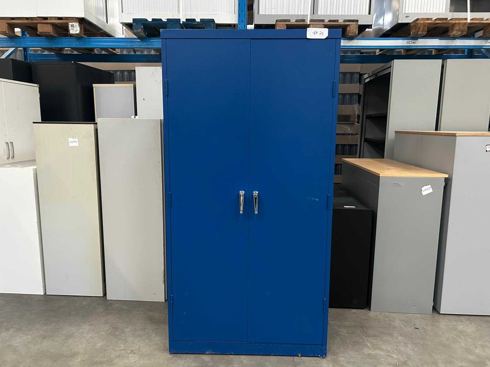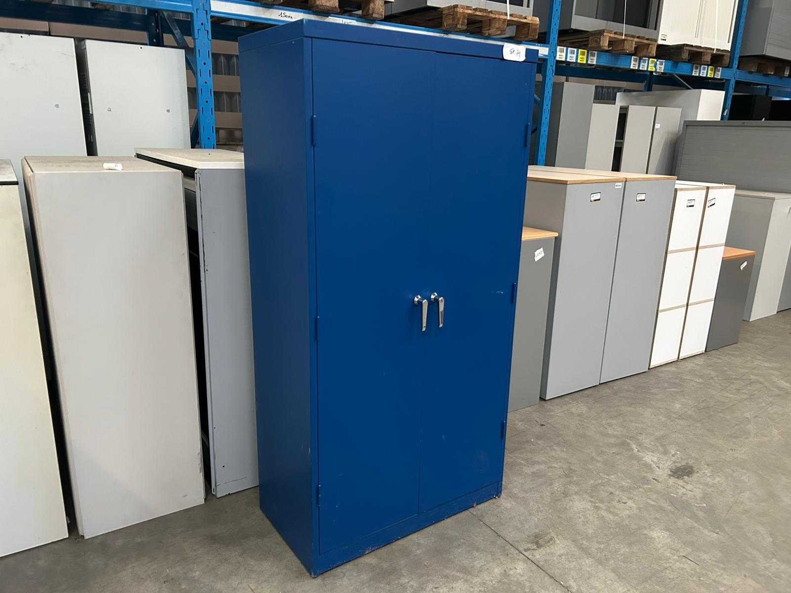 Hoge blauwe metalen draaideurkast Mewaf met 2 leggers Nee Merk: Mewaf Type: Draaideurkast Kleur: PolitieBlauw Gewicht: 60kg Lengte: 92cm Breedte: 48cm Hoogte: 180cm Materiaal: Metaal