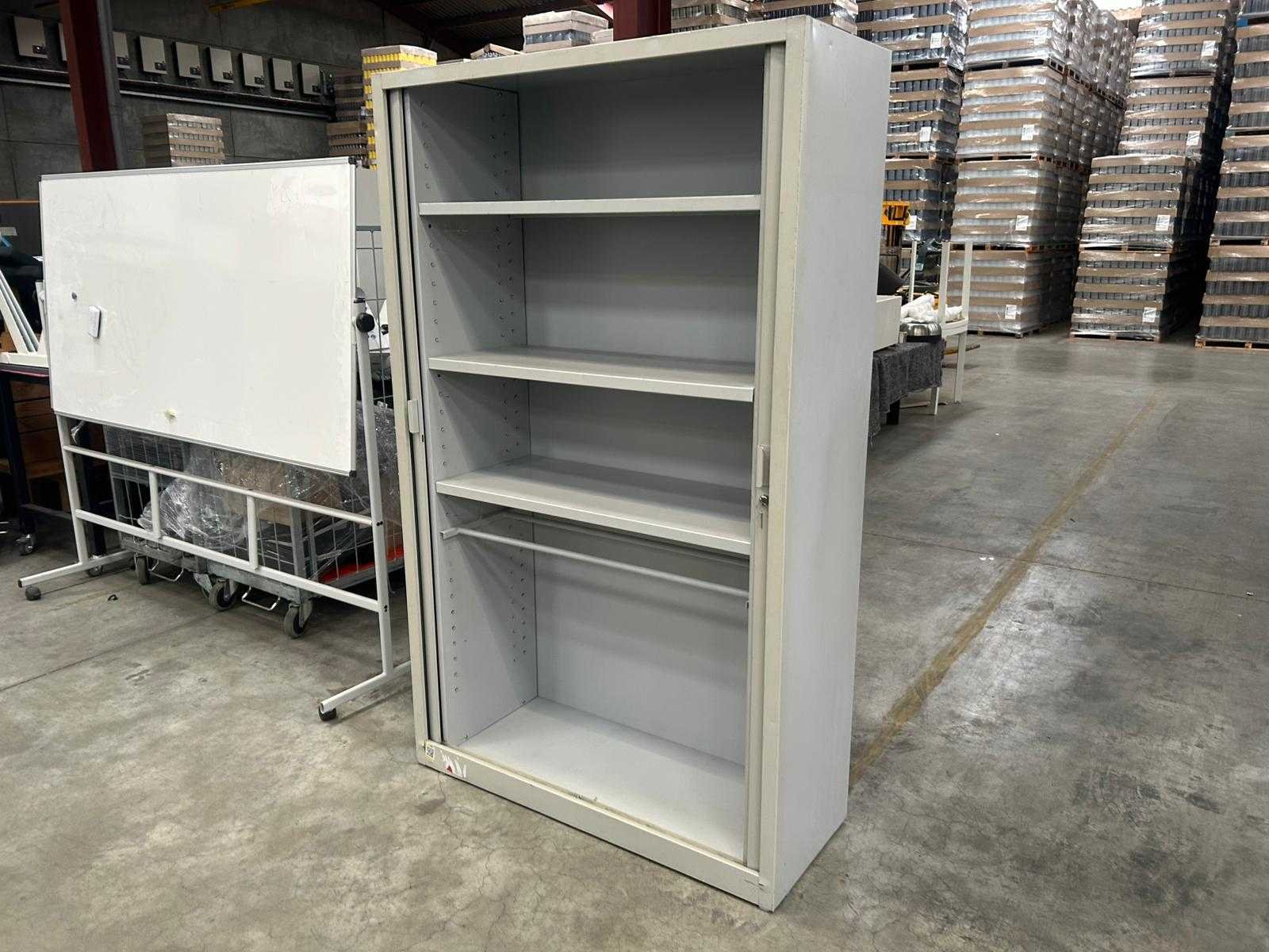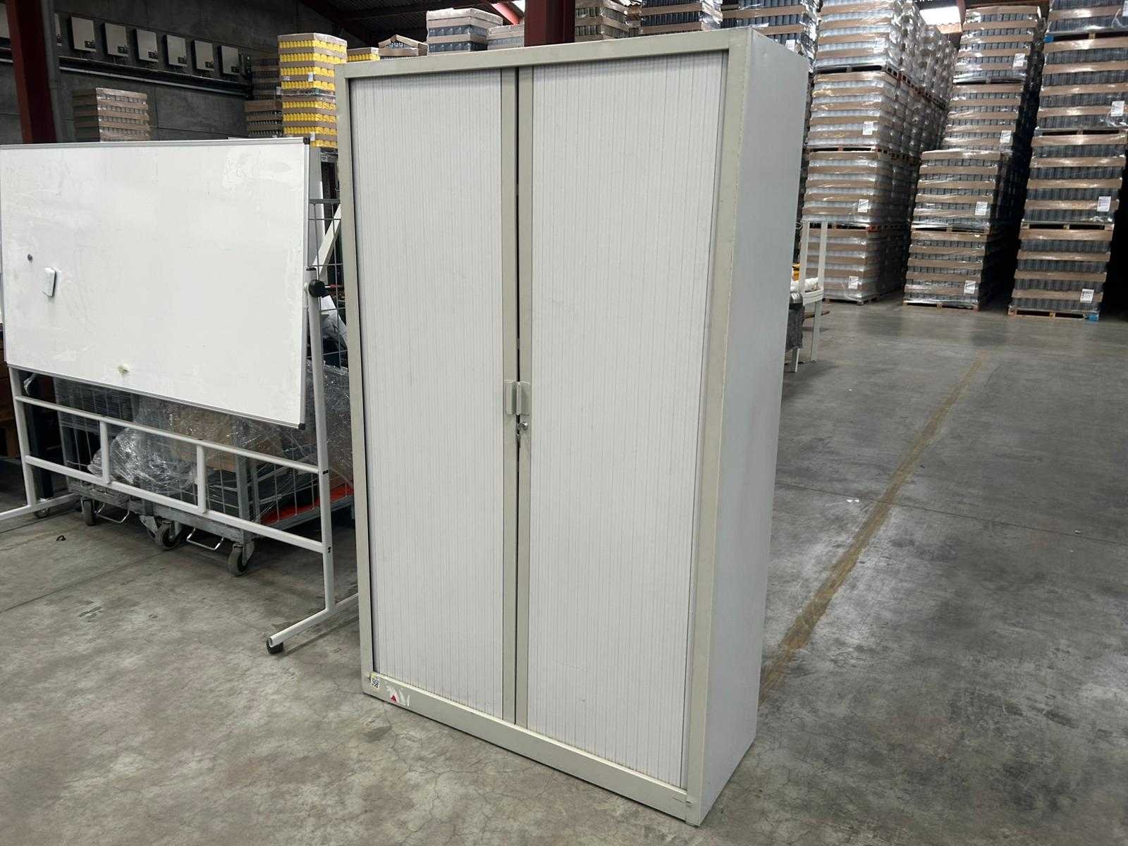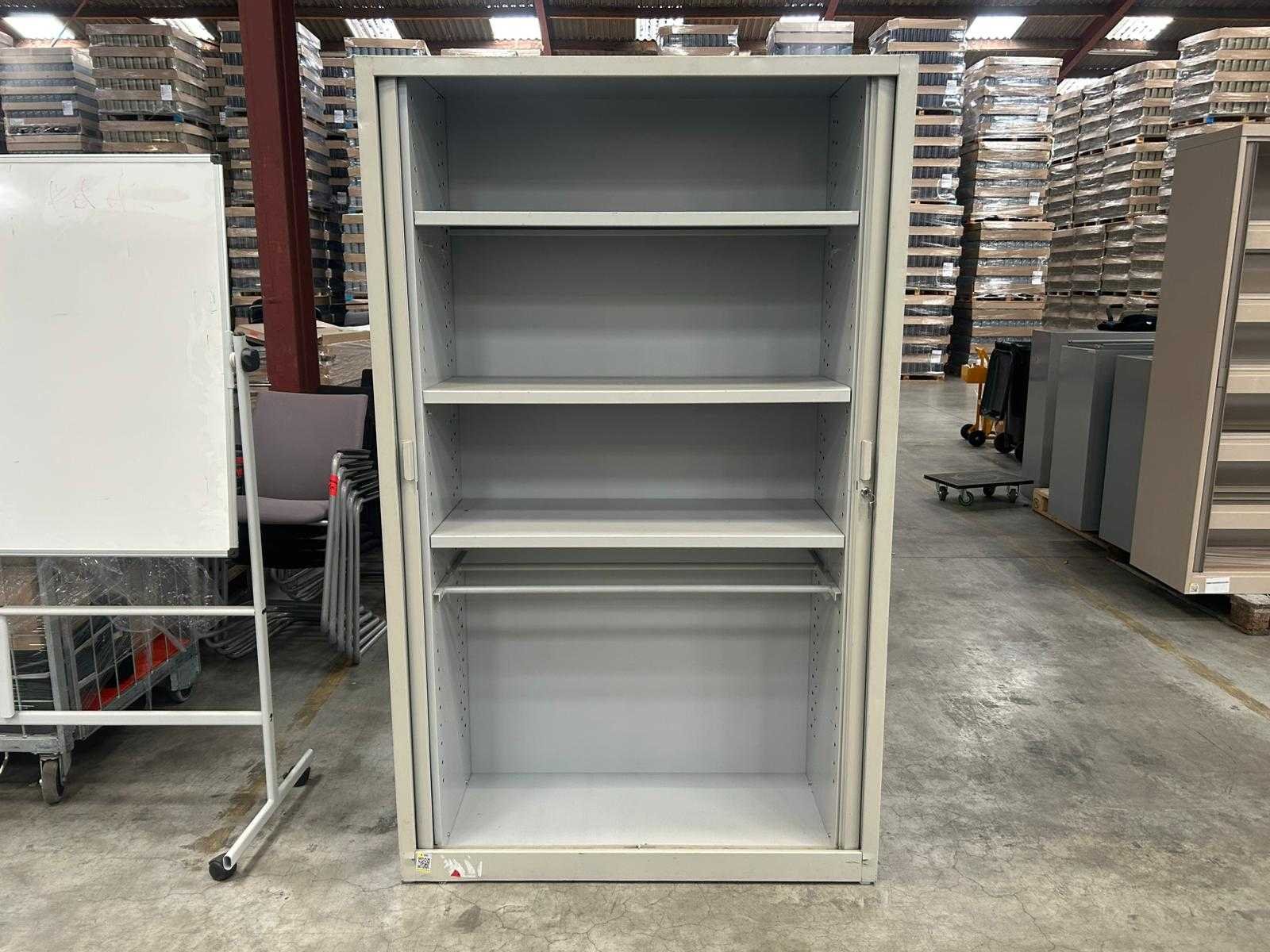 Hoge verticale roldeurkast , voorzien van 3 legplanken, in gebruikte staat, met Nee Kleur: licht grijs Gewicht: 40kg Lengte: 120cm Breedte: 46cm Hoogte: 196cm Materiaal: metaal