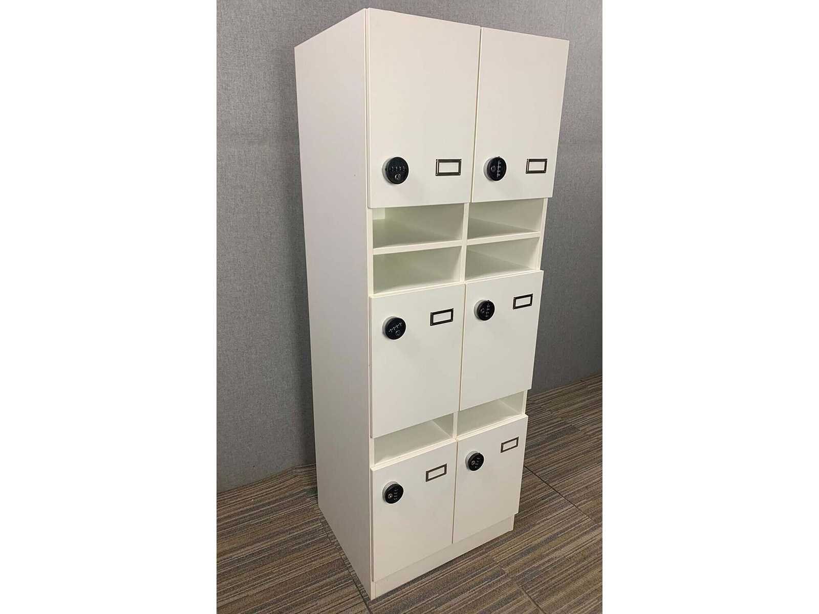 Locker, 6-delig met cijferslot, afm. H180xB65xD54 - wit melamine, Kast is gereset en heeft een persoonlijke code, kan gebruikssporen vertonen Nee Type: Locker unit Kleur: Wit Gewicht: 70kg Breedte: 65cm Hoogte: 180cm Materiaal: Melamine Diepte: 54cm
