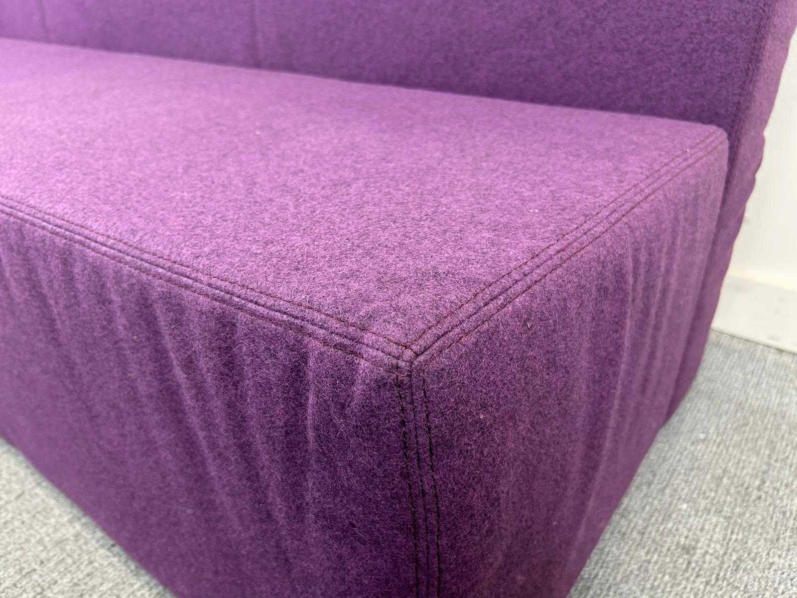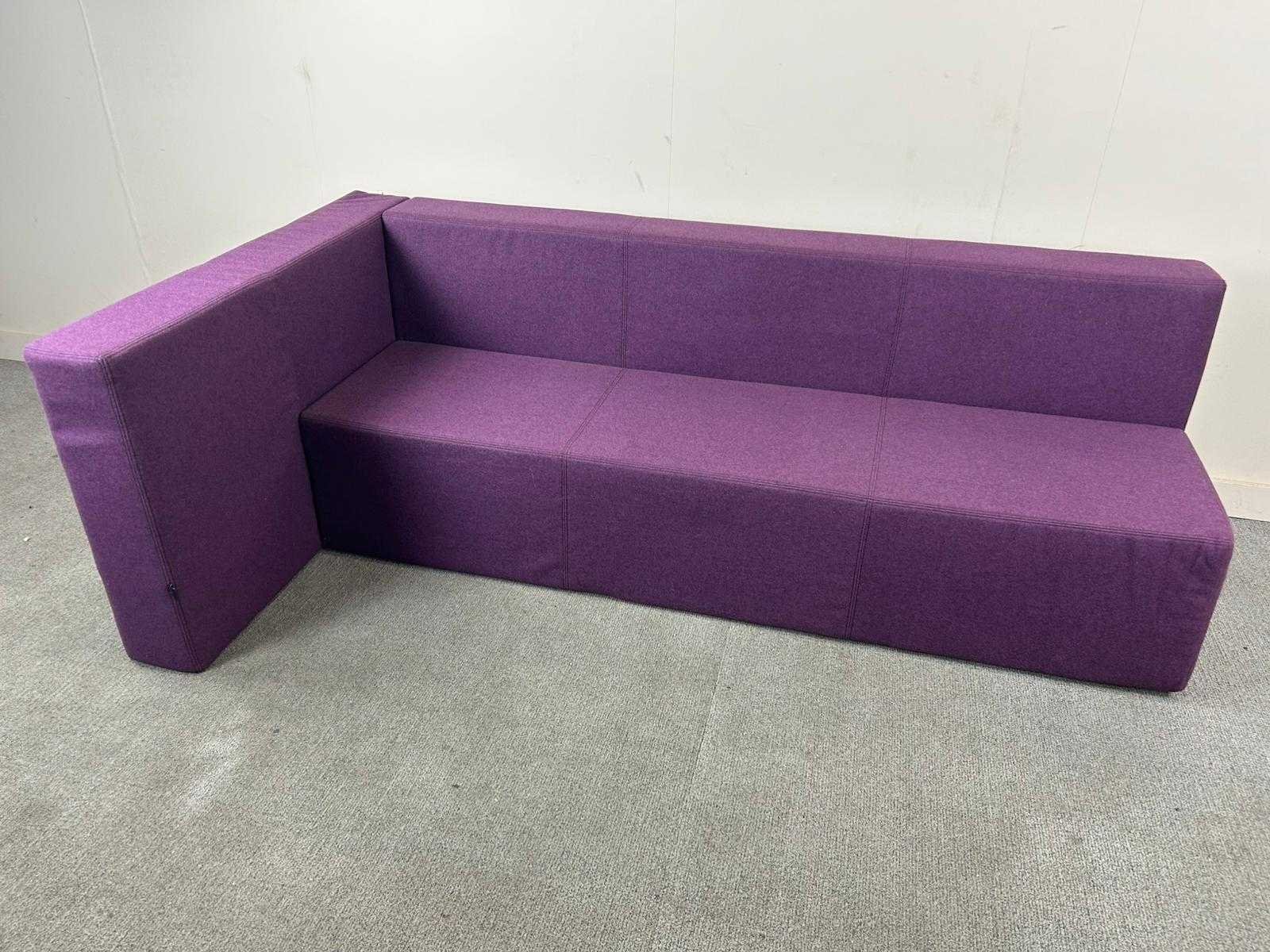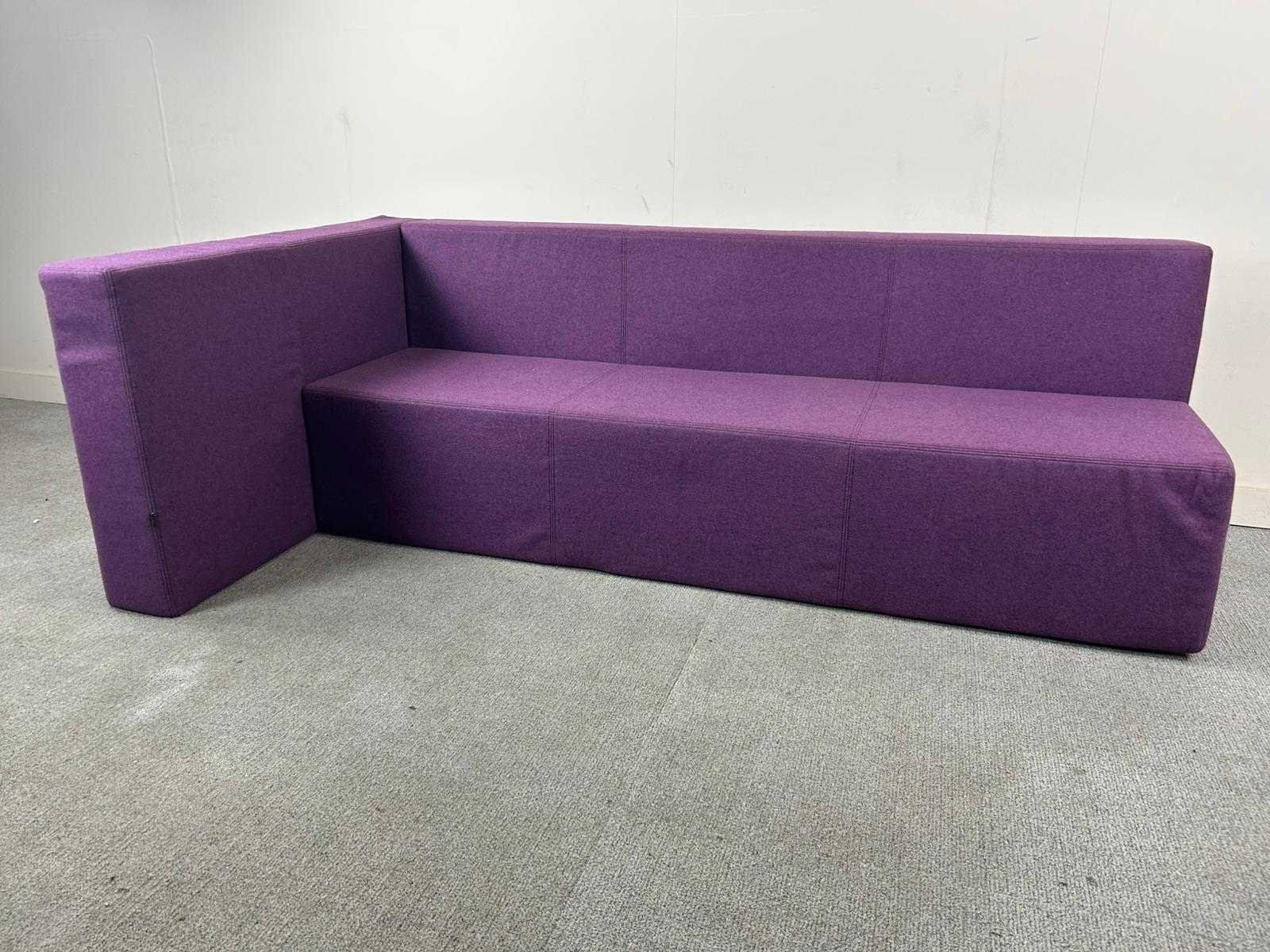Modulaire hoekbank / zithoek in paarse stoffering, strak en minimalistisch ontwerp. Geschikt voor wachtruimte, lounge of kantooromgeving. Vaste modules in L-opstelling. Gebruikte staat met lichte gebruikssporen. Nee Merk: ABV Type: Hoekbank Kleur: paars Gewicht: 80kg Lengte: 205cm Breedte: 110cm Hoogte: 70cm