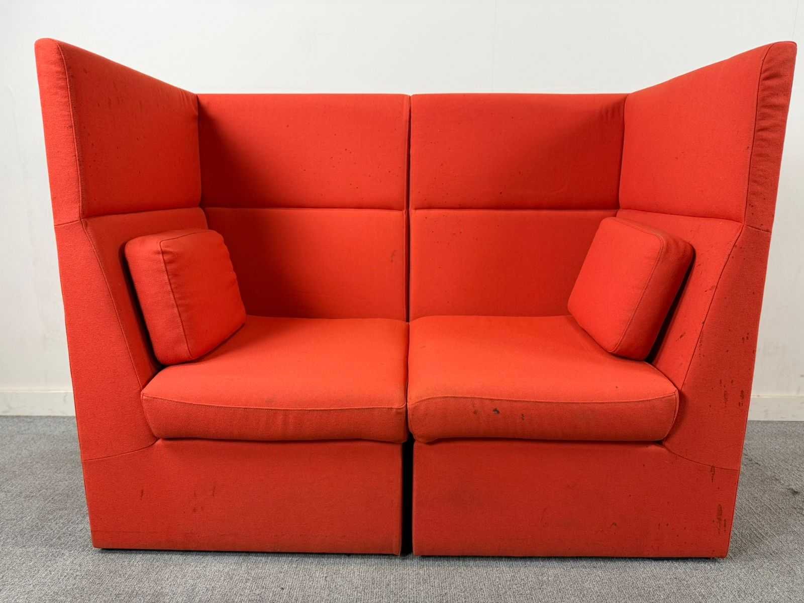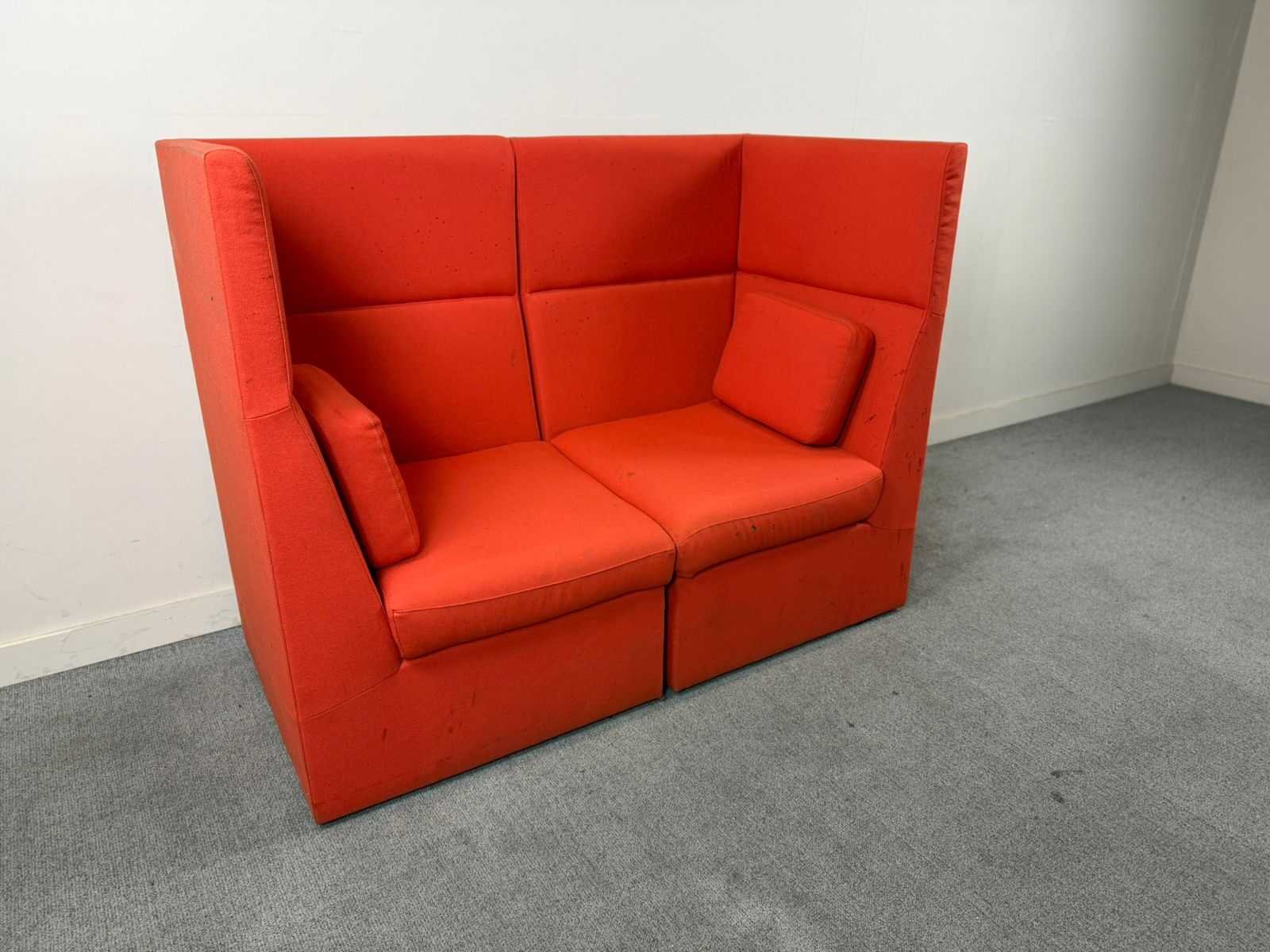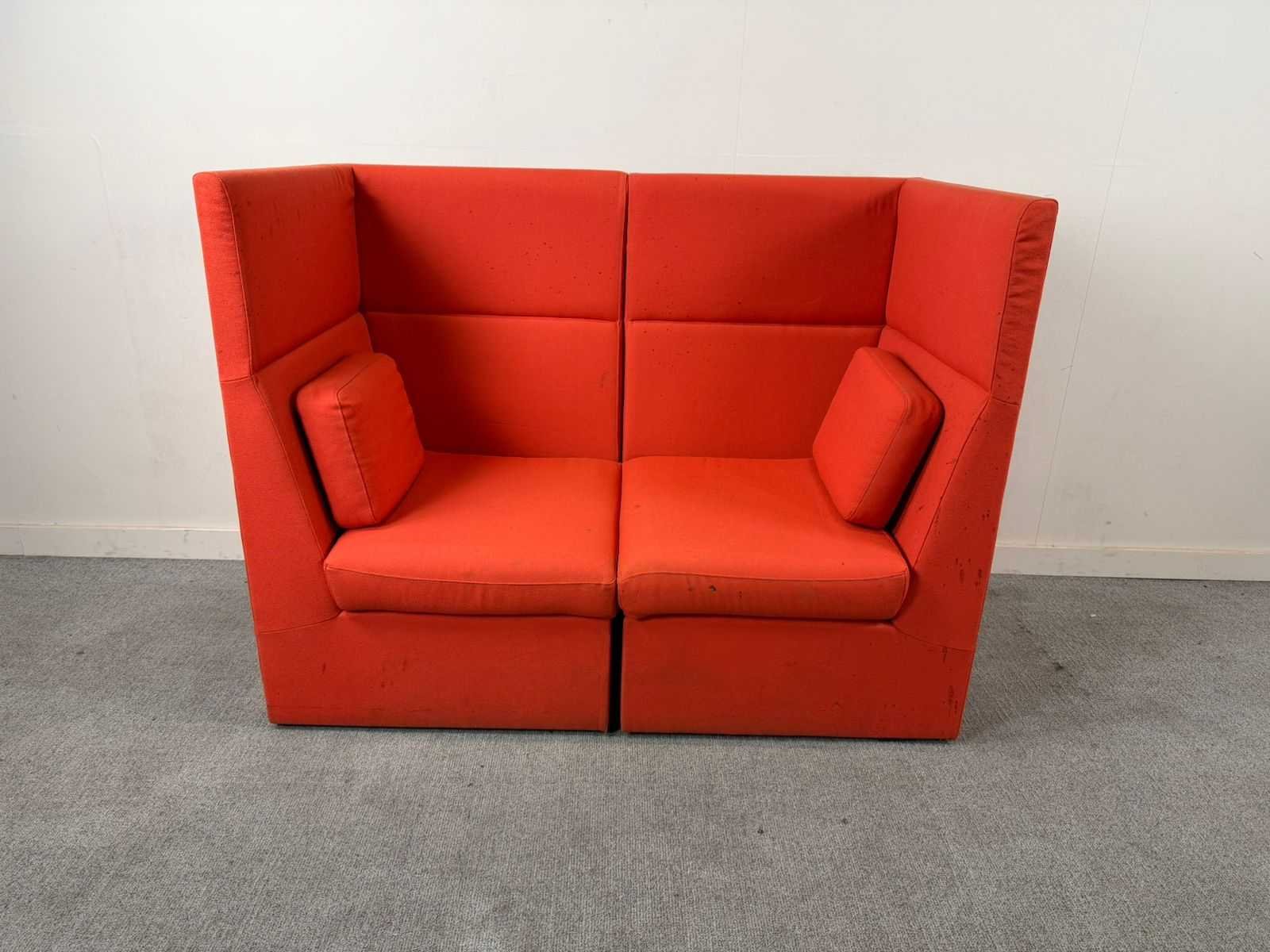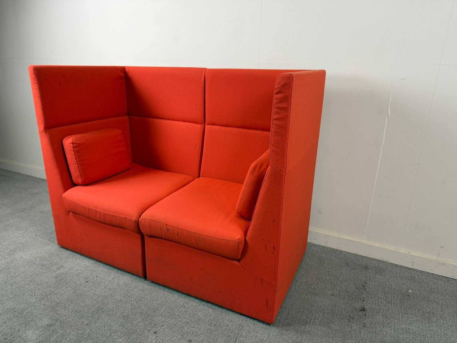 Akoestische zitbank / high-back sofa (Boss Design), uitgevoerd in rode/oranje stoffering. Compacte tweezitsopstelling met hoge zij- en rugpanelen voor extra privacy en geluidsdemping. Inclusief losse rugkussens. Ideaal voor overleg-, lounge- of concentratiezones in kantooromgevingen. Gebruikte staat met zichtbare gebruikssporen op de stoffering. Nee Merk: BOSS Type: zitbank Kleur: rood/oranje Lengte: 147cm Breedte: 73cm Hoogte: 115cm Materiaal: textiel