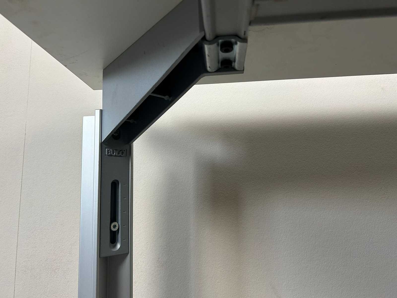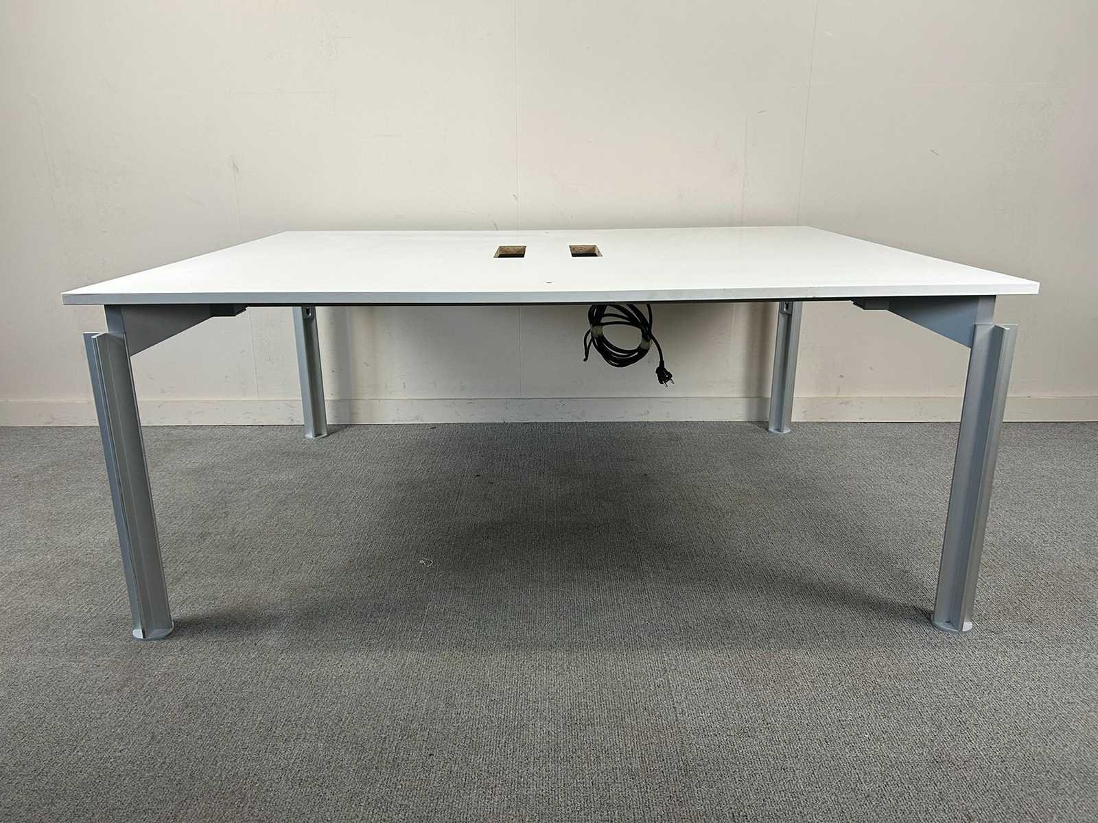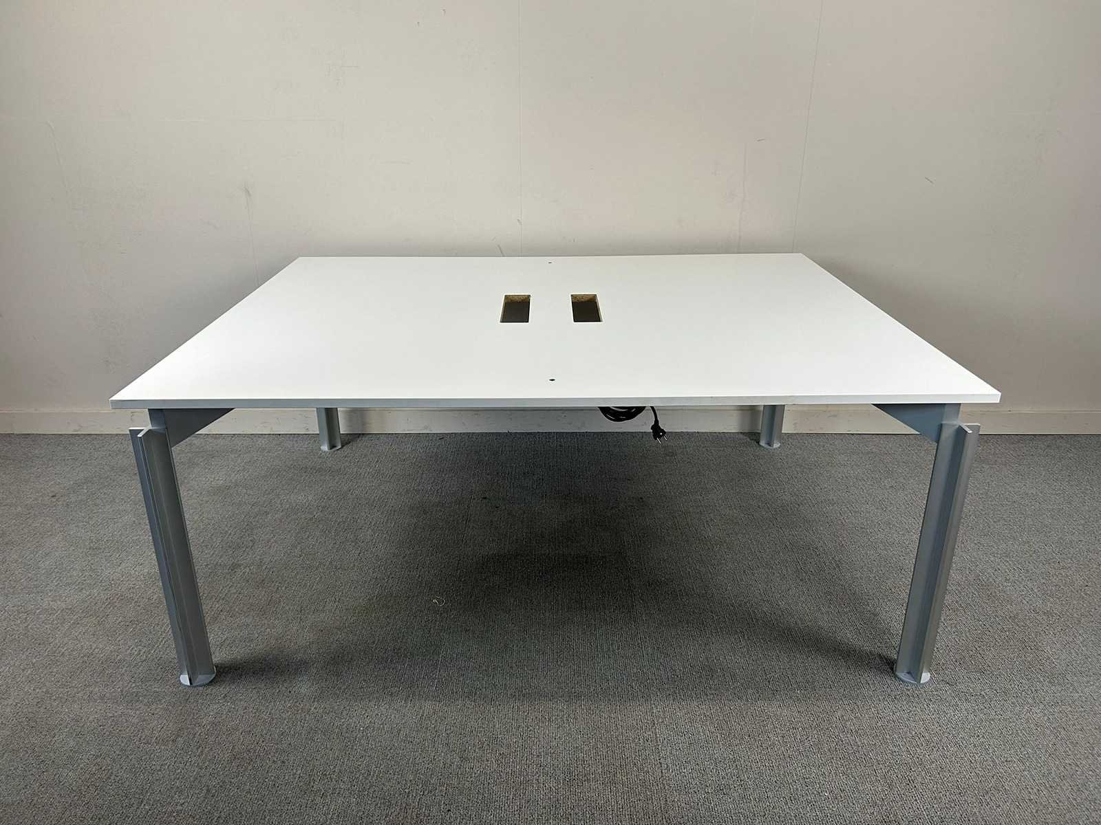 Bulo 2p-workbench met een wit melamine tafelblad en vierpoots metalen onderstel, handmatig verstelbaar, komt met 2 kabeldoorvoergaten. Met gebruikssporen Nee Merk: BULO Product type: 2p-Workbench Kleur: Wit Gewicht: 50kg Lengte: 140cm Breedte: 180cm Hoogte: 65-78cm Materiaal: Melamine