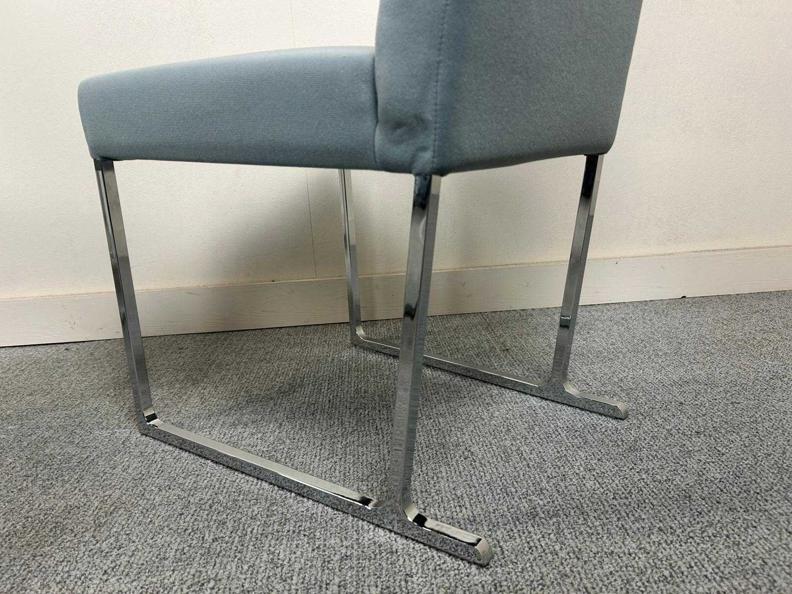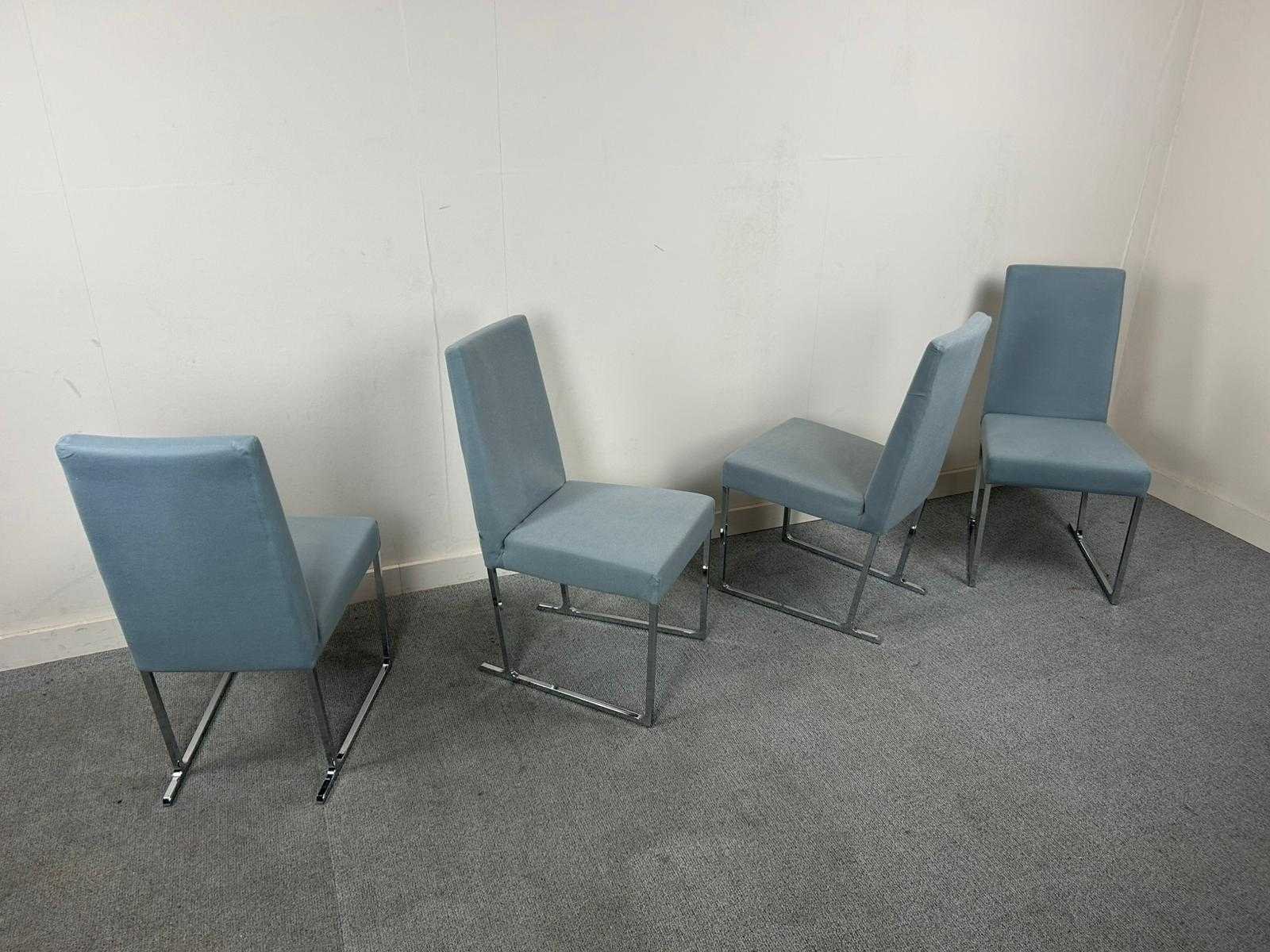 Set van 4 grijsblauw gestoffeerde ontvangststoelen op verchroomde sledepoot. Met gebruikssporen, staat kan variëren per item in de set. Nee Type: Ontvangststoel Kleur: Grijsblauw Gewicht: 60kg Materiaal: Stof