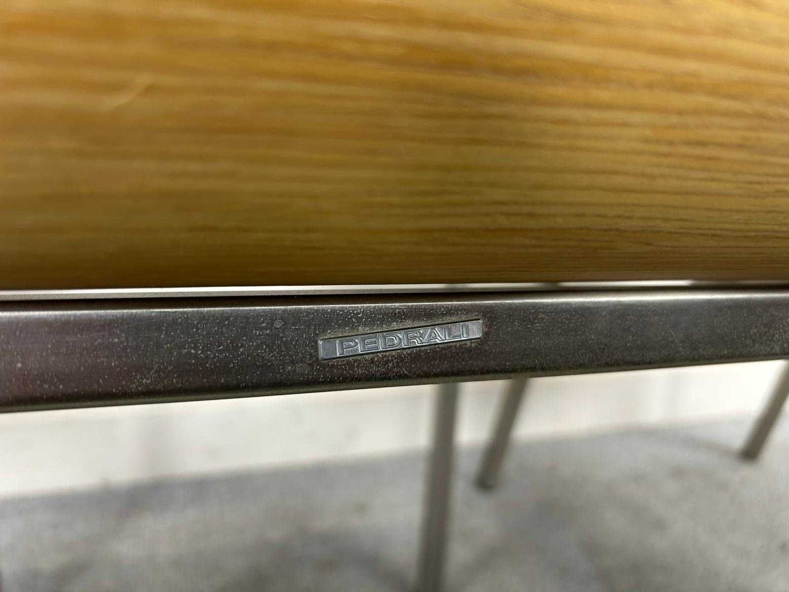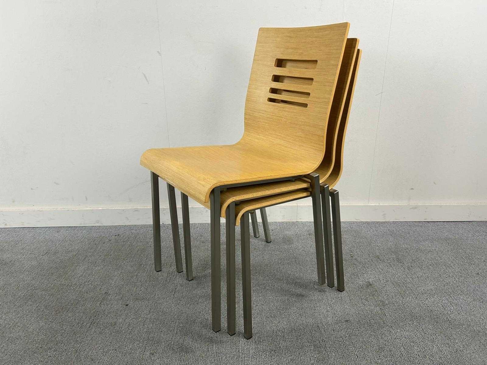 Set van 3 Pedrali houten stapelbare kantinestoelen op metalen vierpoot. Met gebruikssporen, staat kan variëren per item. Nee Merk: PEDRALI Stapelbaar: true Kleur: Hout Gewicht: 40kg Materiaal: Hout
