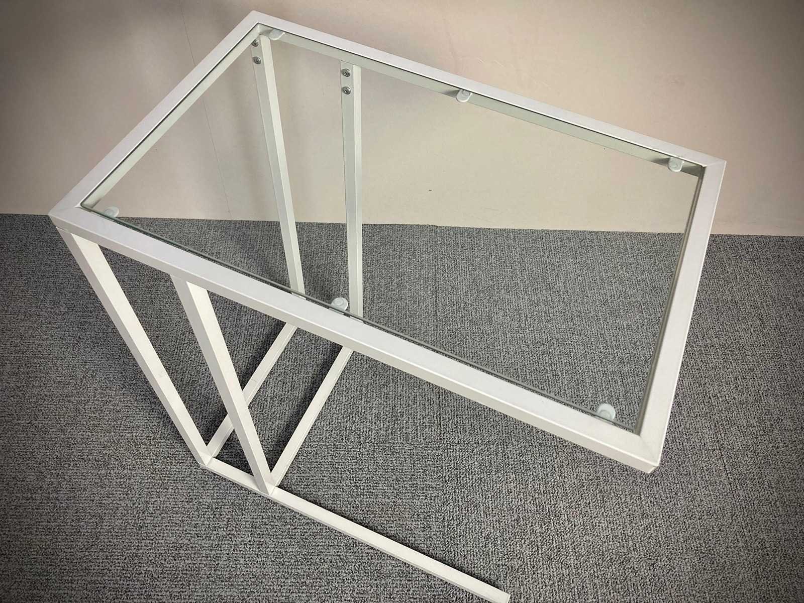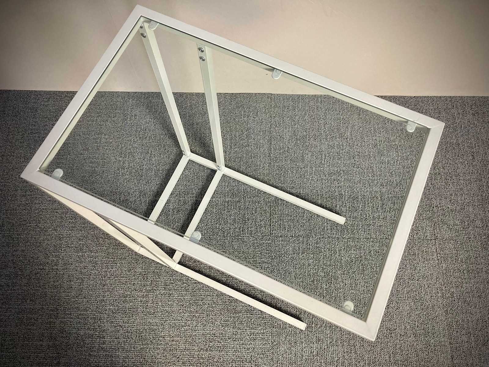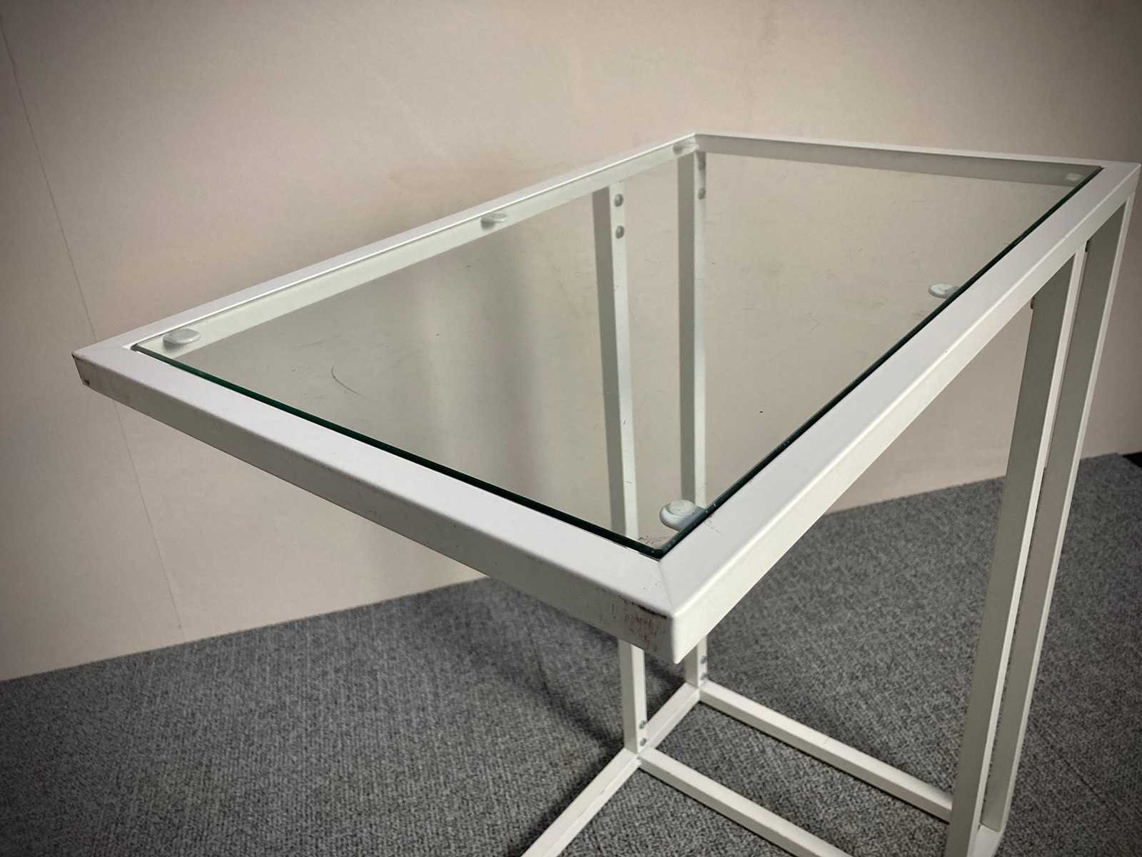 Kleine witte bijzettafeltj met glazen top, met gebruiksporen Nee Model: bijzettafel Kleur: Wit Materiaal: Metaal / Glas