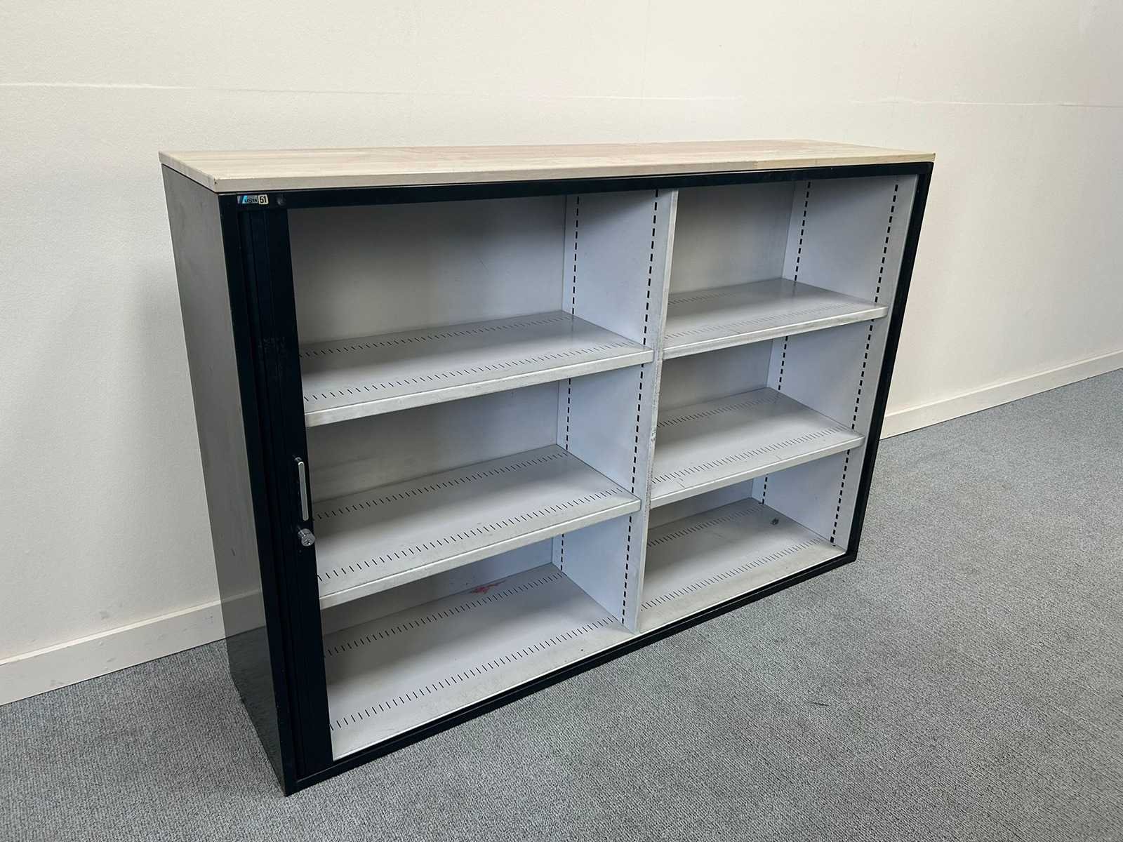Dossierkast zwart, met schuifdeur, 2 x 2 leggers, met gebruiksporen, sleutel niet gegarandeerd Nee Merk: LISTA Kleur: zwart Breedte: 160cm Hoogte: 110cm Materiaal: metaal Diepte: 40cm