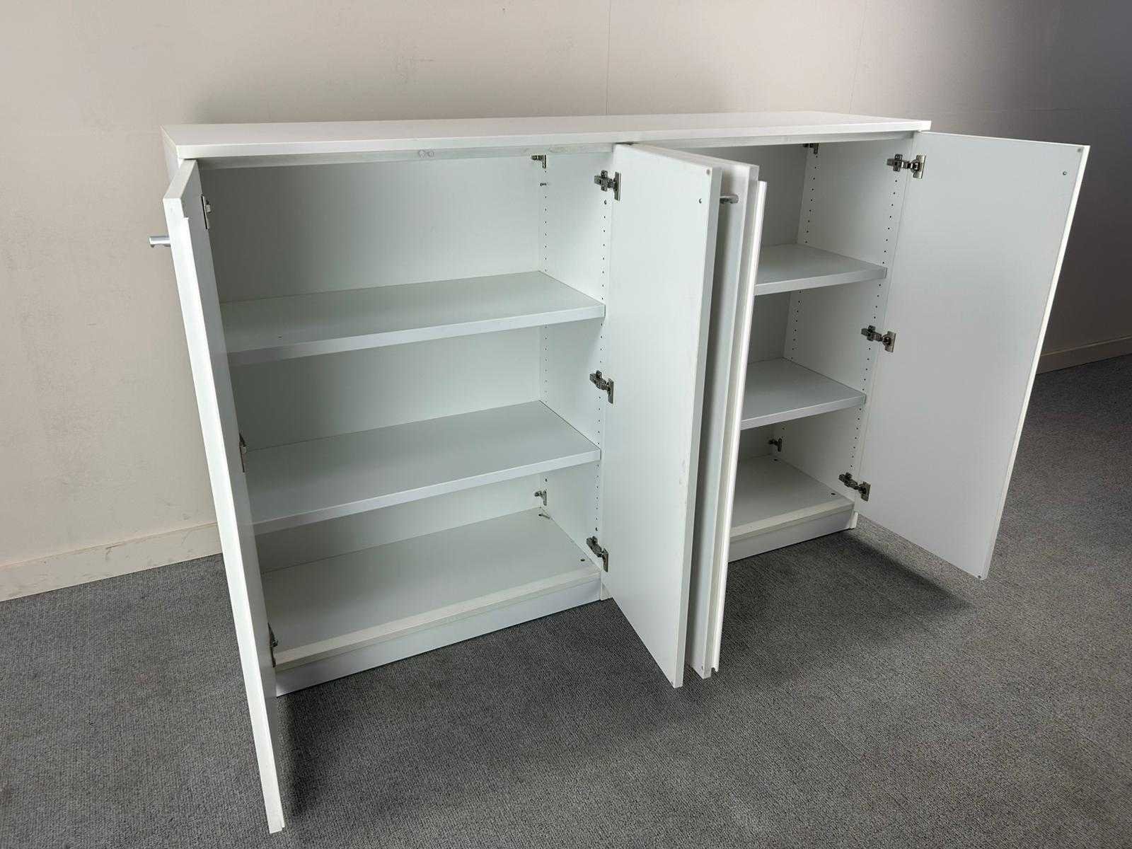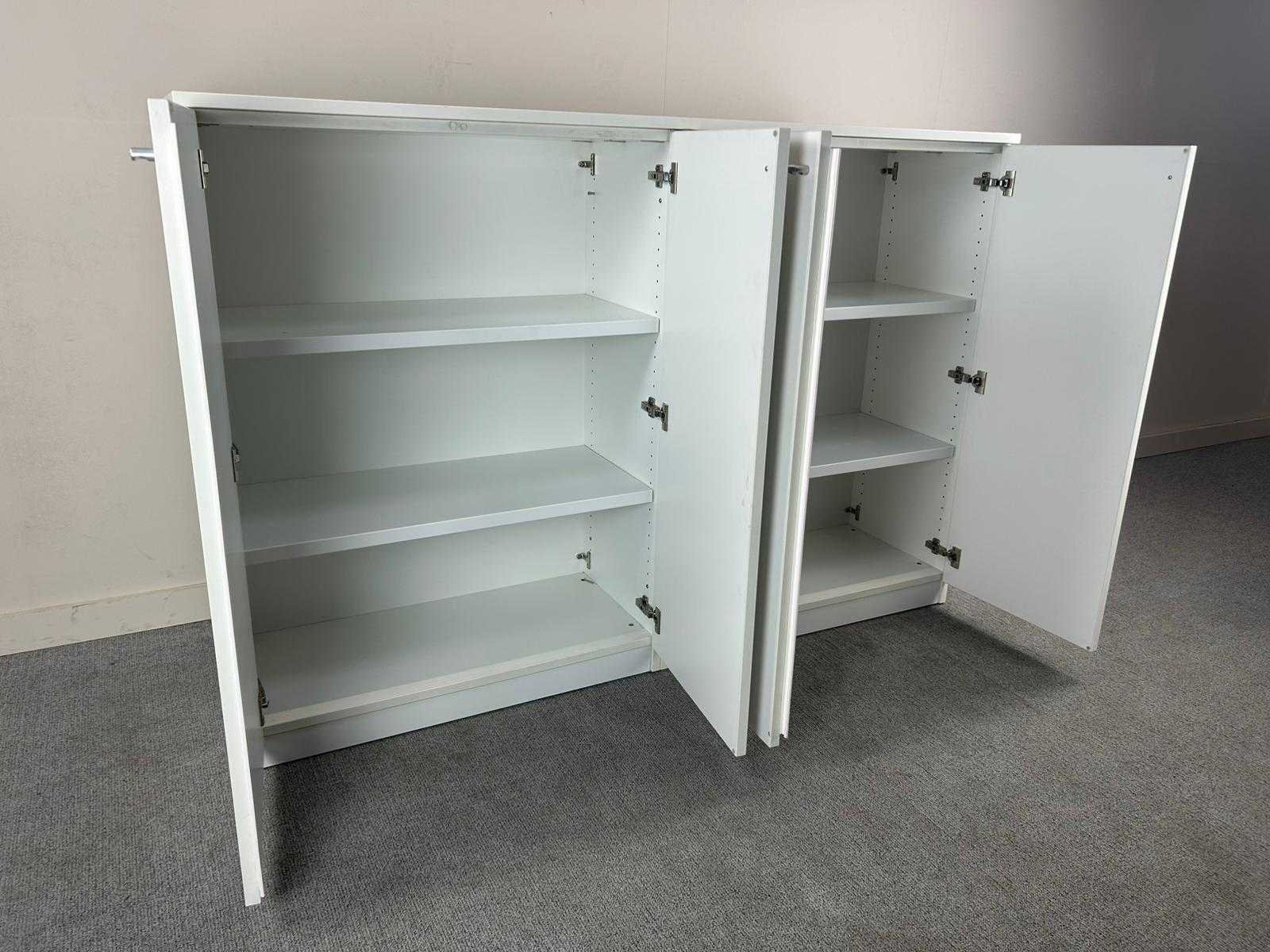 Strakke witte dubbele opbergkasten met een moderne, minimalistische uitstraling. De kasten zijn ideaal voor kantoor, archiefruimte of thuisgebruik. Nee Type: Dubbele Draaideurkast Kleur: wit Gewicht: 40kg Breedte: 182cm Hoogte: 124cm Materiaal: melamine Diepte: 49cm